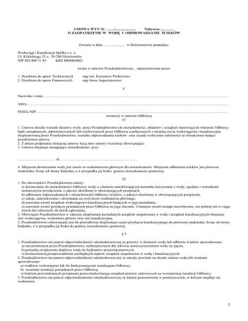 UMOWA WYN Nr ……./...................... Nabywca………… O ZAOPATRZENIE W WODĘ I ODPROWADZANIE ŚCIEKÓW Zawarta w dniu …………..…. w Dzierżoniowie pomiędzy: Wodociągi i Kanalizacja Spółka z o. o. Ul. Kilińskiego 25 a, 58-200 Dzierżoniów NIP 882 000 31 83 KRS 0000064082 zwane w umowie Przedsiębiorstwem , reprezentowane przez: 1. Dyrektora do spraw Technicznych 2. Dyrektora do spraw Finansowych mgr inż. Kazimierz Pietkiewicz mgr Irena Augustynowicz a: Nazwisko i imię:.………………………………………...………………………………………………………………………………………. Adres..……………………………………………………………………………………………………………………………………………. PESEL/NIP………………………..…………………………………………………………………………………………………………….. zwany(a) w umowie Odbiorcą §1 1. Umowa określa warunki dostawy wody przez Przedsiębiorstwo do nieruchomości, obiektów i urządzeń stanowiących własność Odbiorcy bądź zarządzanych, administrowanych lub użytkowanych przez Odbiorcę a połączonych z miejską siecią wodociągową i kanalizacyjną eksploatowaną przez Przedsiębiorstwo, warunki odprowadzania ścieków oraz zasady rozliczenia należności za świadczenia będące przedmiotem umowy. 2. Z dniem podpisania niniejszej umowy tracą moc umowy wcześniej obowiązujące. 3. Umowa obejmuje następujące nieruchomości przy: ………………………… ul……………………………………………………… 4. Miejscem dostarczania wody jest zawór za wodomierzem głównym dla nieruchomości. Miejscem odbierania ścieków jest pierwsza studzienka, licząc od strony budynku, a w przypadku jej braku granica nieruchomości gruntowej. §2 1. Do obowiązków Przedsiębiorstwa należy: a) dostarczanie do nieruchomości Odbiorcy wody o ciśnieniu umożliwiającym normalne korzystanie z wody, zgodnie z warunkami technicznymi przyłączenia, o jakości określonej w obowiązujących przepisach, b) odbieranie odprowadzanych z nieruchomości Odbiorcy ścieków, o jakości określonej w obowiązujących przepisach, c) zakup, zainstalowanie i utrzymanie na swój koszt wodomierza głównego, d) usuwanie awarii urządzeń wodociągowo-kanalizacyjnych będących w jego posiadaniu, e) usuwanie awarii przyłączy posiadanych przez Odbiorcę na jego zlecenie. Usunięcie awarii nastąpi niezwłocznie, nie później niż w ciągu trzech dni roboczych od chwili zgłoszenia, 2. Obowiązek Przedsiębiorstwa w zakresie eksploatacji posiadanych urządzeń zaopatrzenia w wodę i urządzeń kanalizacyjnych obejmuje sieć wodociągową, wodomierz główny oraz sieć kanalizacyjną. 3. Przedsiębiorstwo zobowiązane jest do prawidłowej eksploatacji części przyłącza kanalizacyjnego do pierwszej studzienki, licząc od strony budynku, a w przypadku jej braku do granicy nieruchomości gruntowej. §3 1. Przedsiębiorstwo nie ponosi odpowiedzialności odszkodowawczej za przerwy w dostawie wody lub odbiorze ścieków spowodowane: a) niezawinionym przez Przedsiębiorstwo, niebezpiecznym dla zdrowia zanieczyszczeniem wody na ujęciu, b) potrzebą zwiększenia dopływu wody do hydrantów przeciwpożarowych, c) koniecznością przeprowadzenia niezbędnych napraw urządzeń zaopatrzenia w wodę i kanalizacyjnych. 2. Przedsiębiorstwo nie ponosi odpowiedzialności odszkodowawczej za szkody powstałe na skutek zalania wodą lub ściekami spowodowane: a) wadliwie wykonanymi lub źle funkcjonującymi instalacjami Odbiorcy, b) awariami instalacji posiadanych przez Odbiorcę, c) brakiem przewidzianych przepisami prawa budowlanego urządzeń przeciw zalewowych na wewnętrznej instalacji Odbiorcy. 3. Przedsiębiorstwo nie ponosi odpowiedzialności odszkodowawczej za mienie pozostawione w pomieszczeniu, w którym znajduje się wodomierz. 1 §4 1. O przerwach w dostawie wody wynikających z planowanych prac konserwacyjno-remontowych Przedsiębiorstwo powiadomi Odbiorcę w sposób zwyczajowo przyjęty najpóźniej na 7 dni przed jej terminem. 2. W razie przerwy w dostawie wody przekraczającej 12 godzin Przedsiębiorstwo zapewni Odbiorcy zastępczy punkt poboru wody i poinformuje o jego lokalizacji. §5 Odbiorca oświadcza, że woda zużywana będzie na cele socjalno-bytowe i zobowiązuje się do: a) utrzymania właściwego stanu technicznego i zapewnienia niezawodnego działania posiadanych przez niego przyłącza wodociągowego, przyłącza kanalizacyjnego i urządzenia pomiarowego ( ściekomierza ), b) użytkowania instalacji wodociągowej w sposób eliminujący możliwość wystąpienia skażenia chemicznego lub bakteriologicznego wody w sieci wodociągowej poprzez zainstalowania zaworu antyskażeniowego zabezpieczającego przed cofnięciem się wody z instalacji wodociągowej, c) użytkowania instalacji kanalizacyjnej w sposób nie powodujący zakłóceń w funkcjonowaniu sieci kanalizacyjnej, d) nie wykonywania jakichkolwiek czynności mogących wpłynąć na zmianę, zatrzymanie lub utratę własności lub funkcji metrologicznych należącego do Przedsiębiorstwa wodomierza głównego oraz zainstalowanych dodatkowych urządzeń sygnalizujących. O rodzaju zainstalowanych dodatkowych urządzeń sygnalizujących Odbiorca zostanie poinformowany podczas montażu wodomierza, e) wydzielenia i utrzymania w należytym stanie pomieszczenia na zainstalowanie wodomierza głównego. Pomieszczenie to musi zabezpieczać wodomierz przed uszkodzeniami mechanicznymi, skutkami niskich temperatur oraz zaborem, f) udostępnienia pracownikom Przedsiębiorstwa swobodnego dostępu do pomieszczenia wodomierza celem dokonania jego odczytu, g) nie dokonywania zabudowy ani trwałych nasadzeń nad przyłączami wodociągowymi i kanalizacyjnymi w pasie ochronnym o szerokości 3m, h) zapewnienia Przedsiębiorstwu mo