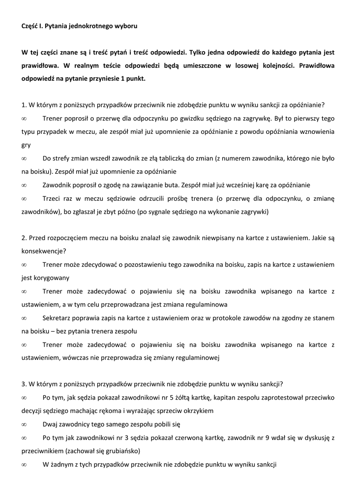 Część I. Pytania jednokrotnego wyboru W tej części znane są i treść pytań i treść odpowiedzi. Tylko jedna odpowiedź do każdego pytania jest prawidłowa. W realnym teście odpowiedzi będą umieszczone w losowej kolejności. Prawidłowa odpowiedź na pytanie przyniesie 1 punkt. 1. W którym z poniższych przypadków przeciwnik nie zdobędzie punktu w wyniku sankcji za opóźnianie? • Trener poprosił o przerwę dla odpoczynku po gwizdku sędziego na zagrywkę. Był to pierwszy tego typu przypadek w meczu, ale zespół miał już upomnienie za opóźnianie z powodu opóźniania wznowienia gry • Do strefy zmian wszedł zawodnik ze złą tabliczką do zmian (z numerem zawodnika, którego nie było na boisku). Zespół miał już upomnienie za opóźnianie • Zawodnik poprosił o zgodę na zawiązanie buta. Zespół miał już wcześniej karę za opóźnianie • Trzeci raz w meczu sędziowie odrzucili prośbę trenera (o przerwę dla odpoczynku, o zmianę zawodników), bo zgłaszał je zbyt późno (po sygnale sędziego na wykonanie zagrywki) 2. Przed rozpoczęciem meczu na boisku znalazł się zawodnik niewpisany na kartce z ustawieniem. Jakie są konsekwencje? • Trener może zdecydować o pozostawieniu tego zawodnika na boisku, zapis na kartce z ustawieniem jest korygowany • Trener może zadecydować o pojawieniu się na boisku zawodnika wpisanego na kartce z ustawieniem, a w tym celu przeprowadzana jest zmiana regulaminowa • Sekretarz poprawia zapis na kartce z ustawieniem oraz w protokole zawodów na zgodny ze stanem na boisku – bez pytania trenera zespołu • Trener może zadecydować o pojawieniu się na boisku zawodnika wpisanego na kartce z ustawieniem, wówczas nie przeprowadza się zmiany regulaminowej 3. W którym z poniższych przypadków przeciwnik nie zdobędzie punktu w wyniku sankcji? • Po tym, jak sędzia pokazał zawodnikowi nr 5 żółtą kartkę, kapitan zespołu zaprotestował przeciwko decyzji sędziego machając rękoma i wyrażając sprzeciw okrzykiem • Dwaj zawodnicy tego samego zespołu pobili się • Po tym jak zawodnikowi nr 3 sędzia pokazał czerwoną kartkę, zawodnik nr 9 wdał się w dyskusję z przeciwnikiem (zachował się grubiańsko) • W żadnym z tych przypadków przeciwnik nie zdobędzie punktu w wyniku sankcji 4. Przeciwnik wygrał losowanie i wskazał stronę boiska, na której chce rozpocząć mecz. Co może wybrać w tym momencie kapitan drugiego zespołu? • Że jego zespół rozpocznie mecz od odbioru zagrywki • Stronę boiska, na której jego zespół rozpocznie seta decydującego (piątego) • Że jego zespół rozpocznie seta decydującego (piątego) od wykonania zagrywki • Nie może wybrać żadnej z powyższych opcji 5. Które z poniższych stwierdzeń nie jest prawdziwe w kontekście przepisów dotyczących zawodników Libero? • Zespół miał jednego Libero, który doznał kontuzji. Trener redesygnował do roli Libero nowego zawodnika. Jeżeli i on będzie kontuzjowany, to trener może redesygnować kolejnego zawodnika jako nowego Libero • Libero może rozegrać palcami sposobem górnym i piłka z tego rozegrania może być atakowana powyżej górnej taśmy siatki, jeżeli w momencie odbicia od płaszczyzny boiska Libero był w strefie obrony • Trener nie jest zadowolony z gry Libero. Ma wówczas prawo zgłosić go jako niezdolnego do gry i wyznaczyć innego zawodnika do roli Libero • Jeżeli w zespole jest dwóch Libero, nie mogą oni mieć koszulek w różnych kolorach (każda z nich odróżniająca Libero od „zwykłych” zawodników) 6. Który z poniższych przypadków jest przykładem prośby nieuzasadnionej nieskutkującej sankcjami dla zespołu? • Trener poprosił o trzecią przerwę dla odpoczynku w secie i została ona przyznana. Po dłuższej chwili zespołom kazano powrócić na boisko • Kapitan zespołu poprosił o przerwę dla odpoczynku, chociaż trener siedział na ławce rezerwowych • Drugi raz w meczu trener poprosił o przerwę dla odpoczynku po gwizdku sędziego I na zagrywkę • Zespół poprosił o zmianę zawodnika, przy czym na boisko miał wejść zawodnik niewpisany do protokołu zawodów. 7. Podstawowy rozgrywający zespołu został zmieniony przez drugiego rozgrywającego. Następnie miała miejsce zmiana powrotna, która był szóstą zmianą w tym zespole w tym secie. Chwilę później zawodnik rozgrywający doznał kontuzji. Libero zespołu przebywał w tym momencie na ławce. Jakie pole manewru ma trener zespołu? • Nie ma żadnego pola manewru, bo wykorzystał sześć zmian i w tym zmianę rozgrywającego. Kontuzjowanemu zostanie przyznana 3-minutwa przerwa i jeśli po tym czasie zawodnik nie będzie mógł grać, to zespół przegra seta jako zdekompletowany • Trener może dokonać zmiany kontuzjowanego z dowolnym zawodnikiem nieprzebywającym na boisku w momencie kontuzji z wyjątkiem Libero • Trener może dokonać zmiany kontuzjowanego z dowolnym zawodnikiem nieprzebywającym na boisku w momencie kontuzji z wyjątkiem Libero oraz drugiego rozgrywającego • Trener może dokonać zmiany kontuzjowanego tylko z drugim rozgrywającym 8. Zawodnik rozgrywający, będący w tym momencie zawodnikiem linii obrony, po złym przyjęciu zagrywki w swoim zespole – piłka poleciała nad siatkę, gdzie została zaatakowana przez przeciwnika – stanął na drugim metrze od siatki i podniósł w górę ręce, sięgając wyżej niż siatka. Piłka uderzyła go w dłonie. Które z poniższych zdań jest prawdziwe? • Rozgrywający popełnił błąd bloku zawodnika linii obrony • Rozgrywający nie może teraz odbić piłki, zanim nie zrobi tego któryś z jego partnerów • Zespół ma prawo do jeszcze trzech odbić piłki • Wszystkie odpowiedzi są prawidłowe 9. Jakie zachowanie zespołu wskazuje na możliwość popełniania błędu zasłony? • Trener instruuje zawodników, by zasłonili zagrywającego i lot piłki • Zawodnicy zespołu zagrywające