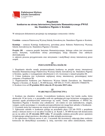 Regulamin konkursu na stronę internetową Instytutu Humanistycznego PWSZ im. Stanisława Pigonia w Krośnie W niniejszym dokumencie przyjmuje się następujące oznaczenia i skróty: Uczelnia - oznacza Państwową Wyższą Szkołę Zawodową im. Stanisława Pigonia w Krośnie. Komisja - oznacza Komisję konkursową, powołaną przez Rektora Państwowej Wyższej Szkoły Zawodowej im. Stanisława Pigonia w Krośnie. Projekt IH - oznacza projekt Instytutu Humanistycznego, którego celem jest stworzenie strony Instytutu, wydzielenie strony prezentującej misję Instytutu oraz zdobycie doświadczenia w zakresie procesu przygotowania oraz utrzymania i modyfikacji strony internetowej przez zespół. §1 POSTANOWIENIA OGÓLNE 1. Regulamin określa zasady przeprowadzania konkursu na projekt strony internetowej Instytutu Humanistycznego Państwowej Wyższej Szkoły Zawodowej im. Stanisława Pigonia w Krośnie, zgodny z wymaganiami określonymi w §3, tworzonej w ramach projektu IH. 2. Celem konkursu jest wyłonienie najlepszej strony internetowej, prezentującej treści związane z Projektem IH. 3. Organizatorem konkursu jest Państwowa Wyższa Szkoła Zawodowa im. Stanisława Pigonia w Krośnie, ul. Rynek 1, 38-400 Krosno, NIP 684-21-75-051, REGON 370468370. 4. Konkurs trwa od 29 grudnia 2014 roku do 25 stycznia 2015 roku. §2 WARUNKI UCZESTNICTWA 1. Konkurs ma charakter otwarty. Uczestnikiem konkursu może być każda osoba, która ukończyła 18 lat życia, a w przypadku osób nie spełniających tego kryterium wymagana jest pisemna zgoda przedstawiciela ustawowego tej osoby. Osoby zatrudnione w PWSZ im. Stanisława Pigonia w Krośnie oraz członkowie ich rodzin (w tym małżonkowie, zstępni, wstępni, osoby pozostające w stosunku przysposobienia) nie mogą brać udziału w Konkursie. 2. Uczestnik może być autorem nie więcej niż dwóch projektów strony. 3. Zgłoszenie udziału w konkursie polega na przesłaniu płyty CD lub DVD z projektem strony o którym mowa w §1 na adres Uczelni tj. ul. Rynek 1, 38-400 Krosno lub dostarczeniu jej na tej adres do 25 stycznia 2015 roku. W przypadku nadania przesyłki przez operatora świadczącego usługi pocztowe, decyduje się data stempla pocztowego. 4. Do zgłoszenia o którym mowa w ust. 3 uczestnik lub uczestniczy załączają dane osobowe konieczne do identyfikacji uczestnika tj. imię, nazwisko oraz adres zamieszkania, telefon kontaktowy, ewentualny adres mailowy. W przypadku osoby niepełnoletniej wymagana jest także pisemna zgoda jej przedstawiciela ustawowego. 5. Prace konkursowe, które nie spełniają wymagań określonych w regulaminie oraz dostarczone lub przesłane po upływie terminu określonego w ust. 3, nie będą podlegały ocenie. 6. Koszty wysyłki oraz nośników projektów pokrywają Uczestnicy. 7. Przesłane i doręczone projekty nie podlegają zwrotowi. §3 WYMAGANIA PROJEKTU 1. Projekt graficzny strony internetowej Uczelni powinien obejmować następującą strukturę: a) aktualności z instytutu humanistycznego, b) wydarzenia z instytutu humanistycznego (jak planowana Noc Nauki, konferencje naukowe, konkursy), c) zagadnienia związane z funkcjonowaniem instytutu humanistycznego w tym misję, historię, zakłady, konferencję i publikacje, absolwentów, infrastrukturę, programy, współpracę, pracowników, osiągnięcia i nagrody), d) studentów (w tym koła naukowe, studenci zagraniczni, studia zagranica, praktyki, grafiki zajęć, Hall of Fame), e) kandydatów ( wymagania, opinie), f) zasoby (odnośniki, wideo-kursy, biblioteka, e - booki) 2. Projekt powinien być przygotowany pojedynczo lub grupowo specjalnie na potrzeby konkursu. Autor lub autorzy projektu przekazują prace własnego autorstwa, wcześniej nie publikowane, o charakterze unikatowym. §4 ZASADY PRZYZNAWANIA NAGRÓD 1. Prace przesłane lub dostarczone w terminie określonym w §2 ust 3 ocenia Komisja konkursową w skład której wchodzą trzy osoby, będące pracownikami Organizatora. 2. Ocenie przez Komisję podlega: a) estetyka wykonania projektu, b) zawartość merytoryczna projektu, c) spełnienie wymagań technicznych, d) łatwość obsługi strony e) zastosowanie innowacyjnych rozwiązań technicznych. 3. Za projekt oceniony najwyżej Komisja przyzna jedną nagrodę pieniężna w wysokości 2 000 zł (słownie dwa tysiące złotych) z zastrzeżeniem ust 4 i 5 poniżej. Decyzja Komisji jest ostateczna i nie przysługuje od niej odwołanie. 4. W przypadku, gdy autorem, projektu jest więcej niż jedna osoba, nagroda podlega równemu podziałowi na wszystkich wskazanych w zgłoszeniu twórców. 5. W przypadku gdy wysokość kwoty nagrody dla osoby lub osób nagrodzonych przekroczy kwotę 760 zł, od kwoty określonej ust 3 Organizator Konkursu na podstawie art. 21 ust. 1 pkt 68 ustawy o podatku dochodowych od osób fizycznych (Dz. U. 2012 poz.,361 z późn.zm.) pobiera podatek dochodowy w wysokości 10 % wygranej. 6. Ogłoszenie o wynikach konkursu oraz zwycięzcy lub zwycięzcy podlega publikacji na stronie internetowej uczelni. 7. Po zakończeniu konkursu zwycięzca lub zwycięzcy, niezależnie od nagrody określonej w może otrzymać propozycję dalszej współpracy w ramach projektu IH. Szczegóły współpracy określi odrębna umowa zawarta między zwycięzcą a organizatorem. §5 POSTANOWIENIA KOŃCOWE 1. Przystąpienie do udziału w konkursie jest równoznaczne z akceptacją regulaminu oraz wyrażeniem zgody na przetwarzanie przez Organizatora danych osobowych uczestników zgodnie z ustawą z dnia 29 sierpnia 1997 r. o ochronie danych osobowych (Dz. U. Nr 133, poz. 833 z późn. zm.), do celów związanych z rozstrzygnięciem konkursu oraz wskazaniem zwycięzcy. 2. W przypadku nie dostarczenia żadnego projektu, lub żadnego projektu nie spełniającego wymagań określonych w niniejszym regulaminie, albo nie dokonania przez Komisję wyboru najlepszej pracy, Organizator zastrzega możliwość odstąpienia od konkursu, co wiąże się z nie pr