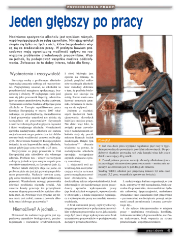 PSYCHOLOGIA PRACY Jeden g∏´bszy po pracy Nadmierne spo˝ywanie alkoholu jest wynikiem ró˝nych, wspó∏wyst´pujàcych ze sobà czynników. Niniejszy artyku∏ skupia si´ tylko na tych z nich, które bezpoÊrednio wià˝à si´ ze Êrodowiskiem pracy. W praktyce bowiem pracodawcy majà ograniczonà mo˝liwoÊç wp∏ywu na rozwiàzanie problemów alkoholowych pracowników. Wa˝ne jednak, by podejmowaç wszystkie mo˝liwe oddzia∏ywania. Zw∏aszcza ˝e to dobry interes, tak˝e dla firmy. Wyobra˝enia i rzeczywistoÊç Stereotyp osoby z problemem alkoholowym wcià˝ znacznie odbiega od rzeczywistoÊci. PrzywykliÊmy uwa˝aç, ˝e alkoholik to przedstawiciel marginesu spo∏ecznego, bezrobotny i obdarty. W najlepszym razie jawi nam si´ jako pracownik fizyczny, odwiedzajàcy po pracy przys∏owiowà budk´ z piwem. Tymczasem ostatnie badanie dotyczàce picia alkoholu w Europie opublikowane przez Komisj´ Europejskà w marcu 2007 roku1 wskazuje, ˝e przedsi´biorcy, menad˝erowie i inni pracownicy umys∏owi nie ró˝nià si´ szczególnie od pracowników fizycznych i osób bezrobotnych pod wzgl´dem cz´stoÊci i iloÊci wypijanego alkoholu. Niezale˝noÊç zjawiska nadu˝ywania alkoholu od statusu socjoekonomicznego potwierdza te˝ deklarowany brak wra˝liwoÊci cenowej osób pijàcych. Dwie trzecie badanych Europejczyków twierdzi, ˝e nie kupowa∏oby mniej alkoholu, nawet gdyby jego cena wzros∏a o 25 proc. Statystycznie co piàty pracownik w Unii Europejskiej pije szkodliwie dla w∏asnego zdrowia. Problem ten – wbrew stereotypom – dotyczy jednak w tym samym stopniu pracowników umys∏owych, co fizycznych (tab. 1). Wobec takich statystyk staje si´ jasne, ˝e problem picia nie jest ju˝ prywatnym problemem pracownika. Nadesz∏y bowiem czasy, gdy coraz trudniej znaleêç wykwalifikowany personel. Wyszkolenie nowego pracownika równie˝ poch∏ania niema∏e Êrodki. Ale znaczne koszty generuje te˝ przymykanie oczu na k∏opoty pracowników z piciem alkoholu (tab. 2). Powstaje wi´c pytanie: czy firma mo˝e coÊ zrobiç, zanim z powodu alkoholu straci dobrego pracownika? Niemo˝liwe? A jednak… Sk∏onnoÊç do nadmiernego picia jest wypadkowà czynników biologicznych, psychologicznych i warunków Êrodowiskowych. I choç biologia jest oporna na zmian´, to jednak przyk∏ad milionów trzeêwych alkoholików Êwiadczy dobitnie o tym, ˝e pod∏o˝e biologiczne nie skazuje na na∏óg. Zatem warto analizowaç pozosta∏e czynniki, zw∏aszcza ˝e mo˝emy na nie wp∏ywaç. Jednym z wa˝niejszych Êrodowisk funkcjonowania doros∏ych ludzi jest miejsce pracy. Nie dziwi wi´c fakt, ˝e zwiàzki pracy zawodowej z nadu˝ywaniem alkoholu sta∏y si´ przedmiotem licznych badaƒ Pami´taj! naukowych. Dzi´ki tym 3-10 badaniom obecnie Ju˝ dwa du˝e piwa wypijane regularnie pi´ç razy w tygowiadomo na pewno, ˝e dniu prowadzà do powa˝nych powik∏aƒ zdrowotnych. Do ponadu˝ywaniu alkoholu dobnych skutków prowadzà te˝ dwie lampki wina lub jeden sprzyjajà nast´pujàce drink zawierajàcy 40 g wódki. czynniki zwiàzane z pra Ponad po∏owa procesu rozwoju choroby alkoholowej mocà zawodowà: ˝e przebiegaç niezauwa˝ona przez otoczenie – mo˝na nie za1. niejasnoÊç roli zauwa˝yç, ˝e cz∏owiek jest w pó∏ drogi do Êmierci. wodowej, tzn. niewystarWed∏ug WHO, alkohol jest przyczynà Êmierci 1,8 mln osób czajàca wiedza na temat rocznie (3,2 proc. wszystkich zgonów na Êwiecie). powierzanych pracownikowi obowiàzków, nie3. nadu˝ywajàca kultura organizacji, w tym dookreÊlony zakres odpowiedzialnoÊci, brak informacji co do oczekiwanego przez praco- m.in. autorytarny styl zarzàdzania, brak szadawc´ sposobu wykonywania pracy cunku dla pracownika, nieuzasadnione ˝àda(np. brak szkoleƒ wst´pnych, wprowadzenia nie ca∏kowitej dyspozycyjnoÊci, nadmierne w obowiàzki), a tak˝e niejasnoÊci wynikajà- obcià˝anie ludzi zadaniami (lub przeciwnie ce z wykonywania pracy na zasadzie samoza- – permanentne niedocià˝enie pracà), niejasnoÊç zasad premiowania i awansu zawodotrudnienia, 2. brak autonomii pracy, czyli wysokie wy- wego itp., 4. z∏e relacje interpersonalne w miejscu magania pracodawcy w po∏àczeniu z niewielkim wp∏ywem pracownika na to, jak zadania pracy – nadmierna rywalizacja, konflikty, majà byç przez niego wykonywane oraz brak izolowanie niektórych pracowników, nierówuczestnictwa pracowników w podejmowaniu ne traktowanie, brak wsparcia ze strony prze∏o˝onych i wspó∏pracowników, decyzji w przedsi´biorstwie, praca i zdrowie 43 PSYCHOLOGIA PRACY Tab. 1 Czy w ciàgu ostatnich 12 miesi´cy pi∏ Pan/Pani jakiekolwiek napoje alkoholowe (piwo, wino, wyroby spirytusowe lub jakikolwiek inny napój zawierajàcy alkohol)? Tak Nie Ârednia dla UE25 75% 25% Przedsi´biorcy 81% 19% Menad˝erowie 88% 12% Inni pracownicy umys∏owi 82% 18% Pracownicy fizyczni 84% 16% Bezrobotni 74% 26% 5. praca pod presjà, w tym zbyt krótkie terminy realizacji zadaƒ lub zbyt du˝o zadaƒ, nadmierna kontrola, nieracjonalne ustalanie planów, np. sprzeda˝y (zbyt wysoki poziom w stosunku do obiektywnych mo˝liwoÊci rynkowych lub obiektywnie zbyt ma∏e Êrodki przeznaczone na realizacj´ celu), 6. zaburzenie równowagi mi´dzy pracà a innymi sferami ˝ycia (konflikt praca˝ycie rodzinne, brak wystarczajàcej iloÊci czasu na odpoczynek), 7. ogólny odczuwany poziom stresu, w tym zwiàzany z odpowiedzialnoÊcià, szczególnie za innych ludzi. Kluczem do zrozumienia przyczyn, dla których warunki pracy wp∏ywajà na nadu˝ywanie alkoholu przez pracowników mo˝e byç analiza motywacji do picia. Pozornie, dla chcàcego ka˝dy powód jest dobry. Jednak znany polski psychiatra Antoni K´piƒski wskutek wieloletniej pracy z osobami nadu˝ywajàcymi alkoholu stwierdzi∏, ˝e powody picia mo˝na sklasyfikowaç i wyró˝ni∏ pi´ç g∏ównych motywów nadu˝ywania alkoholu, mianowicie: Tab. 2 W dniu, w którym pije Pan/Pani piwo, wino lub wyroby spirytus