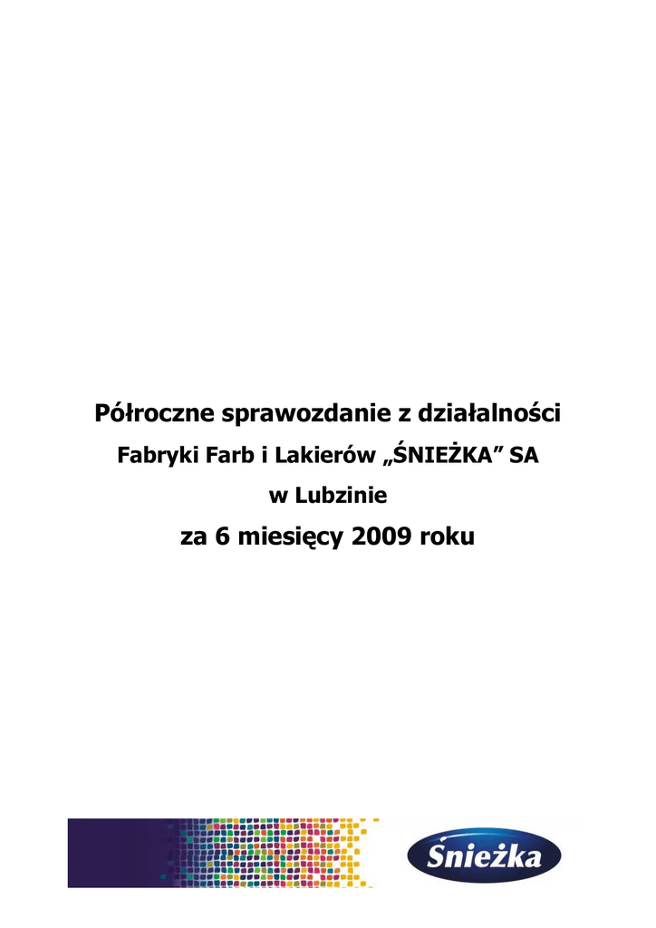 Półroczne sprawozdanie z działalności Fabryki Farb i Lakierów „ŚNIEŻKA” SA w Lubzinie za 6 miesięcy 2009 roku Fabryka Farb i Lakierów Śnieżka w Lubzinie S.A. Sprawozdanie Zarządu za 6 miesięcy 2009 roku 1. Wstęp do Sprawozdania Zarządu za 6 miesięcy 2009 roku Nazwa: Fabryka Farb i Lakierów „Śnieżka” SA Siedziba Zarządu Spółki: 39-102 Lubzina 34 a pow. ropczycko - sędziszowski woj. podkarpackie Rejestracja Spółki: Spółka została wpisana do rejestru przedsiębiorców KRS w dniu 12.11.2001 r. w Sądzie Rejonowym w Rzeszowie, w XII Wydziale Gospodarczym Krajowego Rejestru Sądowego pod numerem KRS 0000060537. Przedmiot działalności Spółki: Produkcja farb, lakierów, rozpuszczalników, klei, szpachli itp. Oddziały: 1. Lubzina 34 a 39-102 Lubzina pow. ropczycko – sędziszowski woj. podkarpackie 2. Brzeźnica 18 39-207 Brzeźnica pow. dębicki woj. podkarpackie 3. Pustków 604 39-205 Pustków pow. dębicki woj. Podkarpackie Kapitał Akcyjny: Na dzień 30 czerwca 2009 r.: 13 850 000 zł - 13 850 000 akcji o wartości nominalnej 1zł. Strona 2 Fabryka Farb i Lakierów Śnieżka w Lubzinie S.A. Sprawozdanie Zarządu za 6 miesięcy 2009 roku W dniu 25 czerwca 2009 r. Walne Zgromadzenie Akcjonariuszy na podstawie art. 359 KSH umorzyło akcje własne na okaziciela serii C i F w łącznej ilości 296 413 sztuk na kwotę 296 413 zł. tj. • 20 000 sztuk akcji serii C na okaziciela, • 276 413 sztuk akcji serii F na okaziciela Umorzenie to było umorzeniem dobrowolnym. Podstawą prawną umorzenia był § 6 ust. 8 Statutu Spółki i art. 359 i 360 k.s.h. Umorzenie nastąpiło poprzez obniżenie kapitału zakładowego na podstawie art. 455 § 1 k.s.h. Umorzenie akcji nastąpiło z czystego zysku. Akcje serii C i F w ilości 296 413 zostały umorzone po cenie 24,85 zł każda. Nadwyżka ponad wartość nominalną akcji serii C i F w wysokości 7 069 450,05 zł została pokryta z kapitału zapasowego. Jednocześnie na podstawie art. 360 KSH oraz podjętej uchwały nr 8/2009 ZWZA z dnia 25-06-2009 roku w sprawie umorzenia akcji własnych Walne Zgromadzenie Akcjonariuszy obniżyło kapitał zakładowy Spółki z dotychczasowej kwoty 13 850 000 zł do kwoty 13 553 587 zł tj. o kwotę 296 413 zł. Fakt obniżenia kapitału zakładowego wynika z nabycia przez Spółkę akcji własnych serii C i F celem ich umorzenia na mocy Uchwały Nr 4/2008 Nadzwyczajnego Walnego Zgromadzenia Akcjonariuszy Fabryki Farb i Lakierów „ŚNIEŻKA”S.A. z siedzibą w Lubzinie podjętej w dniu 17 marca 2008 roku w sprawie wyrażenia zgody dla Zarządu Spółki na nabycie akcji własnych w celu umorzenia. Do dnia opracowania niniejszego sprawozdania sąd rejestrowy nie dokonał rejestracji tych zmian. Jednocześnie Walne Zgromadzenie Akcjonariuszy upoważniło Zarząd Spółki do nabywania akcji własnych przez Spółkę w celu ich umorzenia na warunkach i w trybie ustalonych w uchwale („Skup akcji własnych”) oraz do podjęcia wszelkich czynności niezbędnych do nabycia akcji Spółki. Spółka nabędzie akcje własne na poniższych warunkach: a) łączna liczba nabywanych akcji nie przekroczy 10% wszystkich akcji Spółki tj. 1 355 358 szt. akcji, b) akcje nabywane będą na Giełdzie Papierów Wartościowych w Warszawie oraz poza rynkiem regulowanym, c) wysokość środków przeznaczonych na realizację skupu akcji własnych będzie nie większa niż 53 000 000 zł. Zarząd został upoważniony do realizacji skupu akcji własnych przez okres 18 miesięcy od dnia podjęcia niniejszej uchwały, nie dłużej jednak niż do chwili wyczerpania środków przeznaczonych na realizację skupu akcji własnych. Termin rozpoczęcia i zakończenia nabywania akcji własnych zostanie ustalony przez Zarząd i podany do publicznej wiadomości. Środki przeznaczone na realizację skupu akcji własnych będą pochodzić ze środków własnych Spółki. Każdorazowe nabycie akcji własnych o wartości powyżej 100 000 zł wymaga wyrażenia zgody przez Radę Nadzorczą Spółki przy maksymalnie jednym głosie przeciwnym. Cena, za którą Spółka będzie nabywać akcje własne nie może być wartością wyższą spośród ceny ostatniego niezależnego obrotu i najwyższej bieżącej, niezależnej oferty w transakcjach zawieranych na sesjach giełdowych GPW. Zarząd Spółki, kierując się interesem Spółki, może zakończyć skup akcji własnych przed upływem powyższego terminu lub zrezygnować z przeprowadzania skupu akcji własnych. Strona 3 Fabryka Farb i Lakierów Śnieżka w Lubzinie S.A. Sprawozdanie Zarządu za 6 miesięcy 2009 roku Reprezentacja Spółki: Rada Nadzorcza Stanisław Cymbor – Przewodniczący RN Jerzy Pater - Wiceprzewodniczący RN Jakub Bentke – Członek RN Zbigniew Łapiński - Członek RN Stanisław Mikrut – Sekretarz RN W I półroczu 2009 r. w składzie osobowym Rady Nadzorczej nie wystąpiły zmiany. Zarząd: Piotr Mikrut - Prezes Zarządu od dnia 31 marca 2004 r. do dnia dzisiejszego. Witold Waśko - Wiceprezes Zarządu od dnia 1 kwietnia 2005 r. do dnia dzisiejszego. Joanna Wróbel -Lipa - Członek Zarządu od dnia 18 grudnia 2007 r. do dnia dzisiejszego. Walentyna Ochab - Członek Zarządu od dnia 18 grudnia 2007 r. do dnia dzisiejszego. W I półroczu 2009 r. w składzie osobowym Zarządu nie wystąpiły zmiany. Zasady prezentacji sprawozdania finansowego zostały zawarte we wprowadzeniu do półrocznego sprawozdania finansowego i w notach objaśniających do półrocznego jednostkowego sprawozdania FFiL Śnieżka S.A. 2. Opis działalności Spółki w I półroczu 2009 roku W I półroczu br. wartość sprzedaży FFiL Śnieżka S.A. wyniosła 214 mln zł, co oznacza dynamikę 104,0% w porównaniu do analogicznego okresu roku 2008. Wzrost sprzedaży dotyczył głównie rynku krajowego (6,3%), przy niewielkim spadku poziomu eksportu (o -4,3%). Główne wyniki w I półroczu 2009 roku 205 842 200 000 214 044 250 000 150 000 6 m-cy 2009 tys zł 6 m-cy 2008 0 Prz