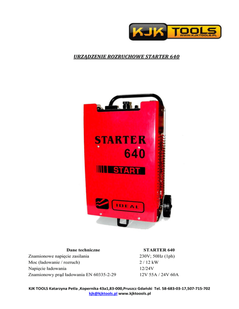 URZĄDZENIE ROZRUCHOWE STARTER 640 Dane techniczne Znamionowe napięcie zasilania Moc (ładowanie / rozruch) Napięcie ładowania Znamionowy prąd ładowania EN 60335-2-29 STARTER 640 230V; 50Hz (1ph) 2 / 12 kW 12/24V 12V 55A / 24V 60A KJK TOOLS Katarzyna Petla ,Kopernika 43a1,83-000,Pruszcz Gdański Tel. 58-683-03-17,507-715-702 [email protected] www.kjktoools.pl Prąd rozruchu 600 A Znamionowy prąd rozruchu EN 60335-2-29 500 A Znamionowa pojemność akumulatora Ah 15h (min/max) 20 / 1550 Stopnie regulacji prądu ładowania 6 Zabezpieczenie przeciążeniowe w urządzeniu 2xT110A Wymiary gabarytowe dł x szer x wys 320x480x735 mm Waga 25 kg Prostownik do ładowania 12 i 24 woltowych akumulatorów kwasowych posiadający funkcję rozruchu. Umożliwia rozruch samochodów z silnikami benzynowymi oraz diesla (w tym vanów, lekkich ciężarówek i traktorów). Zasilanie jednofazowe. Zabezpieczenie przeciw zwarciu biegunów, przeciążeniu i odwrotnej biegunowości. Miernik prądu ładowania. Sześć stopni ładowania: normalne ładowanie - 1 Stopień normalne ładowanie - 2 Stopień normalne ładowanie - 3 Stopień szybkie ładowanie (boost) - 1 Stopień szybkie ładowanie (boost) - 2 Stopień szybkie ładowanie (boost) - 3 Stopień Cena urządzenia z przewodami: 550,00ZŁ Gwarancja 12 miesięcy. KJK TOOLS Katarzyna Petla ,Kopernika 43a1,83-000,Pruszcz Gdański Tel. 58-683-03-17,507-715-702 [email protected] www.kjktoools.pl