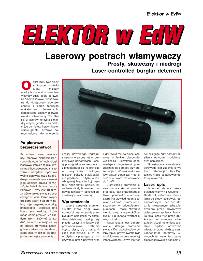 Elektor w EdW ELEKTOR w EdW Laserowy postrach włamywaczy Prosty, skuteczny i niedrogi Laser−controlled burglar deterrent d lat 1960−tych diody emitujące światło (LED) znalazły wielką liczbę zastosowań. Nie wszyscy zdają sobie sprawę, że diody laserowe, wbudowa− ne do dostępnych powsze− chnnie i coraz tańszych wskaźników laserowych, opracowane zostały pierwot− nie do odtwarzaczy CD. Dzi− siaj z laserów korzystają mię− dzy innymi geodeci i architek− ci (do pomiarów i przy niwelo− waniu gruntu), przemysł sa− mochodowy (do mierzenia O Po pierwsze bezpieczeństwo! Każdy laser, nawet najmniej− szy, stanowi niebezpieczeń− stwo dla oczu. W technologii laserowej istnieje reguła, któ− ra musi być przestrzegana za− wsze i wszędzie: Nigdy nie wolno ustawiać oczu na dro− dze promienia lasera, a nawet jego odbicia! Trzeba pamię− tać, że światło lasera o mocy zaledwie 1 mW jest 1000 ra− zy jaśniejsze od światła słone− cznego w lecie. Przed rozpo− częciem pracy z laserem na− leży zdjąć zegarek, obrączkę, bransoletkę i wszelkie inne błyszczące ozdoby, które mogą odbić promień. Za każ− dym razem należy też spraw− dzić, że nikt nie znajduje się na drodze promienia. Szcze− gólnie ciekawskie są dzieci, które chcą wiedzieć, co dzie− je się wewnątrz promienia. części dowolnego rodzaju), stosowane są one też w pre− cyzyjnych poziomicach. Lase− ry pracują także na rzecz walki z przestępczością (na przykład w urządzeniach fotogra− fujących pojazdy przekraczaj− ące prędkość). To tylko kilka z olbrzymiej liczby funkcji lase− rów. Nasz artykuł opisuje, jak na bazie diody laserowej zbu− dować tani alarm lub układ od− straszający włamywaczy. Wprowadzenie Lasery generują promień światła, które, dzięki swej spójności, jest w stanie prze− być duże odległości. W sprze− daży detalicznej znajdują się przede wszystkim lasery pół− przewodnikowe. Ostatnio często słyszy się o wskaźni− kach laserowych, a to ze względu na przestępcze ich używanie przez bezmyślnych ELEKTRONIKA DLA WSZYSTKICH 1/99 ludzi. Wskaźnik to dioda lase− rowa w lekkiej obudowie, wielkością i kształtem odpo− wiadająca długopisowi, prze− znaczona do pomocy przy pre− zentacjach. W większości kra− jów prawo ogranicza moc la− serów w takim zastosowaniu do 1mW. Duży zasięg promienia la− sera ułatwia skonstruowanie prostego, lecz skutecznego a− larmu przeciwko włamywa− czom. Na przykład jeden laser wraz z kilkoma lustrami, umie− szczonymi w odpowiednich punktach, może stworzyć niewidzialną barierę wokół bu− dynku lub innego wartościo− wego obiektu. Wadą lasera jest genero− wanie stałego promienia światła. Do naszych celów by− łoby lepiej, gdyby światło było modulowane w celu regulacji intensywności. Łatwo jest ten cel osiągnąć przy pomocy za− silania obwodu modulowa− nym napięciem. Skonstruowanie modułu la− serowego jest zupełnie łatwe (patrz referencja 1), lecz Czy− telnicy mogą zastosować go− towy wskaźnik. Laser: opis Schemat ideowy lasera przedstawiamy na rysunku 1. Dioda D1, odwrotnie równo− legła do diody laserowej, jest najprostszym, lecz dostate− cznie skutecznym zabezpie− czeniem przed odwrotnym dołączeniem zasilania. Pomył− ka taka, jeżeli trwa przez krót− ki czas, nie powoduje żadnej szkody. Jeżeli natomiast zasi− lanie będzie odwrotnie włączone przez dłuższy czas, kondensator tantalowy C3 wybuchnie, natomiast sama dioda laserowa nie poniesie u− 19 Elektor w EdW Rezystory R2 i R3 po− winny być metalizowane (nie węglo− we), mieć to− lerancję 1% i moc strat 0,5W. D r u g i wzmacniacz, IC2, wytwarza sygnał dla nie− wielkiego głośnika LS1. Rys. 1. Schemat modułu laserowego, z wyko− Poziomem rzystaniem dyskretnej diody lub wskaźnika la− głośności ste− serowego. Jasność strumienia regulowana ruje potencjo− jest przez potencjometr lub zewnętrzny syg− metr R4. Natu− nał. ralnie, głośnik może być za− szczerbku. Zależnie od typu stąpiony przez przekaźnik, diody laserowej należy dobrać który uruchomi inny rodzaj a− wartość rezystora R1. W wię− larmu, na przykład w większej kszości przypadków odpowie− odległości od ochranianego o− dnia jest wartość 9−11 omów. biektu. Kilka kondensatorów służy Układ mieści się na małym kawałku płytki prototypowej. do odprzęgania odbiornika. Zwracamy uwagę, że dioda Kondensator C1 powinien być Zenera D2 ma parametry: 5 V, ceramiczny. Jako detektor możemy za− 500 mW. Skorzystanie z regulowa− instalować dowolnego typu nego zasilacza o napięciu wy− fototranzystor lub fotodiodę jściowym 3,5−6V zapewnia na podczerwień. Do wyboru są na przykład: fototranzystor minimalne straty mocy. Dioda powinna zacząć BPW40 lub (lepiej) LPT85A; święcić po dołączeniu zasila− diody SFH205 lub BPW34. Odbiornik wymaga syme− nia. Do wejścia modulatora możemy podać odpowiednie trycznego zasilania, które mo− napięcie modulujące. Poten− że być zrealizowane na przy− cjometr na wejściu zapewnia kład przez dwie baterie 9V. Odbiornik zmieści się w precyzyjną regulację mocy. Stopień modulujący może pra− małym plastykowym pudełku. cować z sygnałami o częstot− Nie ma konieczności projekto− liwości sięgającej 2 MHz, i do− wania dla niego specjalnej piero przy tak dużej częstotli− płytki drukowanej, wystarczy wości głębokość modulacji za− kawałek płytki prototypowej. czyna maleć. Warto podkreś− Konieczne jest jednak zmie− lić, że głębokość modulacji szczenie układu na niewielkiej może wynosić 100% aż do 2 powierzchni oraz ostrożne i MHz. To jest bardzo dobry wy− staranne lutowanie, co potem zapobiegnie powstawaniu nik dla tak prostego obwodu. szkodliwych oscylacji, mogą− cych utrudnić lub uniemożli− Od