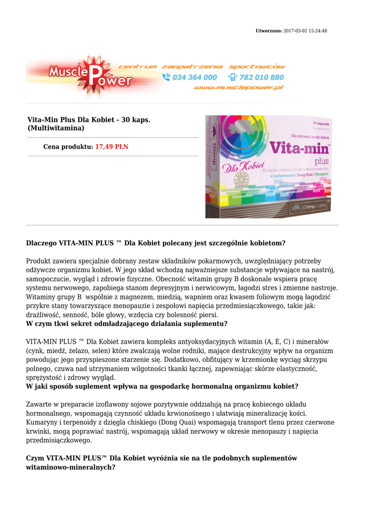 Utworzono: 2017-03-02 15:24:48 Vita-Min Plus Dla Kobiet - 30 kaps. (Multiwitamina) Cena produktu: 17,49 PLN Dlaczego VITA-MIN PLUS ™ Dla Kobiet polecany jest szczególnie kobietom? Produkt zawiera specjalnie dobrany zestaw składników pokarmowych, uwzględniający potrzeby odżywcze organizmu kobiet. W jego skład wchodzą najważniejsze substancje wpływające na nastrój, samopoczucie, wygląd i zdrowie fizyczne. Obecność witamin grupy B doskonale wspiera pracę systemu nerwowego, zapobiega stanom depresyjnym i nerwicowym, łagodzi stres i zmienne nastroje. Witaminy grupy B wspólnie z magnezem, miedzią, wapniem oraz kwasem foliowym mogą łagodzić przykre stany towarzyszące menopauzie i zespołowi napięcia przedmiesiączkowego, takie jak: drażliwość, senność, bóle głowy, wzdęcia czy bolesność piersi. W czym tkwi sekret odmładzającego działania suplementu? VITA-MIN PLUS ™ Dla Kobiet zawiera kompleks antyoksydacyjnych witamin (A, E, C) i minerałów (cynk, miedź, żelazo, selen) które zwalczają wolne rodniki, mające destrukcyjny wpływ na organizm powodując jego przyspieszone starzenie się. Dodatkowo, obfitujący w krzemionkę wyciąg skrzypu polnego, czuwa nad utrzymaniem wilgotności tkanki łącznej, zapewniając skórze elastyczność, sprężystość i zdrowy wygląd. W jaki sposób suplement wpływa na gospodarkę hormonalną organizmu kobiet? Zawarte w preparacie izoflawony sojowe pozytywnie oddziałują na pracę kobiecego układu hormonalnego, wspomagają czynność układu krwionośnego i ułatwiają mineralizację kości. Kumaryny i terpenoidy z dzięgla chiskiego (Dong Quai) wspomagają transport tlenu przez czerwone krwinki, mogą poprawiać nastrój, wspomagają układ nerwowy w okresie menopauzy i napięcia przedmisiączkowego. Czym VITA-MIN PLUS™ Dla Kobiet wyróżnia sie na tle podobnych suplementów witaminowo-mineralnych? Wszystkie składniki mineralne występują w postaci chelatowej- w specjalnym połączeniu z kwasami organicznymi, dzięki czemu charakteryzują się bardzo wysoką przyswajalnością przez organizm. Nie osłabiają ponadto działania witamin i są bardziej odporne na obecność konserwantów i wielu innych niekorzystnych związków obecnych w żywności. VITA-MIN PLUS™ dla kobiet to przewaga nad innymi suplementami, dzięki zdecydowanie lepszej przyswajalności. Skład: Porcja: 1 kap. Porcji w opakowaniu: 30 Opakowanie: 30 kap. Wartość odżywcza w 1 kap. Witamina A 800 µg Witamina D 5 µg Witamina E 10 mg Witamina C 60 mg Witamina B1 1,4 mg Witamina B2 1,6 mg Niacyna 18 mg Witamina B6 2 mg Kwas foliowy 200 µg Witamina B12 1 µg Biotyna 150 µg Kwas pantotenowy 6 mg Ekstrakt izoflawonów sojowych (40%) w tym: izoflawony sojowe 10mg 4mg Żeńszeń Don Quai 50mg Ekstrakt skrzypu polnego w tym krzemionka 50mg 3,5mg Ekstrakt pieprzu czarnego/ Bioperine (95%) 1mg Wapń 31% Albion® mineral 69% węglan wapnia 150mg Magnez 59% Albion® amino acid chelate 41% tlenek magnezu 70mg Potas 29% Albion® amino acid complex71% chlorek potasu 40mg Cynk* Albion® amino acid chelate (Chelazome®) 10 mg Żelazo Albion® amino acid chelate (Ferrochel®) 1 mg Mangan Albion® amino acid chelate 1mg Miedź Albion® amino acid chelate (Chelazome®) 150 µg Jod 150 µg Chrom Albion® amino acid chelate (Chelavite®) 50 µg Selen Albion® amino acid complex 30 µg Molibden Albion® amino acid chelate 25 µg Dawkowanie: Suplement najlepiej przyjmować w ilości 1 kapsułki na dobę. Ilość Adres: http://www.muscle.trustnet.pl/ 30 kaps. Telefon: 34 36 43 000, 782 010 880 Email: [email protected]