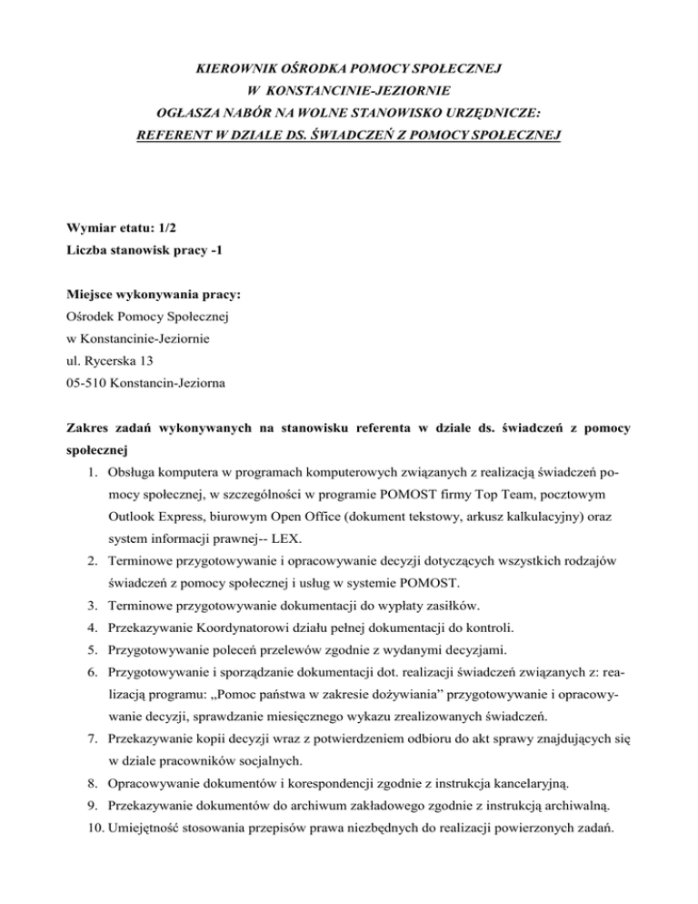 KIEROWNIK OŚRODKA POMOCY SPOŁECZNEJ W KONSTANCINIE-JEZIORNIE OGŁASZA NABÓR NA WOLNE STANOWISKO URZĘDNICZE: REFERENT W DZIALE DS. ŚWIADCZEŃ Z POMOCY SPOŁECZNEJ Wymiar etatu: 1/2 Liczba stanowisk pracy -1 Miejsce wykonywania pracy: Ośrodek Pomocy Społecznej w Konstancinie-Jeziornie ul. Rycerska 13 05-510 Konstancin-Jeziorna Zakres zadań wykonywanych na stanowisku referenta w dziale ds. świadczeń z pomocy społecznej 1. Obsługa komputera w programach komputerowych związanych z realizacją świadczeń pomocy społecznej, w szczególności w programie POMOST firmy Top Team, pocztowym Outlook Express, biurowym Open Office (dokument tekstowy, arkusz kalkulacyjny) oraz system informacji prawnej-- LEX. 2. Terminowe przygotowywanie i opracowywanie decyzji dotyczących wszystkich rodzajów świadczeń z pomocy społecznej i usług w systemie POMOST. 3. Terminowe przygotowywanie dokumentacji do wypłaty zasiłków. 4. Przekazywanie Koordynatorowi działu pełnej dokumentacji do kontroli. 5. Przygotowywanie poleceń przelewów zgodnie z wydanymi decyzjami. 6. Przygotowywanie i sporządzanie dokumentacji dot. realizacji świadczeń związanych z: realizacją programu: „Pomoc państwa w zakresie dożywiania” przygotowywanie i opracowywanie decyzji, sprawdzanie miesięcznego wykazu zrealizowanych świadczeń. 7. Przekazywanie kopii decyzji wraz z potwierdzeniem odbioru do akt sprawy znajdujących się w dziale pracowników socjalnych. 8. Opracowywanie dokumentów i korespondencji zgodnie z instrukcja kancelaryjną. 9. Przekazywanie dokumentów do archiwum zakładowego zgodnie z instrukcją archiwalną. 10. Umiejętność stosowania przepisów prawa niezbędnych do realizacji powierzonych zadań. 11. Wykonywanie innych niezbędnych czynności służbowych zleconych przez bezpośredniego przełożonego i kierownika jednostki w granicach właściwych dla posiadanych kwalifikacji oraz zajmowanego stanowiska. Warunki pracy Warunki dotyczące charakteru pracy na stanowisku i sposobu wykonywania zadań: praca umysłowa, czas pracy w biurze, wyposażenie w sprzęt biurowy, komputerowy, środki łączności. Czas pracy jednozmianowy. Miejsce i otoczenie organizacyjno-techniczne stanowiska pracy: - praca przy monitorze ekranowym, - naturalne i sztuczne oświetlenie, - praca w budynku przy ul. Rycerskiej 13, miejsca postojowe ok. 10m. od budynku, wejście główne do budynku ze 6 stopniami oraz podjazd przystosowany dla osób niepełnosprawnych i poruszających się na wózkach inwalidzkich, przez drzwi dwuskrzydłowe prawostronne otwierane do światła ościeżnic 138 cm jedno skrzydło o szerokości 26 cm blokowane. - miejsce pracy: II piętro, wejście po schodach z poręczą (4 biegi schodów, minimalna szerokość - 120 cm), korytarz biurowy o szerokości 157 cm, drzwi wejściowe do pokoi biurowych o szerokości 80 cm w świetle ościeżnic, drzwi wejściowe do toalet - szerokość 80 cm w świetle ościeżnic (toalety nieprzystosowane dla osób poruszających się na wózkach inwalidzkich). Wymagania niezbędne: 1. wykształcenie co najmniej średnie o profilu ogólnym lub zawodowym umożliwiające wykonywanie zadań na stanowisku 2. obywatelstwo polskie, 3. posiadanie pełnej zdolności do czynności prawnych oraz korzystanie z pełni praw publicznych, 4. stan zdrowia pozwalający na zatrudnienie na stanowisku, 5. brak skazania prawomocnym wyrokiem Sądu za umyślne przestępstwo ścigane z oskarżenia publicznego lub umyślne przestępstwo skarbowe , 6. nieposzlakowana opinia, 7. gotowość do poddania się czynnościom sprawdzającym wynikającym z ustawy o ochronie informacji niejawnych ( Dz. U. z 2010 r. nr 182 poz. 1228) 8. umiejętność obsługi komputera w zakresie edytorów biurowych ( Word , Excel ) 9. umiejętność obsługi komputera w zakresie Internet, poczta elektroniczna 10. sumienność, dokładność odpowiedzialność 11. bardzo dobra organizacja czasy pracy Wymagania dodatkowe: 1. znajomość przepisów Kodeksu postępowania administracyjnego oraz ustawy o Pomocy społecznej 2. znajomość instrukcji kancelaryjnej, 3. komunikatywność, 4. umiejętność pracy w zespole, 5. terminowość , dokładność i sumienność w załatwianiu spraw, 6. samodzielność, 7. spokój , życzliwość i takt w kontaktach z klientami, 8. wysoka kultura osobista; Wymagane dokumenty 1. życiorys (CV) własnoręcznie podpisany przez kandydata ; 2. list motywacyjny własnoręcznie podpisany przez kandydata 3. kwestionariusz osobowy dla osoby ubiegającej się o zatrudnienie własnoręcznie podpisany przez kandydata ; 4. poświadczone przez kandydata kopie dokumentów potwierdzające wykształcenie oraz kwalifikacje i umiejętności; 5. kopia dowodu osobistego lub paszportu 6. kopia dokumentu potwierdzającego niepełnosprawność- w przypadku kandydatów, którzy zamierzają skorzystać z pierwszeństwa w zatrudnieniu, w przypadku gdy znajdą się w gronie najlepszych kandydatów 7. zaświadczenie o stanie zdrowia ; 8. oświadczenie o niekaralności za przestępstwa umyślne przestępstwo ścigane z oskarżenia publicznego lub umyślne przestępstwo skarbowe oraz , że nie toczy się przeciwko niemu postępowanie karne lub karno – skarbowe za przestępstwo umyślne przestępstwo ścigane z oskarżenia publicznego lub umyślne przestępstwo skarbowe ( przed zawarciem umowy o pracę kandydat zobowiązany będzie do przedłożenia zaświadczenia z Krajowego Rejestru Karnego ). 9. oświadczenie kandydata o wyrażeniu zgody na przetwarzanie danych osobowych do celów rekrutacji o następującej treści: „Wyrażam zgodę na przetwarzanie moich danych osobowych zawartych w ofercie pracy dla potrzeb niezbędnych do realizacji procesu rekrutacji zgodnie z ustawą z dnia 29 sierpnia 1997 r. o ochronie danych osobowych (Dz. U. 2002 r. Nr 101 poz. 926 , z późn. zm. ) oraz ustawą z dnia 21 listopada 2008 roku o pracownikach samorządowych (Dz. U. z 2008 r. Nr 223, poz. 1458 z późn. zm. ). Term