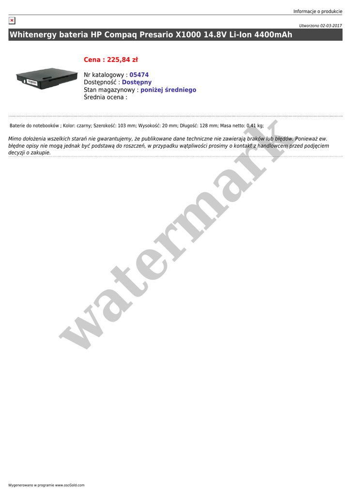 Informacje o produkcie Utworzono 02-03-2017 Whitenergy bateria HP Compaq Presario X1000 14.8V Li-Ion 4400mAh Cena : 225,84 zł Nr katalogowy : 05474 Dostępność : Dostępny Stan magazynowy : poniżej średniego Średnia ocena : Baterie do notebooków ; Kolor: czarny; Szerokość: 103 mm; Wysokość: 20 mm; Długość: 128 mm; Masa netto: 0,41 kg; w at er m ar k Mimo dołożenia wszelkich starań nie gwarantujemy, że publikowane dane techniczne nie zawierają braków lub błędów. Ponieważ ew. błędne opisy nie mogą jednak być podstawą do roszczeń, w przypadku wątpliwości prosimy o kontakt z handlowcem przed podjęciem decyzji o zakupie. Wygenerowano w programie www.oscGold.com