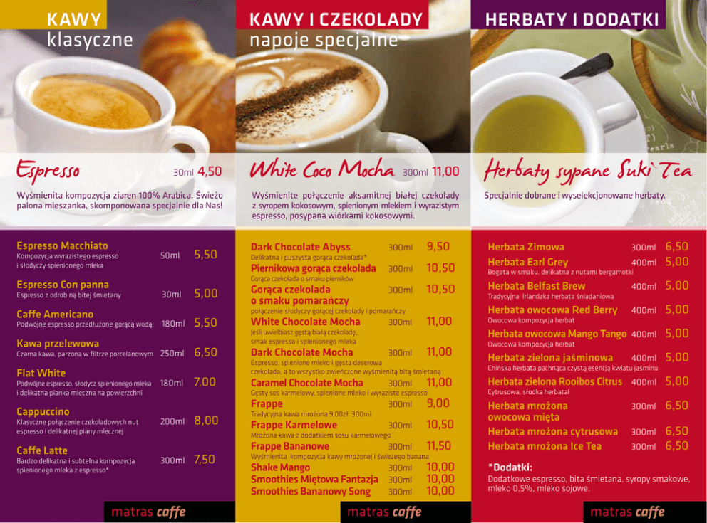 KAWY KAWY I CZEKOLADY klasyczne Espresso HERBATY I DODATKI napoje specjalne 30ml 4,50 White Coco Mocha 300ml 11,00 Wyśmienita kompozycja ziaren 100% Arabica. Świeżo palona mieszanka, skomponowana specjalnie dla Nas! Wyśmienite połączenie aksamitnej białej czekolady z syropem kokosowym, spienionym mlekiem i wyrazistym espresso, posypana wiórkami kokosowymi. Espresso Macchiato Dark Chocolate Abyss 300ml 9,50 Piernikowa gorąca czekolada 300ml 10,50 Gorąca czekolada o smaku pomarańczy 300ml 10,50 White Chocolate Mocha 300ml 11,00 Dark Chocolate Mocha 300ml 11,00 Kompozycja wyrazistego espresso i słodyczy spienionego mleka Espresso Con panna Espresso z odrobiną bitej śmietany Caffe Americano Podwójne espresso przedłużone gorącą wodą Kawa przelewowa Czarna kawa, parzona w filtrze porcelanowym Flat White Podwójne espresso, słodycz spienionego mleka i delikatna pianka mleczna na powierzchni Cappuccino Klasyczne połączenie czekoladowych nut espresso i delikatnej piany mlecznej Caffe Latte Bardzo delikatna i subtelna kompozycja spienionego mleka z espresso* 50ml 5,50 Delikatna i puszysta gorąca czekolada* Gorąca czekolada o smaku pierników 30ml 5,00 180ml 5,50 250ml 6,50 180ml 200ml 7,00 8,00 połączenie słodyczy gorącej czekolady i pomarańczy Jeśli uwielbiasz gęstą białą czekoladę, smak espresso i spienionego mleka Espresso, spienione mleko i gęsta deserowa czekolada, a to wszystko zwieńczone wyśmienitą bitą śmietaną 7,50 Specjalnie dobrane i wyselekcjonowane herbaty. 6,50 5,00 Herbata Zimowa Herbata Earl Grey 300ml Herbata Belfast Brew 400ml 5,00 Herbata owocowa Red Berry 400ml 5,00 400ml Bogata w smaku, delikatna z nutami bergamotki Tradycyjna Irlandzka herbata śniadaniowa Owocowa kompozycja herbat Herbata owocowa Mango Tango 400ml 5,00 Owocowa kompozycja herbat Herbata zielona jaśminowa 400ml Chińska herbata pachnąca czystą esencją kwiatu jaśminu 5,00 11,00 Herbata zielona Rooibos Citrus 400ml 5,00 300ml 9,00 Frappe Karmelowe 300ml 10,50 Frappe Bananowe 300ml Herbata mrożona owocowa mięta Herbata mrożona cytrusowa Herbata mrożona Ice Tea Caramel Chocolate Mocha 300ml Frappe Gęsty sos karmelowy, spienione mleko i wyraziste espresso Tradycyjna kawa mrożona 9,00zł 300ml Mrożona kawa z dodatkiem sosu karmelowego 300ml Herbaty sypane Suki Tea 11,50 Wyśmienita kompozycja kawy mrożonej i świeżego banana Shake Mango 300ml Smoothies Miętowa Fantazja 300ml Smoothies Bananowy Song 300ml 10,00 10,00 10,00 Cytrusowa, słodka herbatal *Dodatki: 300ml 6,50 300ml 6,50 6,50 300ml Dodatkowe espresso, bita śmietana, syropy smakowe, mleko 0,5%, mleko sojowe.