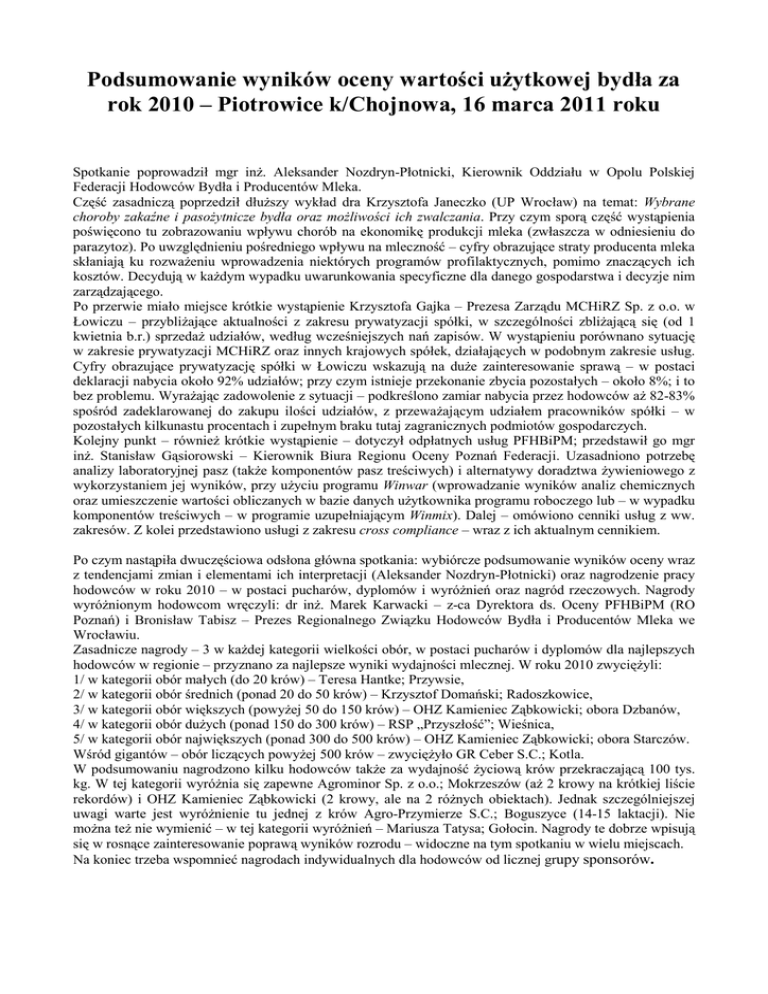 Podsumowanie wyników oceny wartości użytkowej bydła za rok 2010 – Piotrowice k/Chojnowa, 16 marca 2011 roku Spotkanie poprowadził mgr inż. Aleksander Nozdryn-Płotnicki, Kierownik Oddziału w Opolu Polskiej Federacji Hodowców Bydła i Producentów Mleka. Część zasadniczą poprzedził dłuższy wykład dra Krzysztofa Janeczko (UP Wrocław) na temat: Wybrane choroby zakaźne i pasożytnicze bydła oraz możliwości ich zwalczania. Przy czym sporą część wystąpienia poświęcono tu zobrazowaniu wpływu chorób na ekonomikę produkcji mleka (zwłaszcza w odniesieniu do parazytoz). Po uwzględnieniu pośredniego wpływu na mleczność – cyfry obrazujące straty producenta mleka skłaniają ku rozważeniu wprowadzenia niektórych programów profilaktycznych, pomimo znaczących ich kosztów. Decydują w każdym wypadku uwarunkowania specyficzne dla danego gospodarstwa i decyzje nim zarządzającego. Po przerwie miało miejsce krótkie wystąpienie Krzysztofa Gajka – Prezesa Zarządu MCHiRZ Sp. z o.o. w Łowiczu – przybliżające aktualności z zakresu prywatyzacji spółki, w szczególności zbliżającą się (od 1 kwietnia b.r.) sprzedaż udziałów, według wcześniejszych nań zapisów. W wystąpieniu porównano sytuację w zakresie prywatyzacji MCHiRZ oraz innych krajowych spółek, działających w podobnym zakresie usług. Cyfry obrazujące prywatyzację spółki w Łowiczu wskazują na duże zainteresowanie sprawą – w postaci deklaracji nabycia około 92% udziałów; przy czym istnieje przekonanie zbycia pozostałych – około 8%; i to bez problemu. Wyrażając zadowolenie z sytuacji – podkreślono zamiar nabycia przez hodowców aż 82-83% spośród zadeklarowanej do zakupu ilości udziałów, z przeważającym udziałem pracowników spółki – w pozostałych kilkunastu procentach i zupełnym braku tutaj zagranicznych podmiotów gospodarczych. Kolejny punkt – również krótkie wystąpienie – dotyczył odpłatnych usług PFHBiPM; przedstawił go mgr inż. Stanisław Gąsiorowski – Kierownik Biura Regionu Oceny Poznań Federacji. Uzasadniono potrzebę analizy laboratoryjnej pasz (także komponentów pasz treściwych) i alternatywy doradztwa żywieniowego z wykorzystaniem jej wyników, przy użyciu programu Winwar (wprowadzanie wyników analiz chemicznych oraz umieszczenie wartości obliczanych w bazie danych użytkownika programu roboczego lub – w wypadku komponentów treściwych – w programie uzupełniającym Winmix). Dalej – omówiono cenniki usług z ww. zakresów. Z kolei przedstawiono usługi z zakresu cross compliance – wraz z ich aktualnym cennikiem. Po czym nastąpiła dwuczęściowa odsłona główna spotkania: wybiórcze podsumowanie wyników oceny wraz z tendencjami zmian i elementami ich interpretacji (Aleksander Nozdryn-Płotnicki) oraz nagrodzenie pracy hodowców w roku 2010 – w postaci pucharów, dyplomów i wyróżnień oraz nagród rzeczowych. Nagrody wyróżnionym hodowcom wręczyli: dr inż. Marek Karwacki – z-ca Dyrektora ds. Oceny PFHBiPM (RO Poznań) i Bronisław Tabisz – Prezes Regionalnego Związku Hodowców Bydła i Producentów Mleka we Wrocławiu. Zasadnicze nagrody – 3 w każdej kategorii wielkości obór, w postaci pucharów i dyplomów dla najlepszych hodowców w regionie – przyznano za najlepsze wyniki wydajności mlecznej. W roku 2010 zwyciężyli: 1/ w kategorii obór małych (do 20 krów) – Teresa Hantke; Przywsie, 2/ w kategorii obór średnich (ponad 20 do 50 krów) – Krzysztof Domański; Radoszkowice, 3/ w kategorii obór większych (powyżej 50 do 150 krów) – OHZ Kamieniec Ząbkowicki; obora Dzbanów, 4/ w kategorii obór dużych (ponad 150 do 300 krów) – RSP „Przyszłość”; Wieśnica, 5/ w kategorii obór największych (ponad 300 do 500 krów) – OHZ Kamieniec Ząbkowicki; obora Starczów. Wśród gigantów – obór liczących powyżej 500 krów – zwyciężyło GR Ceber S.C.; Kotla. W podsumowaniu nagrodzono kilku hodowców także za wydajność życiową krów przekraczającą 100 tys. kg. W tej kategorii wyróżnia się zapewne Agrominor Sp. z o.o.; Mokrzeszów (aż 2 krowy na krótkiej liście rekordów) i OHZ Kamieniec Ząbkowicki (2 krowy, ale na 2 różnych obiektach). Jednak szczególniejszej uwagi warte jest wyróżnienie tu jednej z krów Agro-Przymierze S.C.; Boguszyce (14-15 laktacji). Nie można też nie wymienić – w tej kategorii wyróżnień – Mariusza Tatysa; Gołocin. Nagrody te dobrze wpisują się w rosnące zainteresowanie poprawą wyników rozrodu – widoczne na tym spotkaniu w wielu miejscach. Na koniec trzeba wspomnieć nagrodach indywidualnych dla hodowców od licznej grupy sponsorów.