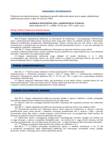 PORADNIK INTERESANTA Podstawowym aktem prawnym, regulującym sposób załatwiania spraw przez organy administracji publicznej jest ustawa z dnia 14 czerwca 1960r. KODEKS POSTĘPOWANIA ADMINISTRACYJNEGO (tekst jednolity Dz. U. z 2000r. Nr 98, poz. 1071 z późn. zm.) Wyciąg z Kodeksu Postępowania Administracyjnego : PRAWO UZYSKANIA INFORMACJI Art. 9. Organy administracji publicznej są obowiązane do należytego i wyczerpującego informowania stron o okolicznościach faktycznych i prawnych, które mogą mieć wpływ na ustalenie ich praw i obowiązków będących przedmiotem postępowania administracyjnego. Organy czuwają nad tym, aby strony i inne osoby uczestniczące w postępowaniu nie poniosły szkody z powodu nieznajomości prawa, i w tym celu udzielają im niezbędnych wyjaśnień i wskazówek. Art. 10. § 1. Organy administracji publicznej obowiązane są zapewnić stronom czynny udział w każdym stadium postępowania, a przed wydaniem decyzji umożliwić im wypowiedzenie się co do zebranych dowodów i materiałów oraz zgłoszonych żądań. § 2. Organy administracji publicznej mogą odstąpić od zasady określonej w § 1 tylko w przypadkach, gdy załatwienie sprawy nie cierpi zwłoki ze względu na niebezpieczeństwo dla życia lub zdrowia ludzkiego albo ze względu na grożącą niepowetowaną szkodę materialną. FORMA KORESPONDENCJI Art. 14. § 1. (6) Sprawy należy załatwiać w formie pisemnej lub w formie dokumentu elektronicznego w rozumieniu przepisów ustawy z dnia 17 lutego 2005 r. o informatyzacji działalności podmiotów realizujących zadania publiczne (Dz. U. Nr 64, poz. 565, z późn. zm.), doręczanego środkami komunikacji elektronicznej. § 2. Sprawy mogą być załatwiane ustnie, gdy przemawia za tym interes strony, a przepis prawa nie stoi temu na przeszkodzie. Treść oraz istotne motywy takiego załatwienia powinny być utrwalone w aktach w formie protokołu lub podpisanej przez stronę adnotacji. TERMIN ZAŁATWIENIA SPRAWY Art. 12. § 1. Organy administracji publicznej powinny działać w sprawie wnikliwie i szybko, posługując się możliwie najprostszymi środkami prowadzącymi do jej załatwienia. § 2. Sprawy, które nie wymagają zbierania dowodów, informacji lub wyjaśnień, powinny być załatwione niezwłocznie. Art. 35. § 1. Organy administracji publicznej obowiązane są załatwiać sprawy bez zbędnej zwłoki. § 2. Niezwłocznie powinny być załatwiane sprawy, które mogą być rozpatrzone w oparciu o dowody przedstawione przez stronę łącznie z żądaniem wszczęcia postępowania lub w oparciu o fakty i dowody powszechnie znane albo znane z urzędu organowi, przed którym toczy się postępowanie, bądź możliwe do ustalenia na podstawie danych, którymi rozporządza ten organ. § 3. Załatwienie sprawy wymagającej postępowania wyjaśniającego powinno nastąpić nie później niż w ciągu miesiąca, a sprawy szczególnie skomplikowanej - nie później niż w ciągu dwóch miesięcy od dnia wszczęcia postępowania, zaś w postępowaniu odwoławczym - w ciągu miesiąca od dnia otrzymania odwołania. § 4. (13) Przepisy szczególne mogą określać inne terminy niż określone w § 3. Art. 36. § 1. (14) O każdym przypadku niezałatwienia sprawy w terminie określonym w art. 35 lub w przepisach szczególnych organ administracji publicznej jest obowiązany zawiadomić strony, podając przyczyny zwłoki i wskazując nowy termin załatwienia sprawy. § 2. Ten sam obowiązek ciąży na organie administracji publicznej również w przypadku zwłoki w załatwieniu sprawy z przyczyn niezależnych od organu. Art. 37. § 1. (15) Na niezałatwienie sprawy w terminie określonym w art. 35, w przepisach szczególnych, ustalonym w myśl art. 36 lub na przewlekłe prowadzenie postępowania stronie służy zażalenie do organu wyższego stopnia, a jeżeli nie ma takiego organu - wezwanie do usunięcia naruszenia prawa. WYMAGANE DOKUMENTY • • • przed złożeniem wniosku w określonej sprawie należy dowiedzieć się, jakie dokumenty należy złożyć razem z wnioskiem. szczegółowych informacji na temat wymaganych dokumentów udziela urzędnik, zajmujący się daną sprawą. Dla zaoszczędzenia czasu można zwrócić się o udzielenie takiej informacji telefonicznie lub samemu skorzystać z Kart Usług, które zawierają informacje na temat niezbędnych dokumentów. Karty dostępne są w Urzędzie - Wydziale Obsługi Interesantów oraz na stronie internetowej www.strzegom.pl. należy upewnić się w jakiej formie powinny zostać dostarczone dokumenty (np. oryginały czy kserokopie). Katalog Kart Usług http://www.strzegom.pl/2004/strony/urzad_informator.htm WSZCZĘCIE POSTĘPOWANIA ADMINISTRACYJNEGO Art. 61. § 1. Postępowanie administracyjne wszczyna się na żądanie strony lub z urzędu. § 2. Organ administracji publicznej może ze względu na szczególnie ważny interes strony wszcząć z urzędu postępowanie także w sprawie, w której przepis prawa wymaga wniosku strony. Organ obowiązany jest uzyskać na to zgodę strony w toku postępowania, a w razie nieuzyskania zgody - postępowanie umorzyć. § 3. Datą wszczęcia postępowania na żądanie strony jest dzień doręczenia żądania organowi administracji publicznej. § 3a. (34) Datą wszczęcia postępowania na żądanie strony wniesione drogą elektroniczną jest dzień wprowadzenia żądania do systemu teleinformatycznego organu administracji publicznej. § 4. O wszczęciu postępowania z urzędu lub na żądanie jednej ze stron należy zawiadomić wszystkie osoby będące stronami w sprawie. Art. 61a. (35) § 1. Gdy żądanie, o którym mowa w art. 61, zostało wniesione przez osobę niebędącą stroną lub z innych uzasadnionych przyczyn postępowanie nie może być wszczęte, organ administracji publicznej wydaje postanowienie o odmowie wszczęcia postępowania. § 2. Na postanowienie, o którym mowa w § 1, służy zażalenie. FORMA PODANIA Art. 63. § 1. (36) Pod