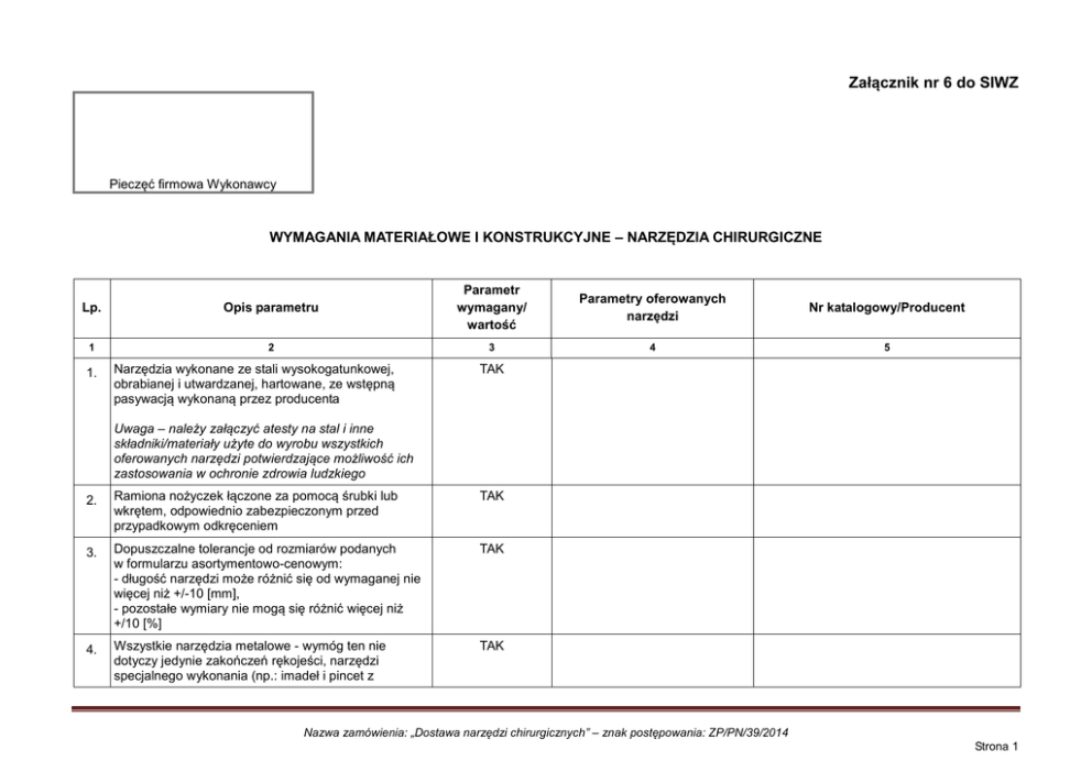 Załącznik nr 6 do SIWZ Pieczęć firmowa Wykonawcy WYMAGANIA MATERIAŁOWE I KONSTRUKCYJNE – NARZĘDZIA CHIRURGICZNE Lp. Opis parametru Parametr wymagany/ wartość 1 2 3 1. Narzędzia wykonane ze stali wysokogatunkowej, obrabianej i utwardzanej, hartowane, ze wstępną pasywacją wykonaną przez producenta Parametry oferowanych narzędzi Nr katalogowy/Producent 4 5 TAK Uwaga – należy załączyć atesty na stal i inne składniki/materiały użyte do wyrobu wszystkich oferowanych narzędzi potwierdzające możliwość ich zastosowania w ochronie zdrowia ludzkiego 2. Ramiona nożyczek łączone za pomocą śrubki lub wkrętem, odpowiednio zabezpieczonym przed przypadkowym odkręceniem TAK 3. Dopuszczalne tolerancje od rozmiarów podanych w formularzu asortymentowo-cenowym: - długość narzędzi może różnić się od wymaganej nie więcej niż +/-10 [mm], - pozostałe wymiary nie mogą się różnić więcej niż +/10 [%] TAK 4. Wszystkie narzędzia metalowe - wymóg ten nie dotyczy jedynie zakończeń rękojeści, narzędzi specjalnego wykonania (np.: imadeł i pincet z TAK Nazwa zamówienia: „Dostawa narzędzi chirurgicznych” – znak postępowania: ZP/PN/39/2014 Strona 1 nakładkami twardymi lub obcęgów, nożyc i nożyczek o utwardzonych ostrzach) 5. Nożyczki, kleszczyki, imadła wykonane ze stali zgodnie z EN ISO 7153-1, a poszczególne grupy wyrobów wykonane ze stali zgodnie z wymogami DIN: - nożyczki - X20Cr13, X38CrMoV15 lub X45CrMoV15, - kleszczyki, imadła - X20Cr13, X15Cr13 lub 50CrMoV15, Skład stali potwierdzony przez producenta. TAK 6. Twardość stali w zakresie min. 42-50 HRC - parametr potwierdzony przez producenta TAK 7. Odporność na korozję wg normy DIN EN ISO 13402 – parametr potwierdzony przez producenta TAK Załączyć dokumenty potwierdzające spełnienie norm ISO DIN dotyczące własności mechanicznych wszystkich oferowanych narzędzi, a w szczególności: gwarantowanej twardości stali oraz odporności na korozję 8. Narzędzia muszą posiadać możliwość: - mycia (ultradźwięki, neutralizacja i środki myjące posiadające dopuszczenie PZH), - dezynfekcji (temperaturowa i chemiczna środkami dopuszczonymi przez PZH), - sterylizacji (parowa w autoklawach 134 [°C], niskotemperaturowa np. tlenek etylenu dla materiałów wrażliwych i/lub nadtlenek wodoru i lub plazma) TAK Załączyć materiały informacyjne producenta w języku polskim dotyczące postępowania z narzędziami w procesach mycia, dezynfekcji i sterylizacji 9. Kontenery do sterylizacji narzędzi pracujące w systemie otwartym TAK 10. Kontenery do sterylizacji narzędzi z barierą p/bakteryjną nie wymagającą wymiany 11. Kontenery do sterylizacji narzędzi, aluminiowe, pokrywy z aluminium lub termostabilnego tworzywa sztucznego TAK 12. Kontenery do sterylizacji narzędzi wyposażone w system automatycznego wskaźnika sterylizacji lub kontenery z pokrywani polimerowymi z filtrami wymiennymi po min. 5000 cyklach sterylizacyjnych, z pokrywami przezroczystymi lub w min. 5 kolorach TAK Nazwa zamówienia: „Dostawa narzędzi chirurgicznych” – znak postępowania: ZP/PN/39/2014 Strona 2 do wyboru przez Zamawiającego 13. Wszystkie kontenery – opisane numerami katalogowymi, wszystkie parametry kontenerów potwierdzone w dołączonych do oferty oryginalnych, firmowych katalogach, folderach w języku polskim TAK Uprawniony przedstawiciel Wykonawcy Data: …………………………… ……………………………………….. (pieczątka i podpis) Nazwa zamówienia: „Dostawa narzędzi chirurgicznych” – znak postępowania: ZP/PN/39/2014 Strona 3