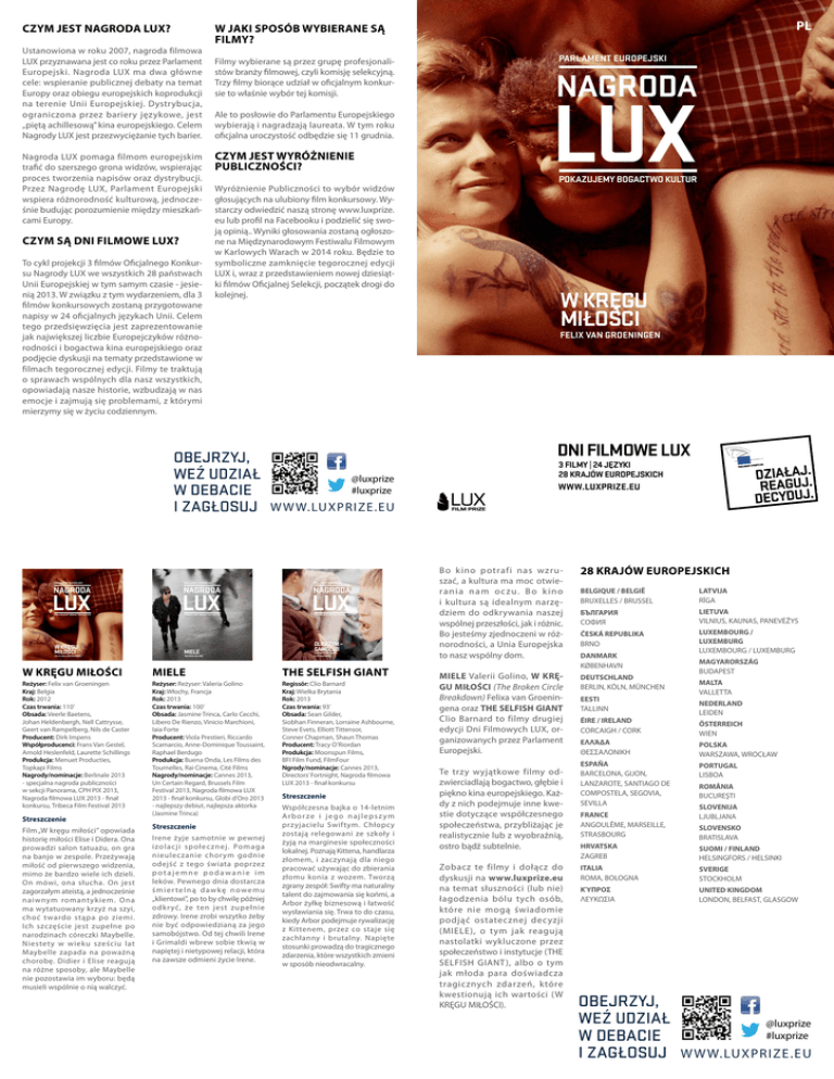 CZYM JEST NAGRODA LUX? Ustanowiona w roku 2007, nagroda filmowa LUX przyznawana jest co roku przez Parlament Europejski. Nagroda LUX ma dwa główne cele: wspieranie publicznej debaty na temat Europy oraz obiegu europejskich koprodukcji na terenie Unii Europejskiej. Dystrybucja, ograniczona przez bariery językowe, jest „piętą achillesową” kina europejskiego. Celem Nagrody LUX jest przezwyciężanie tych barier. Nagroda LUX pomaga filmom europejskim trafić do szerszego grona widzów, wspierając proces tworzenia napisów oraz dystrybucji. Przez Nagrodę LUX, Parlament Europejski wspiera różnorodność kulturową, jednocześnie budując porozumienie między mieszkańcami Europy. CZYM SĄ DNI FILMOWE LUX? To cykl projekcji 3 filmów Oficjalnego Konkursu Nagrody LUX we wszystkich 28 państwach Unii Europejskiej w tym samym czasie - jesienią 2013. W związku z tym wydarzeniem, dla 3 filmów konkursowych zostaną przygotowane napisy w 24 oficjalnych językach Unii. Celem tego przedsięwzięcia jest zaprezentowanie jak największej liczbie Europejczyków różnorodności i bogactwa kina europejskiego oraz podjęcie dyskusji na tematy przedstawione w filmach tegorocznej edycji. Filmy te traktują o sprawach wspólnych dla nasz wszystkich, opowiadają nasze historie, wzbudzają w nas emocje i zajmują się problemami, z którymi mierzymy się w życiu codziennym. PL W JAKI SPOSÓB WYBIERANE SĄ FILMY? PARLAMENT EUROPEJSKI Filmy wybierane są przez grupę profesjonalistów branży filmowej, czyli komisję selekcyjną. Trzy filmy biorące udział w oficjalnym konkursie to właśnie wybór tej komisji. NAGRODA LUX Ale to posłowie do Parlamentu Europejskiego wybierają i nagradzają laureata. W tym roku oficjalna uroczystość odbędzie się 11 grudnia. CZYM JEST WYRÓŻNIENIE PUBLICZNOŚCI? POKAZUJEMY BOGACTWO KULTUR Wyróżnienie Publiczności to wybór widzów głosujących na ulubiony film konkursowy. Wystarczy odwiedzić naszą stronę www.luxprize. eu lub profil na Facebooku i podzielić się swoją opinią.. Wyniki głosowania zostaną ogłoszone na Międzynarodowym Festiwalu Filmowym w Karlowych Warach w 2014 roku. Będzie to symboliczne zamknięcie tegorocznej edycji LUX i, wraz z przedstawieniem nowej dziesiątki filmów Oficjalnej Selekcji, początek drogi do kolejnej. W KRĘGU MIŁOŚCI FELIX VAN GROENINGEN OBEJRZYJ, WEŹ UDZIAŁ W DEBACIE I ZAGŁOSUJ DNI FILMOWE LUX 3 FILMY | 24 JĘZYKI 28 KRAJÓW EUROPEJSKICH @luxprize #luxprize WWW.LUXPRIZE.EU W W W. LU X P R I Z E. E U EP_LuxPrize_GENERIC&DAYSPOSTER_A3_PL_V02.indd 2 PARLAMENT EUROPEJSKI PARLAMENT EUROPEJSKI PARLAMENT EUROPEJSKI NAGRODA NAGRODA NAGRODA LUX LUX POKAZUJEMY BOGACTWO KULTUR LUX POKAZUJEMY BOGACTWO KULTUR W KRĘGU MIŁOŚCI POKAZUJEMY BOGACTWO KULTUR OLBRZYM – SAMOLUB (THE SELFISH GIANT) MIELE FELIX VAN GROENINGEN VALERIA GOLINO CLIO BARNARD W KRĘGU MIŁOŚCI MIELE THE SELFISH GIANT Reżyser: Felix van Groeningen DNI FILMOWE LUX Kraj: Belgia Rok: 2012 Czas trwania: 110’ Obsada: Veerle Baetens, Johan Heldenbergh, Nell Cattrysse, Geert van Rampelberg, Nils de Caster Producent: Dirk Impens Współproducenci: Frans Van Gestel, Arnold Heslenfeld, Laurette Schillings Produkcja: Menuet Producties, Topkapi Films Nagrody/nominacje: Berlinale 2013 - specjalna nagroda publiczności w sekcji Panorama, CPH PIX 2013, Nagroda filmowa LUX 2013 - finał konkursu, Tribeca Film Festival 2013 Reżyser: Reżyser: Valeria DNI FILMOWE LUX Golino Kraj: Włochy, Francja Rok: 2013 Czas trwania: 100’ Obsada: Jasmine Trinca, Carlo Cecchi, Libero De Rienzo, Vinicio Marchioni, Iaia Forte Producent: Viola Prestieri, Riccardo Scamarcio, Anne-Dominique Toussaint, Raphael Berdugo Produkcja: Buena Onda, Les Films des Tournelles, Rai Cinema, Cité Films Nagrody/nominacje: Cannes 2013, Un Certain Regard, Brussels Film Festival 2013, Nagroda filmowa LUX 2013 - finał konkursu, Globi d’Oro 2013 - najlepszy debiut, najlepsza aktorka (Jasmine Trinca) Regissör: Clio Barnard DNI FILMOWE LUX Kraj: Wielka Brytania Rok: 2013 Czas trwania: 93’ Obsada: Sean Gilder, Siobhan Finneran, Lorraine Ashbourne, Steve Evets, Elliott Tittensor, Conner Chapman, Shaun Thomas Producent: Tracy O’Riordan Produkcja: Moonspun Films, BFI Film Fund, FilmFour Ngrody/nominacje: Cannes 2013, Directors’ Fortnight, Nagroda filmowa LUX 2013 - finał konkursu 3 FILMY | 24 JĘZYKI 28 KRAJÓW EUROPEJSKICH WWW.LUXPRIZE.EU EP_LuxPrize_GENERIC&DAYSPOSTER_A3_PL_V02.indd 2 16/10/13 14:59 Streszczenie Film „W kręgu miłości” opowiada historię miłości Elise i Didera. Ona prowadzi salon tatuażu, on gra na banjo w zespole. Przeżywają miłość od pierwszego widzenia, mimo że bardzo wiele ich dzieli. On mówi, ona słucha. On jest zagorzałym ateistą, a jednocześnie naiwnym romant yk iem. Ona ma wytatuowany krzyż na szyi, choć twardo stąpa po ziemi. Ich szczęście jest zupełne po narodzinach córeczki Maybelle. Niestety w wieku sześciu lat Maybelle zapada na poważną chorobę. Didier i Elise reagują na różne sposoby, ale Maybelle nie pozostawia im wyboru: będą musieli wspólnie o nią walczyć. 3 FILMY | 24 JĘZYKI 28 KRAJÓW EUROPEJSKICH WWW.LUXPRIZE.EU EP_LuxPrize_GENERIC&DAYSPOSTER_A3_PL_V02.indd 1 16/10/13 14:58 Streszczenie Irene żyje samotnie w pewnej i zo l a c j i s p o ł e c z n e j. Po m a g a nieuleczanie chor ym godnie odejść z tego świata poprzez potajemne podawanie im leków. Pewnego dnia dostarcza śmier telną dawkę nowemu „klientowi”, po to by chwilę później odk r yć, że ten jest zupełnie zdrowy. Irene zrobi wszytko żeby nie być odpowiedzianą za jego samobójstwo. Od tej chwili Irene i Grimaldi wbrew sobie tkwią w napiętej i nietypowej relacji, która na zawsze odmieni życie Irene. 3 FILMY | 24 JĘZYKI 28 KRAJÓW EUROPEJSKICH WWW.LUXPRIZE.EU EP_LuxPrize_GENERIC&DAYSPOSTER_A3_PL_V02.indd 3 16/10/13 14:59 Streszczenie Współczesna bajka o 14-letnim Arborze i jego najlepszym przyjacielu Swiftym. Chłopcy zostają rele