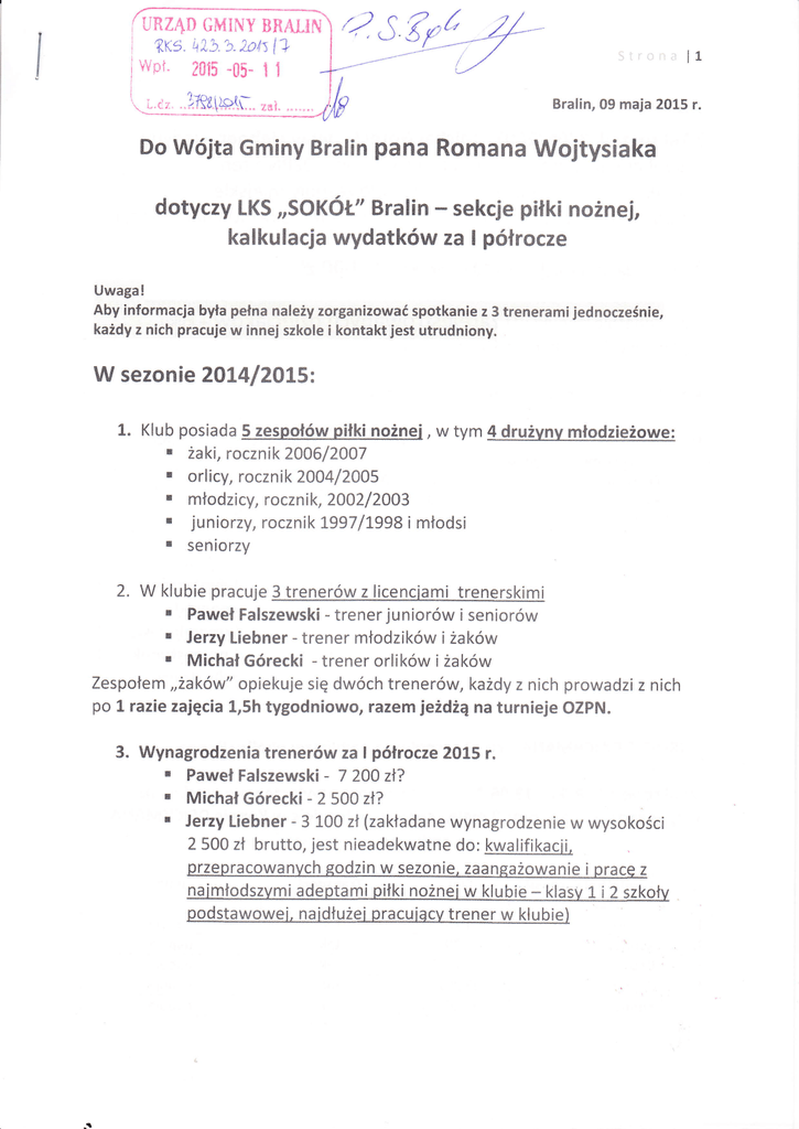 UnZĄn GM1NY BXAIJN ąK9" !Vpt" Ą?"b.b" 2pts l} ąS Kr! |1 ż0l5 -t|5_ t l ..?Ktl[Ęl,r",*i. Bralin,09 maja 2015 r. Do Wójta Gminy Bralin pana Romana Wojtysiaka dotyczy LK§ ,,SOKÓŁ" Bralin - sekcje piłki nożnej, kalkulacja wydatków za l półrocze Uwaga! Aby informacja była pełna należy zorganizować spotkanie z 3 treneramijednocześnie, każdy z nich pracuje w innej szkole i kontakt jest utrudniony. W sezonie 2014l2a§: 1. Klub posiada . . . . . 5 zespołów piłki nożnei , w tym 4 drużvnv młodzieżowe: żaki, rocznik 2006/2CI07 orlicy, rocznik 2004/2005 młodzicy, rocznik, 2002/ż003 juniorzy, rocznik1997/1998 i młodsi seniorzy 2. W klubie pracuje licenciami trenerskimi Paweł Falszewski - trener juniorów i seniorów Jerzy Liebner - trener młodzików i żaków Michał Górecki - trener orlików i zaków Zespołem ,,żaków" opiekuje się dwóch trenerów, kazdy z nich prowadzi z nich po 1 razie zajęcia 1,5h tygodniowo, razem jeżdżąna turnieje OZPN. . . . 3 trenerów z 3. Wynagrodzenia trenerów za l pólrocze 2015 . . ' r. Paweł Falszewski - 7 20O zt? Michał Górecki - 2 SOa zł? Jerzy Liebner - 3 100 zł (zakładane wynagrodzenie w wysokości 2 500 zł brutto, jest nieadekwatne do: kwalifikacii. przepracowanvch f,odzin w sezonie. zaangazowanie i pracę z naimłodszvmi adeptami piłki noznei w klubie - klasv 1 i 2 szkołv podstawowei. naidtuzei pracuiacv trener w klubie) |2\ ZAK Żnrl rocznik zoaalzaol, Michał Górecki, Jerzy Liebner - iedvnv zespół gminnv, grający w ramach rozgrywek ozpN z terenu ostrzeszowsko - kępińskiego, pozostałe zespoły miejskie ż razy trening w tygodniu ]. raz- Jerzy Liebner, L raz Michał Górecki Zaki* badania lekarskie dla 20 dzieci x30 zł = 600 Zł Zaki - obecnie trenuje 2a zarejestrowanych dzieciaków + kilku dodatkowo /lista obecności w załączeniu/ Koszty transportu, orga nizaqa i mprezy Lp. L, ż, 3. l urnler/ mieiscowość orsanizatora ostrzeszów Kępno Bralin Transport Data 17.04.ża75 r. 08.05.2015 r. 22.05.2015 r. tak tak nle lnne napoIe napoIe napoje, eW. poczęstunek, zakup dvplomów,, nagród, upominków, poczęstunek dla dzieci TURNlEJE DAICHMANA, gra 13 zespołów z najbliższej okolicy Kępna W okresie od 18.04 - 13.06.2015 r., co sobotę z wyłączeniem weekendu majowegot - 3maja oraz 9 maja, co tydzień turnieje w Kępnie DEICHMANA tp. 1. 2. 3. 4. 5. Turniej/miejscowość Data organizatora Kępno ].8,04.2015 r. Kępno ż5.04.2OL5 r, Kępno 16.05.2015 r. Kępno 23.05.20].5 r. Kępno 30.05.2015 r. Transport lnne tak tak tak tak tak napoje napoJe napoje napoje napoJe \' \ |3 Kępno Wrocław - finaty 6. 7. 06.06.20],5 r, 13.06,201-5 r tak tak napoJe napoje oRLlK ,,orlicy", rocznik zaoŁl}o}S, Michał GÓrecki - nailepszv zespół z terenu ostrzeszowsko - kępińskiego w sezonie żOtŁl}affi 2 razy trening w tygodniu Orticy _ badania tekarskie dla ok. 15 dzieciaków x30 zl = 45O Lp. 1,. Mecz LKS,,SoKÓŁ" Bralin * Data 20.04.2015 r, §ędzia do 100 zł LZS Olszowa 6. LKS,,soKÓŁ" Bralin LKS,,SOKOŁ" Bralin VlCTORlA Ostrzeszów LKS ,,SoKÓŁ" Bralin A.P, Ostrzeszów LKS SoKÓŁ Bralin LKS,,SOKOŁ" Bralin 7. Razem: 2. 3. 4. 5. Transport nle Napoje + pauza ż7,a4.2015 r. 04.05. 2015 r. zł do 1"00 zł + pauza ].1.05.2015 r 18.05.2015 r. tak + Finał okręgu w Kaliszu/Ostrowie Wlkp. tak + oraz zakup 200 zł dvplomów, upominków, naFród. p_oczestunek dla dzieci MŁoDzlK ,,Mlodzicy", rocznik 2a02l2aa3 - Jerzy Liebner 2 razy trening w tygodniu Badania tekarskie 17 zawodników x30 zł = 510 Zł Lp. 1. 2 Mecz Perzowie Turniejw Data 19"a2.żaI5 MARC|NKl Kępno LKS,,SoKÓŁ" Bralin 18.04.2015 r. §ędzia nle Transport tak * nle rodzice! tak Napoje + + |4 r \ \ 3. 4, 5. 6. 7. 8. VlCTORlA Ostrzeszów LKS,,SOKOŁ" Bralin LKS SOKOŁ Bralin - KS Rogaszyce ZEFKA Kobyla Góra LKS,,soKÓŁ" Bralin LKS,,SoKÓŁ" Bralin POGOŃ Trebaczów STRAZAK Słupia LKS SOKOŁ Bralin LKS,,SoKÓŁ" Bralin PŁoMlEŃ Opatów Razem: - nle 25.04.2015 r. tak + \ pauza 02.05. 201"5 r. 09.05. ż03,5 r. nle tak + 16.05.2015 r, do 100 zł nle + tak + nle + 23.05.2015 r. 30.05.2015 r, do 100 zł zakup dvplomów, upominków, nagród. poczestunek 200 zł Juniorzy, rocznik L997lL998 - Paweł Falszewski 2 razy trening w tygodniu Badania lekarskie ok. 20 zawodników x30 zł = 600 Zł 1. Mecz LKS,,SoKÓŁ" Bralin Data 11.04.2015 r. ż ZEFKA Kobyla Góra LKS,,SoKÓŁ" Bralin 18.04.2015 r, 3. 4. 6. 7. 8. 9. 1"0. LKS,,SOKOŁ" Bralin * ZĘBcoW ostrów Wlkp. LKS,,soKÓŁ" Bralin LKs,,SoKÓŁ" Bralin LKS,,soKÓŁ" Bralin LKS Czarnylas OGNlWO Łąkociny * LKs,,SoKÓŁ' Bralin LKs,,SoKÓŁ" Bralin POGOŃ Trebaczów POLONlA Kępno * LKs,,SoKÓŁ" Bralin Razem: \, \ JUNloRzY Lp. \ Sędzia do 100 zł Transport nle Napoje + pauza 25.a4.2aL5 r. do 100 zł nle 02.05.2015 r. 13"05.2015 r. 20.05,2015 r. do 100 zł nle pauza do 100 zł nle + + + pauza 24.a5,2OI5 r. 31.05.2015 r, do 100 zł nle + 06,06.2015 r. nle tak + 600 zł zakup dvplomów, l5 upominkóW, nagród, poczęstunek / lNNE WYDATKI ubezpieczenia piłkarzy, koszt? stypendia sportowe, koszt ? oplaty startowe dla OZPN, koszt? przygotowanie boisk w Bralinie, malowanie linii (wapno), koszenie trawy (benzyna + olej}koszt? piłki 10 sztx100 zł= 1000 zł l r . r . r obuwie, buty - zwrot kosztów dla juniorów DODATKOWO stroie sportowe dta zespołu żaków komplet 20 szt. ok. 2 000 - 2 500zł? komplet dresów sportowych dla Orlików 20 szt x 150 zł = 3 000 zł? dresy dla trenerów - 3x200 = 600zł? obuwie dla trenerów - 3x150= 45O zl? . . . .