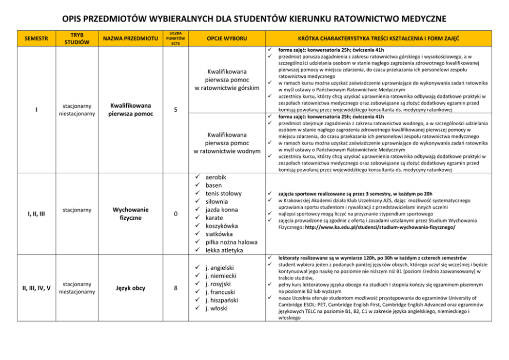 OPIS PRZEDMIOTÓW WYBIERALNYCH DLA STUDENTÓW KIERUNKU RATOWNICTWO MEDYCZNE SEMESTR TRYB STUDIÓW NAZWA PRZEDMIOTU LICZBA PUNKTÓW ECTS OPCJE WYBORU KRÓTKA CHARAKTERYSTYKA TREŚCI KSZTAŁCENIA I FORM ZAJĘĆ Kwalifikowana pierwsza pomoc w ratownictwie górskim I stacjonarny niestacjonarny Kwalifikowana pierwsza pomoc 5 Kwalifikowana pierwsza pomoc w ratownictwie wodnym I, II, III II, III, IV, V stacjonarny stacjonarny niestacjonarny Wychowanie fizyczne Język obcy 0 8 aerobik basen tenis stołowy siłownia jazda konna karate koszykówka siatkówka piłka nożna halowa lekka atletyka j. angielski j. niemiecki j. rosyjski j. francuski j. hiszpański j. włoski forma zajęć: konwersatoria 25h; ćwiczenia 41h przedmiot porusza zagadnienia z zakresu ratownictwa górskiego i wysokościowego, a w szczególności udzielania osobom w stanie nagłego zagrożenia zdrowotnego kwalifikowanej pierwszej pomocy w miejscu zdarzenia, do czasu przekazania ich personelowi zespołu ratownictwa medycznego w ramach kursu można uzyskać zaświadczenie uprawniające do wykonywania zadań ratownika w myśl ustawy o Państwowym Ratownictwie Medycznym uczestnicy kursu, którzy chcą uzyskać uprawnienia ratownika odbywają dodatkowe praktyki w zespołach ratownictwa medycznego oraz zobowiązane są złożyć dodatkowy egzamin przed komisją powołaną przez wojewódzkiego konsultanta ds. medycyny ratunkowej forma zajęć: konwersatoria 25h; ćwiczenia 41h przedmiot obejmuje zagadnienia z zakresu ratownictwa wodnego, a w szczególności udzielania osobom w stanie nagłego zagrożenia zdrowotnego kwalifikowanej pierwszej pomocy w miejscu zdarzenia, do czasu przekazania ich personelowi zespołu ratownictwa medycznego w ramach kursu można uzyskać zaświadczenie uprawniające do wykonywania zadań ratownika w myśl ustawy o Państwowym Ratownictwie Medycznym uczestnicy kursu, którzy chcą uzyskać uprawnienia ratownika odbywają dodatkowe praktyki w zespołach ratownictwa medycznego oraz zobowiązane są złożyć dodatkowy egzamin przed komisją powołaną przez wojewódzkiego konsultanta ds. medycyny ratunkowej zajęcia sportowe realizowane są przez 3 semestry, w każdym po 20h w Krakowskiej Akademii działa Klub Uczelniany AZS, dając możliwość systematycznego uprawiania sportu studentom i rywalizacji z przedstawicielami innych uczelni najlepsi sportowcy mogą liczyć na przyznanie stypendium sportowego zajęcia prowadzone są zgodnie z ofertą i zasadami ustalanymi przez Studium Wychowania Fizycznego: http://www.ka.edu.pl/studenci/studium-wychowania-fizycznego/ lektoraty realizowane są w wymiarze 120h, po 30h w każdym z czterech semestrów student wybiera jeden z podanych poniżej języków obcych, którego uczył się wcześniej i będzie kontynuował jego naukę na poziomie nie niższym niż B1 (poziom średnio zaawansowany) w trakcie studiów, pełny kurs lektoratowy języka obcego na studiach I stopnia kończy się egzaminem pisemnym na poziomie B2 lub wyższym nasza Uczelnia oferuje studentom możliwość przystępowania do egzaminów University of Cambridge ESOL: PET, Cambridge English First, Cambridge English Advanced oraz egzaminów językowych TELC na poziomie B1, B2, C1 w zakresie języka angielskiego, niemieckiego i włoskiego SEMESTR TRYB STUDIÓW NAZWA PRZEDMIOTU LICZBA PUNKTÓW ECTS OPCJE WYBORU KRÓTKA CHARAKTERYSTYKA TREŚCI KSZTAŁCENIA I FORM ZAJĘĆ Basen i ratownictwo wodne III lub V stacjonarny niestacjonarny Basen/ techniki wspinaczki 2 Techniki wspinaczki linowej i ratownictwo górskie Metodyka nauczania pierwszej pomocy IV stacjonarny niestacjonarny Metodyka nauczania 4 Metodyka nauczania kwalifikowanej pierwszej pomocy forma zajęć: zajęcia praktyczne 25h w ramach zajęć studenci przygotowują i prowadzą szkolenia z zakresu kwalifikowanej pierwszej pomocy dla członków jednostek współpracujących z systemem Państwowe Ratownictwo Medyczne forma zajęć: : konwersatoria 10h; ćwiczenia 40h w ramach zajęć studenci doskonalą techniki pływania stosowane w ratownictwie, nabywają umiejętność samoratownictwa, uczą się wykonywać skoki ratunkowe oraz poznają inne sposoby bezpiecznego wejścia do wody, trenują pływanie pod wodą i holowanie osoby zagrożonej oraz doskonalą postępowanie z osobą tonącą atrakcją zajęć sią ćwiczenia na wodach szybkopłynących Ratownictwo wodne IV stacjonarny niestacjonarny Obóz naukowo – sprawnościowy 6 Ratownictwo wysokościowe forma zajęć: konwersatoria 10h; ćwiczenia 20h zajęcia obejmują zagadnienia związane z ratownictwem wodnym i przygotowują do podejmowania działań ratowniczych w wodzie tematyka kursu obejmuje ramy prawne organizacji systemu ratownictwa wodnego w Polsce, pozwala także zapoznać się ze specjalistycznym sprzętem wykorzystywanym w ratownictwie wodnym oraz nabyć umiejętności bezpiecznego zachowania nad wodą, technik wydobycia tonącego z wody i pływania stosowanego w ratownictwie wodnym osoby zainteresowane mogą wziąć udział w dodatkowym kursie umożliwiającym zdobycie uprawnień ratownika wodnego forma zajęć: konwersatoria 10h; ćwiczenia 20h zajęcia obejmują zagadnienia związane z ratownictwem wysokościowym i przygotowują do podejmowania działań ratowniczych w górach tematyka kursu obejmuje ramy prawne organizacji systemu ratownictwa górskiego w Polsce, pozwala także zapoznać się ze specjalistycznym sprzętem wykorzystywanym w ratownictwie górskim oraz nabyć umiejętności technik wspinaczki linowej i postępowania z poszkodowanym w trudnych warunkach górskich lub na wysokości forma zajęć: zajęcia praktyczne 25h w ramach zajęć studenci przygotowują i prowadzą szkolenia z zakresu pierwszej pomocy dla osób dorosłych i dzieci w różnym wieku forma zajęć: : konwersatoria 10h; ćwiczenia 40h w ramach zajęć studenci samodzielnie budują stanowiska alpinistyczne, doskonalą techniki wspinaczkowe, zawiązywanie węzłów wspinaczkowych, poruszanie się po lin