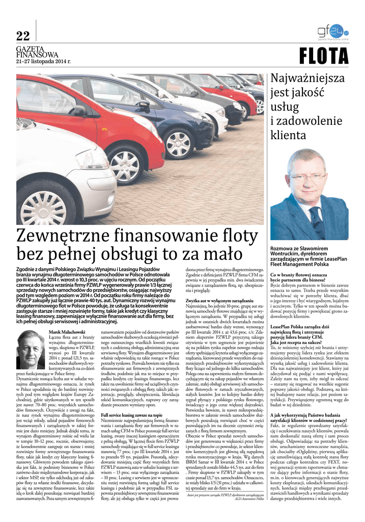 22 FLOTA 21–27 listopada 2014 r. Najważniejsza jest jakość usług i zadowolenie klienta Zewnętrzne finansowanie floty bez pełnej obsługi to za mało Zgodnie z danymi Polskiego Związku Wynajmu i Leasingu Pojazdów branża wynajmu długoterminowego samochodów w Polsce odnotowała po III kwartale 2014 r. wzrost o 10,3 proc. w ujęciu rocznym. Od początku czerwca do końca września firmy PZWLP wygenerowały prawie 1/3 łącznej sprzedaży nowych samochodów do przedsiębiorstw, osiągając najwyższy pod tym względem poziom w 2014 r. Od początku roku firmy należące do PZWLP zakupiły już łącznie prawie 40 tys. aut. Dynamiczny rozwój wynajmu długoterminowego flot w Polsce powoduje, że usługa ta konsekwentnie zastępuje starsze i mniej rozwinięte formy, takie jak kredyt czy klasyczny leasing finansowy, zapewniające wyłącznie finansowanie aut dla firmy, bez ich pełnej obsługi serwisowej i administracyjnej. Marek Małachowski Łączna flota aut z branży wynajmu długoterminowego, skupiona w PZWLP, wynosi po III kwartale 2014 r. ponad 121,5 tys. samochodów służbowych wykorzystywanych na co dzień przez funkcjonujące w Polsce firmy. Dynamicznie rosnąca liczba aut w usłudze wynajmu długoterminowego oznacza, że rynek w Polsce upodabnia się do bardziej rozwiniętych pod tym względem krajów Europy Zachodniej, gdzie użytkowanych w ten sposób jest nawet 70–80 proc. wszystkich samochodów firmowych. Oczywiście z uwagi na fakt, że nasz rynek wynajmu długoterminowego jest wciąż młody, udział pojazdów firmowych finansowanych i zarządzanych w takiej formie jest dużo mniejszy. Jednak dzięki temu, że wynajem długoterminowy rośnie od wielu lat w tempie 10–12 proc. rocznie, obserwujemy, że konsekwentnie zastępuje on starsze i mniej rozwinięte formy zewnętrznego finansowania floty, takie jak kredyt czy klasyczny leasing finansowy. Głównym powodem takiego zjawiska jest fakt, że podmioty biznesowe w Polsce zarówno duże międzynarodowe korporacje, jak i sektor MSP, nie tylko odchodzą już od zakupów floty za własne środki finansowe, decydując się na zewnętrzne finansowanie, lecz także idą o krok dalej poszukując rozwiązań bardziej zaawansowanych. Poza samym zewnętrznym fi- nansowaniem pojazdów od dostawców parków samochodów służbowych oczekują również pełnego outsourcingu wszelkich kwestii związanych z codzienną obsługą administracyjną oraz serwisową floty. Wynajem długoterminowy jest właśnie odpowiedzią na takie rosnące w Polsce potrzeby rynkowe. Pozwala bowiem nie tylko na sfinansowanie aut firmowych z zewnętrznych środków, podobnie jak ma to miejsce w przypadku kredytu czy leasingu finansowego, lecz także na uwolnienie firmy od uciążliwych czynności związanych z obsługą floty, takich jak: rejestracje, przeglądy, ubezpieczenia, likwidacja szkód komunikacyjnych, naprawy czy zarządzanie procesem wymiany opon. Full service leasing zawsze na topie Niezmiennie najpopularniejszą formą finansowania i zarządzania floty aut firmowych w ramach usług CFM w Polsce pozostaje full service leasing, zwany inaczej leasingiem operacyjnym z pełną obsługą. W łącznej flocie firm PZWLP samochody znajdujące się w full service leasingu stanowią 77 proc. i po III kwartale 2014 r. jest to przeszło 93 tys. pojazdów. Pozostałą, zdecydowanie mniejszą część floty wszystkich firm PZWLP stanowią auta w usłudze leasingu z serwisem – 13 proc. oraz wyłącznego zarządzania – 10 proc. Leasing z serwisem jest w uproszczeniu mniej rozwiniętą formą usługi full service leasingu i podobnie jak w przypadku FSL zapewnia przedsiębiorcy zewnętrzne finansowanie floty, ale jej obsługa tylko w części jest prowa- dzona przez firmę wynajmu długoterminowego. Zgodnie z definicjami PZWLP firma CFM zapewnia w jej przypadku min. dwa świadczenia związane z zarządzaniem flotą, np. ubezpieczenia i przeglądy. Zwyżka aut w wyłącznym zarządzaniu Najmniejszą, bo jedynie 10-proc. grupę aut stanowią samochody flotowe znajdujące się w wyłącznym zarządzaniu. W przypadku tej usługi jednak w ostatnich dwóch kwartałach można zaobserwować bardzo duży wzrost, wynoszący po III kwartale 2014 r. aż 43,6 proc. r./r. Zdaniem ekspertów PZWLP przyczyną takiego ożywienia w tym segmencie jest pojawienie się na polskim rynku zupełnie nowego rodzaju oferty spełniającej kryteria usługi wyłącznego zarządzania, kierowanej przede wszystkim do najmniejszych przedsiębiorców wykorzystujących floty liczące od jednego do kilku samochodów. Polega ona na zapewnieniu małym firmom decydującym się na zakup pojazdów we własnym zakresie, stałej obsługi serwisowej ich samochodów flotowych w ramach zryczałtowanych, stałych kosztów. Jest to kolejny bardzo dobry sygnał płynący z polskiego rynku flotowego, świadczący o jego coraz większej dojrzałości. Potwierdza bowiem, że nawet mikroprzedsiębiorstwa w zakresie swoich samochodów służbowych poszukują rozwiązań choć w części pozwalających im na zlecenie czynności związanych z flotą firmom zewnętrznym. Obecnie w Polsce sprzedaż nowych samochodów jest generowana w większości przez firmy i przedsiębiorców co powoduje, że sektor klientów komercyjnych jest główną siłą napędową rynku motoryzacyjnego w kraju. Wg danych IBRM Samar w III kwartale 2014 r. w Polsce sprzedanych zostało blisko 44,5 tys. aut do firm . Firmy skupione w PZWLP zakupiły w tym czasie ponad 13,7 tys. samochodów. Oznacza to, że miały blisko 1/3 (31 proc.) udziału w całkowitej sprzedaży aut do firm w kraju. Autor jest prezesem zarządu PZWLP, dyrektorem zarządzającym ALD Automotive Polska Rozmowa ze Sławomirem Wontruckim, dyrektorem zarządzającym w firmie LeasePlan Fleet Management Polska Co w branży flotowej oznacza bycie partnerem dla biznesu? Bycie dobrym partnerem w biznesie zawsze oznacza to samo. Trzeba przede wszystkim wsłuchiwać się w pot