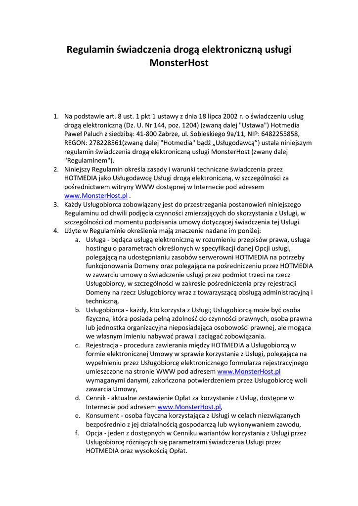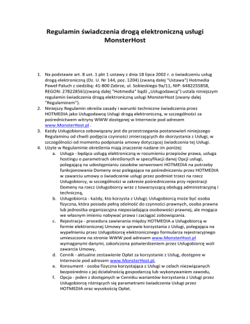 Regulamin świadczenia drogą elektroniczną usługi MonsterHost