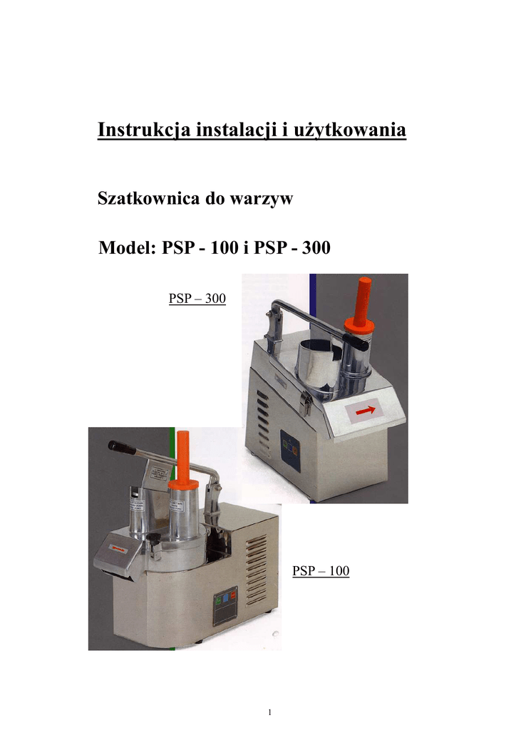 Instrukcja instalacji i użytkowania Szatkownica do warzyw Model: PSP - 100 i PSP - 300 PSP – 300 PSP – 100 1 Opis: Deklaracja zgodności z normami 3 Dane techniczne urządzenia 3 Kontrola opakowania i urządzenia 4 Ważne ostrzeżenia 4 Montrz i instalacja 5 Rodzaje tarcz 6 Napinanie paska napędzającego 7 Czyszczenie i utrzymanie 8 Postępowanie w przypatku awari 8 2 DEKLARACJA ZGODNOŚCI Producent oświadcza, że urządzenia spełniają wymogi obowiązujących norm polskich. Instalacja urządzenia musi być przeprowadzona według obowiązujących norm. Producent nie odpowiada za usterki powstałe na skutek nie odpowiedniego montażu wbrew instrukcji montażu i eksploatacji nie zgodnej z wytycznymi w instrukcji obsługi. Urządzenie mogą obsługiwać osoby, które zostały przeszkolone w ramach bezpiecznej obsługi i czyszczenia urządzenia. Dane techniczne Tabliczka znamionowa znajduje się na tylnej obudowie urządzenia. Przed instalacją urządzenia trzeba zapoznać się ze schematem elektrycznym. I informacjami umieszczonymi w instrukcji. Produkowane Wielkości Wysokość ( A ) Szerokość ( B ) Długość (C) PSP-100 PSP-300 200-300 kg/ godz 25 kg 43 cm 23 cm 53 cm 200-300 kg/godz 25 kg 51 cm 26 cm 49 cm PSP – 100 PSP – 300 3 Kontrola opakowania i urządzenia. Urządzenie jest wysyłane z naszego magazynu w oryginalnym opakowaniu, na którym są naklejone odpowiednie naklejki, które zabezpieczają odpowiedni przewóz urządzenia. Do opakowania jest zawsze dołączona instrukcja obsługi. Jeżeli jest opakowanie uszkodzone, należy spisać z firmą przewozową protokół o szkodzie. Ważne ostrzeżenia Instrukcja obsługi musi być dokładnie przeczytana, zawiera ona ważne informacje dotyczące bezpieczeństwa, instalacji i użytkowania urządzenia Urządzenie jest zgodne z normami Instrukcję obsługi należy zachować Urządzenie mogą obsługiwać jedynie osoby pełnoletnie Przy sprzedaży urządzenia następnej osobie dołączymy do urządzenia także niniejszą instrukcję obsługi Urządzenie może obsługiwać tylko przeszkolony użytkownik Urządzenie może być używane wyłącznie do szatkowania warzyw Urządzenie nie może być pozostawione włączone bez obsługi Zalecana jest raz w roku kontrola urządzenia przez przeszkolony serwis Przy ewentualnej naprawie mogą być użyte wyłącznie oryginalne części zamienne Urządzenie nie może być czyszczone wodą pod ciśnieniem Uszkodzone urządzenie należy wyłączyć z prądu i wezwać serwis : - rys 2 rys 4 Przed pierwszym uruchomieniem Należy przemyć urządzenie wodą z płynem i przepłukać czystą wodą. 4 MONTAŻ Szatkownice PSP 100 i PSP 300 są zabezpieczone dwoma zabezpieczeniami magnetycznym i mechanicznym mikrowyłacznikiem. Przyciśnięcie zielonego przycisku spowoduje uruchomienie urządzenia, trzeba skontrolowac czy silnik obraca się w dobrym kierunku ( strzałka na obudowie urządzenia) Przyciśnięcie przycisku czerwonego spowoduje zatrzymanie urządzenia. Przy regulacji urządzenia i wymianie tarcz trzeba wyłączyć urządzenie z sieci i zachować szczególną ostrożność. 1. 2. 3. 4. 5. 6. 7. 8. 9. odkręcić i odchylić śrubę rys.5 punkt1 i podnieść docisk podnieść wieko szatkownicy rys.6 punkt 2 włożyć tarczę odrzucającą rys.5 punkt3 potem tarczę do cięcia lub szatkowania rys5 punkt4 zamknąć pokrywę i zabezpieczyć rys.5a umieścić pojemnik pod otworem z którego będzie wypadać skrojona żywność do lewego otworu włorzyć jarzyny do szatkowania docisk pojemnika na jarzyny rys6 poz1 wsunąć plastykowy krążek do prawego otworu rys 5 załączyć przycisk START rys 3 punkt 1 zapali się kontrolka i urządzenie pracuje Obr.5 Obr.6 Obr.3 Obr.7 5 TYPY TARCZ : Tarcza do strugania Tarcza do plasterków Tarcza do drobnego makaronu Tarcza odrzucająca Niski Wysoki Tarcza do kostkowania Tarcza do frytek obr. 5 a obr. 6 a 6 obr. 3 a Napinanie paska napędzającego: - odkręcić śruby /obr.9/ - odsunąć pokrywę dna - zluzowac śruby mocujące silnik/obr.10,11/ - napiąć pasek przesuwająć silnik i dokręcić śruby obr. 11 ZAP. 380 V obr. 10 ZAP. 220 V obr. 9 MOTOR JEDNOFÁZOVÝ MOTOR TŘÍFÁZOVÝ LED. DIODA ZELENÁ BEZPEČNOSTNÍ MIKROSPÍNAČ STYKAČ Bezpečnostní termostat PRACOVNÍ MIKROSPÍNAČ Pracovní termostat TRANSFORMÁTOR 7 Dla bezpieczeństwa obsługi: urządzenie jest wyposażone w elektroniczne czujniki bezpieczeństwa, które nie pozwalają na uruchomienie urządzenia, jeżeli nie jest porawnie zainstalowany lub nie jest zabezpieczony osłoną bezpieczeństwa. Urządzenie jest wyposażone w funkcję, która nie pozwola na ponowne uruchomienie urządzenia, jeżeli doszło do wyłączenia napięcia sieci i jego późniejszego załączenia. Urządzenie w takim przypadku urochomimy naciśnięciem przycisku START Ważne Każda regulacja urządzenia musi być przeprowadzona przy wyłączonym urządzeniu. UWAGA! Gwarancją nie są objęte części ulegające zużyciu w trakcie codziennej eksploatacji (uszczelki, żarówki, szklane i plastykowe części itp. ). Użytkowanie niezgodne z przeznaczeniem oraz wbrew zaleceniom niniejszej instrukcji powoduję utratę gwarancji. Gwarancją nie są objęte usterki wynikłe z powodów niezależnych W RAZIE JAKIEJKOLWIEK AWARI NALEŻY URZĄDZENIE ODŁĄCZYĆ Z SIECI EL. 8