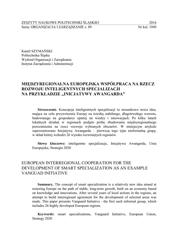 ZESZYTY NAUKOWE POLITECHNIKI ŚLĄSKIEJ Seria: ORGANIZACJA I ZARZĄDZANIE z. 89 2016 Nr kol. 1949 Kamil SZYMAŃSKI Politechnika Śląska Wydział Organizacji i Zarządzania Instytut Zarządzania i Administracji MIĘDZYREGIONALNA EUROPEJSKA WSPÓŁPRACA NA RZECZ ROZWOJU INTELIGENTNYCH SPECJALIZACJI NA PRZYKŁADZIE „INICJATYWY AWANGARDA” Streszczenie. Koncepcja inteligentnych specjalizacji to stosunkowo nowa idea, mająca na celu przywrócenie Europy na ścieżkę stabilnego, długotrwałego wzrostu, budowanego na gospodarce opartej na wiedzy i innowacjach. Po kilku latach lokalnych działań w regionach podjęto próbę zbudowania międzyregionalnego porozumienia na rzecz rozwoju wybranych obszarów. W niniejszym artykule zaprezentowano Inicjatywę Awangarda – pierwszą tego typu nieformalną grupę, w skład której wchodzi 26 wysoko rozwiniętych regionów. Słowa kluczowe: inteligentne specjalizacje, Inicjatywa Awangarda, Unia Europejska, Strategia 2020 EUROPEAN INTERREGIONAL COOPERATION FOR THE DEVELOPMENT OF SMART SPECIALIZATION AS AN EXAMPLE VANGUAD INITIATIVE Summary. The concept of smart specialization is a relatively new idea aimed at restoring Europe on the path of stable, long-term growth, built on an economy based on knowledge and innovations. After several years of local actions in the regions, an attempt to build interregional agreement for the development of selected areas was made. This paper presents Vanguard Initiative - the first such informal group, which includes 26 highly developed European regions. Keywords: smart specializations, Vanguard Initiative, European Union, Strategy 2020 454 K. Szymański 1. Wprowadzenie Wraz z ogłoszeniem dokumentu „Europa 2020 – Strategia na rzecz inteligentnego i zrównoważonego rozwoju sprzyjającego włączeniu społecznego” Unia Europejska zdecydowała się budować zrównoważoną przyszłość na podstawie długoterminowego horyzontu celów. Głównym zamiarem wprowadzenia do życia tej Strategii była chęć powrotu na ścieżkę trwałego wzrostu. Jednym z głównych założeń, aby ten cel osiągnąć, było budowanie inteligentnego rozwoju w ramach gospodarki opartej na wiedzy oraz innowacji [Komisja Europejska, 2010]. Zgodnie z wytycznymi zawartymi w strategii Europa 2020 przez kilka lat wszystkie kraje i regiony UE opracowywały swoje krajowe oraz regionalne strategie innowacji, w których identyfikowano regionalne, inteligentne specjalizacje, czyli obszary, w których poszczególne regiony mają szczególny potencjał do rozwoju, aby stać się liderem na światową skalę. Bardzo szybko zauważono, że zdecydowanie lepsze efekty będzie można osiągnąć podejmując międzyregionalną współpracę na rzecz rozwoju wybranych obszarów. Niniejszy artykuł opisuje jedno z pierwszych tego typu nieformalnych porozumień, które zrzesza wybrane wysoko rozwinięte europejskie regiony – Inicjatywę Awangarda. 2. Inteligentne specjalizacje Jedną z głównych przyczyn, która doprowadziła do wypracowania koncepcji inteligentnych specjalizacji była pierwsza fala kryzysu ekonomicznego, która dosięgnęła Europę w drugiej połowie pierwszej dekady XXI wieku. Kryzys ten spowodował brak realizacji wielu zakładanych wskaźników, powodując tym samym konieczność weryfikacji założeń strategii lizbońskiej – obowiązującego od 2000 roku, strategicznego dokumentu Unii Europejskiej 1. Efektem tych prac było opracowanie i zatwierdzenie przez Radę Europy 17 czerwca 2010 r. nowego programu „Europa 2020 – strategia na rzecz inteligentnego i zrównoważonego rozwoju sprzyjająca włączeniu społecznemu”. Założenia tego programu nawiązują do wielu znanych koncepcji rozwoju regionalnego, takich jak teoria produktu podstawowego czy teoria elastycznej produkcji. Idea inteligentnej specjalizacji została szerzej opisana w komunikacie Komisji Europejskiej „Polityka regionalna jako czynnik przyczyniający się do inteligentnego rozwoju w ramach strategii Europa 2020”. Komisja wskazuje w nim na szczególną rolę polityki regionalnej dla uwolnienia potencjału wzrostu 1 Nowak P.: Inteligentne specjalizacje regionów – moda czy konieczność? „Studia Ekonomiczne i Regionalne“, Vol. 7, No. 1, 2014. Międzyregionalna europejska współpraca… 455 UE. Cel ten ma zostać osiągnięty przez tworzenie korzystnych warunków dla innowacji, edukacji i badań, propagując w ten sposób inwestycje w badania i rozwój oraz wiedzę, a także prowadzenie działań oferujących wyższą wartość dodaną 2. Dokument ten wskazuje strategię inteligentnej specjalizacji, jako główne narzędzie dla szybkiego rozwoju najbardziej obiecujących obszarów w poszczególnych regionach. Inteligentna specjalizacja to jednocześnie koncepcja oraz narzędzie do określania i budowania obecnej oraz przyszłej pozycji regionu lub państwa w gospodarce opartej na wiedzy3. Jak zauważa M. Kardas 4, istota koncepcji inteligentnej specjalizacji została oparta na czterech głównych założeniach: − Aby koncepcja inteligentnej specjalizacji przyniosła oczekiwane efekty, konieczne jest utworzenie odpowiednio dużego obszaru badań i innowacji w celu umożliwienia rywalizacji pomiędzy wieloma konkurującymi podmiotami i umożliwić lepsze wykorzystanie efektów: skali, zakresu i rozprzestrzeniania (ang. spillover effects). − Znaczna liczba europejskich regionów lub państw konkurujących o pozycję lidera w tych samych dziedzinach sprawi, że większość z nich nie osiągnie obranego celu, ze względu na brak odpowiedniej masy krytycznej oraz efektów skali i zakresu. − Istotę koncepcji inteligentnych specjalizacji określają tzw. technologie ogólnego zastosowania (ang. general purpose technologies, GPTs). Są one powszechnie definiowane przez wskazanie ich charakterystycznych cech, do których można zaliczyć m.in. stosowanie w wielu obszarach ludzkiej aktywności, bycie przedmiotem nieustannych doskonaleń, stosowanie 