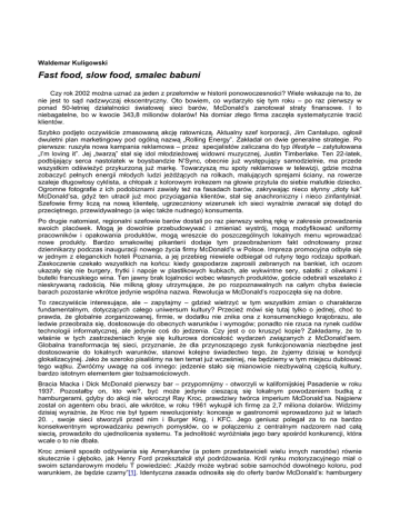 Waldemar Kuligowski Fast food, slow food, smalec babuni Czy rok 2002 można uznać za jeden z przełomów w historii ponowoczesności? Wiele wskazuje na to, że nie jest to sąd nadzwyczaj ekscentryczny. Oto bowiem, co wydarzyło się tym roku – po raz pierwszy w ponad 50-letniej działalności światowej sieci barów, McDonald’s zanotował straty finansowe. I to niebagatelne, bo w kwocie 343,8 milionów dolarów! Na domiar złego firma zaczęła systematycznie tracić klientów. Szybko podjęto oczywiście zmasowaną akcję ratowniczą. Aktualny szef korporacji, Jim Cantalupo, ogłosił dwuletni plan marketingowy pod ogólną nazwą „Rolling Energy”. Zakładał on dwie generalne strategie. Po pierwsze: ruszyła nowa kampania reklamowa – przez specjalistów zaliczana do typ lifestyle – zatytułowana „I’m loving it”. Jej „twarzą” stał się idol młodzieżowej widowni muzycznej, Justin Timberlake. Ten 22-latek, podbijający serca nastolatek w boysbandzie N’Sync, obecnie już występujący samodzielnie, ma przede wszystkim odświeżyć przykurzoną już markę. Towarzyszą mu spoty reklamowe w telewizji, gdzie można zobaczyć pełnych energii młodych ludzi jeżdżących na rolkach, malujących sprejami ściany, na rowerze szaleje długowłosy cyklista, a chłopak z kolorowym irokezem na głowie przytula do siebie malutkie dziecko. Ogromne fotografie z ich podobiznami zawisły też na fasadach barów, zakrywając nieco słynny „złoty łuk” McDonald’sa, gdyż ten utracił już moc przyciągania klientów, stał się anachroniczny i nieco zinfantylniał. Szefowie firmy liczą na nową klientelę, ugrzeczniony wizerunek ich sieci wyraźnie zwracał się dotąd do przeciętnego, przewidywalnego (a więc także nudnego) konsumenta. Po drugie natomiast, regionalni szefowie barów dostali po raz pierwszy wolną rękę w zakresie prowadzenia swoich placówek. Mogą je dowolnie przebudowywać i zmieniać wystrój, mogą modyfikować uniformy pracowników i opakowania produktów, mogą wreszcie do poszczególnych lokalnych menu wprowadzać nowe produkty. Bardzo smakowitej pikanterii dodaje tym przeobrażeniom fakt odnotowany przez dziennikarzy podczas inauguracji nowego życia firmy McDonald’s w Polsce. Impreza promocyjna odbyła się w jednym z eleganckich hoteli Poznania, a jej przebieg niewiele odbiegał od rutyny tego rodzaju spotkań. Zaskoczenie czekało wszystkich na końcu: kiedy gospodarze zaprosili zebranych na bankiet, ich oczom ukazały się nie burgery, frytki i napoje w plastikowych kubkach, ale wykwintne sery, sałatki z oliwkami i butelki francuskiego wina. Ten jawny brak lojalności wobec własnych produktów, goście odebrali wszelako z nieskrywaną radością. Nie milkną głosy utrzymujące, że po rozpoznawalnych na całym chyba świecie barach pozostanie wkrótce jedynie wspólna nazwa. Rewolucja w McDonald’s rozpoczęła się na dobre. To rzeczywiście interesujące, ale – zapytajmy – gdzież wietrzyć w tym wszystkim zmian o charakterze fundamentalnym, dotyczących całego uniwersum kultury? Przecież mówi się tutaj tylko o jednej, choć to prawda, że globalnie zorganizowanej, firmie, w dodatku nie znika ona z konsumenckiego krajobrazu, ale ledwie przeobraża się, dostosowuje do obecnych warunków i wymogów; ponadto nie rzuca na rynek cudów technologii informatycznej, ale jedynie coś do jedzenia. Czy jest o co kruszyć kopie? Zakładamy, że to właśnie w tych zastrzeżeniach kryje się kulturowa doniosłość wydarzeń związanych z McDonald’sem. Globalna transformacja tej sieci, przyznanie, że dla przynoszącego zysk funkcjonowania niezbędne jest dostosowanie do lokalnych warunków, stanowi kolejne świadectwo tego, że żyjemy dzisiaj w kondycji glokalizacyjnej. Jako że szeroko pisaliśmy na ten temat już wcześniej, nie będziemy w tym miejscu dublować tego wątku. Zwróćmy uwagę na coś innego: jedzenie stało się mianowicie niezbywalną częścią kultury, bardzo istotnym elementem gier tożsamościowych. Bracia Macka i Dick McDonald pierwszy bar – przypomnijmy - otworzyli w kalifornijskiej Pasadenie w roku 1937. Pozostałby on, kto wie?, być może jedynie cieszącą się lokalnym powodzeniem budką z hamburgerami, gdyby do akcji nie wkroczył Ray Kroc, prawdziwy twórca imperium McDonald’sa. Najpierw został on agentem obu braci, ale wkrótce, w roku 1961 wykupił ich firmę za 2,7 miliona dolarów. Widzimy dzisiaj wyraźnie, że Kroc nie był typem rewolucjonisty: koncesje w gastronomii wprowadzono już w latach 20. , swoje sieci stworzyli przed nim i Burger King, i KFC. Jego geniusz polegał za to na bardzo konsekwentnym wprowadzaniu pewnych pomysłów, co w połączeniu z centralnym nadzorem nad całą siecią, prowadziło do ujednolicenia systemu. Ta jednolitość wyróżniała jego bary spośród konkurencji, która wcale o to nie dbała. Kroc zmienił sposób odżywiania się Amerykanów (a potem przedstawicieli wielu innych narodów) równie skutecznie i głęboko, jak Henry Ford przekształcił styl podróżowania. Król rynku motoryzacyjnego miał o swoim sztandarowym modelu T powiedzieć: „Każdy może wybrać sobie samochód dowolnego koloru, pod warunkiem, że będzie czarny”[1]. Identyczna zasada odnosiła się do oferty barów McDonald’s: hamburgery były jednakowe, klientom skutecznie odradzono kierowanie się osobistym gustem. Zwróćmy uwagę na jeszcze jedną, jakże istotną, zbieżność między strategiami Forda i Kroca – żywienie się w barach sprzedających fast food przypominało przecież tankowanie paliwa do pustego baku samochodu. Jeśli ktoś poczuł głód, mógł zaspokoić go gdzieś w przydrożnym punkcie, licząc na maksymalnie szybką i skuteczną obsługę, dzięki której czerwona lampka potrzeby mogła zgasnąć. Nic ponadto, ale i nic poniżej. Jedno jest pewne - Kroc postawił na racjonalność. Pierwszy zaczął używać mrożonych frytek i mięsa, pierwszy 