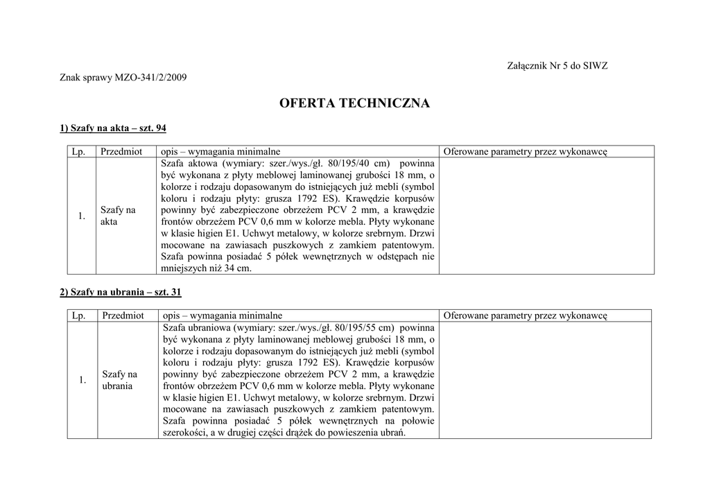 Załącznik Nr 5 do SIWZ Znak sprawy MZO-341/2/2009 OFERTA TECHNICZNA 1) Szafy na akta – szt. 94 Lp. 1. Przedmiot Szafy na akta opis – wymagania minimalne Oferowane parametry przez wykonawcę Szafa aktowa (wymiary: szer./wys./gł. 80/195/40 cm) powinna być wykonana z płyty meblowej laminowanej grubości 18 mm, o kolorze i rodzaju dopasowanym do istniejących juŜ mebli (symbol koloru i rodzaju płyty: grusza 1792 ES). Krawędzie korpusów powinny być zabezpieczone obrzeŜem PCV 2 mm, a krawędzie frontów obrzeŜem PCV 0,6 mm w kolorze mebla. Płyty wykonane w klasie higien E1. Uchwyt metalowy, w kolorze srebrnym. Drzwi mocowane na zawiasach puszkowych z zamkiem patentowym. Szafa powinna posiadać 5 półek wewnętrznych w odstępach nie mniejszych niŜ 34 cm. 2) Szafy na ubrania – szt. 31 Lp. 1. Przedmiot Szafy na ubrania opis – wymagania minimalne Oferowane parametry przez wykonawcę Szafa ubraniowa (wymiary: szer./wys./gł. 80/195/55 cm) powinna być wykonana z płyty laminowanej meblowej grubości 18 mm, o kolorze i rodzaju dopasowanym do istniejących juŜ mebli (symbol koloru i rodzaju płyty: grusza 1792 ES). Krawędzie korpusów powinny być zabezpieczone obrzeŜem PCV 2 mm, a krawędzie frontów obrzeŜem PCV 0,6 mm w kolorze mebla. Płyty wykonane w klasie higien E1. Uchwyt metalowy, w kolorze srebrnym. Drzwi mocowane na zawiasach puszkowych z zamkiem patentowym. Szafa powinna posiadać 5 półek wewnętrznych na połowie szerokości, a w drugiej części drąŜek do powieszenia ubrań. 3) Regały na akta – szt. 34 Lp. Przedmiot 1. Regały na akta opis – wymagania minimalne Oferowane parametry przez wykonawcę Regał (wymiary: szer./wys./gł. 80/195/40 cm) powinien być wykonany z płyty meblowej laminowanej grubości 18 mm, o kolorze i rodzaju dopasowanym do istniejących mebli (symbol koloru i rodzaju płyty: grusza 1792 ES). Krawędzie powinny być zabezpieczone obrzeŜem PCV 2 mm, w kolorze mebla. Płyty wykonane w klasie higien E1. Regał powinien posiadać 5 przestrzeni na segregatory w odstępach nie mniejszych niŜ 34 cm. Regał powinien posiadać tylną płytę w kolorze białym. 4) Stoliki okolicznościowe – szt. 24 Lp. 1. Przedmiot Stoliki okolicznościowe opis – wymagania minimalne Oferowane parametry przez wykonawcę Blat stolika (wymiary blatu 80/80 cm wys.73,5 cm) powinien być wykonany z płyty meblowej laminowanej grubości 25 mm, o kolorze dopasowanym do istniejących mebli (symbol koloru i rodzaju płyty: grusza 1792 ES). Krawędzie powinny być zabezpieczone obrzeŜem PCV 2 mm, w kolorze mebla. Płyta wykonana w klasie higien E1. Stolik powinien posiadać cztery stabilne nogi metalowe chromowane z regulacją do 3 cm. 5) Krzesła obrotowe – szt. 60 Lp. Przedmiot opis – wymagania minimalne Oferowane parametry przez wykonawcę Krzesło obrotowe tapicerowane z mechanizmem umoŜliwiający regulację kąta pochylenia oparcia , wysokości oparcia oraz odległości oparcia względem siedziska. Krzesło powinno posiadać regulację wysokości siedziska za pomocą kolumny gazowej . Tapicerka z odpornością na ścieranie: 35.000 cykli, odporność na peelling: 5 oraz trudno zapalność: atest EN 1021-1 (papieros) Kolor tapicerki i pozostałych elementów czarny. Podłokietniki i 1. Krzesła obrotowe podstawa krzesła wykonana z tworzywa sztucznego. Wymiary krzesła: - wysokość całkowita: od 915mm 1105mm - wysokość oparcia : od 465mm do 525m - wysokość siedziska : od 450mm do 580mm - wysokość podłokietników : max. 205mm - głębokość siedziska : od 420mm do 455mm - szerokość siedziska : od 460 mm do 470mm - szerokość całkowita : max. fi 650mm 6) Krzesła konferencyjne – szt. 30 Lp. Przedmiot opis – wymagania minimalne Krzesło konferencyjne tapicerowane wybrane elementy metalowe fotela pokryte farbą proszkową w kolorze czarnym. Tapicerka z odpornością na ścieranie: 35.000 cykli, odporność na peelling: 5 oraz trudno zapalność: atest EN 1021-1 (papieros). Kolor tapicerki czarny. Wymagana moŜliwość sztaplowania, czyli wkładania Krzesła jednego krzesła w drugie. Wymiary krzesła: 1. konferencyjne - wysokość całkowita: 830 mm - wysokość oparcia: 330 mm - szerokość oparcia 480 mm - wysokość siedziska: 500 mm - głębokość siedziska: 435 mm - szerokość siedziska: 470 mm Oferowane parametry przez wykonawcę 7) Krzesła konferencyjne z podkładką – szt. 100 Lp. 1. Przedmiot Krzesła konferencyjne z podkładką opis – wymagania minimalne Krzesło konferencyjne tapicerowane, wybrane elementy metalowe fotela pokryte farbą proszkową w kolorze czarnym. Tapicerka z odpornością na ścieranie: 35.000 cykli, odporność na peelling: 5 oraz trudno zapalność: atest EN 1021-1 (papieros) ze składaną podkładką do pisania w kolorze czarnym. Wymagana moŜliwość sztaplowania, czyli wkładania jednego krzesła w drugie. Kolor tapicerki szary, Wymiary krzesła: - wysokość całkowita: 830 mm - wysokość oparcia: 330 mm - szerokość oparcia: 480 mm - wysokość siedziska:500 mm - głębokość siedziska: 435 mm - szerokość siedziska: 470 mm - wysokość na której przymocowana jest podkładka do pisania: 730 mm - długość podkładki do pisania 260 mm - szerokość podkładki do pisania 350 mm Oferowane parametry przez wykonawcę opis – wymagania minimalne Krzesło o chromowanej aluminiowej ramie, siedzisko okrągłe tapicerowane skajem. Kolor jasny brąz. Wymiary krzesła: Oferowane parametry przez wykonawcę 8) krzesła kuchenne – szt. 12 Lp. 1. Przedmiot Krzesła kuchenne - średnica siedziska: 400 mm - wysokość siedziska: 440 mm - wysokość całkowita 860 mm 9) Szafy aktowe metalowe – szt. 5 Lp. 1. Przedmiot Szafy aktowe metalowe opis – wymagania minimalne Szafa biurowa z drzwiami uchylnymi (wymiary: szer./wys./gł. 100/200/43,5 cm), 4 półki uŜytkowe do regulacji, malowana na szaro proszkowo o duŜej wytrzymałości na warunki atmosferyczne oraz promienie UV. Wieniec szafy wykonany z b
