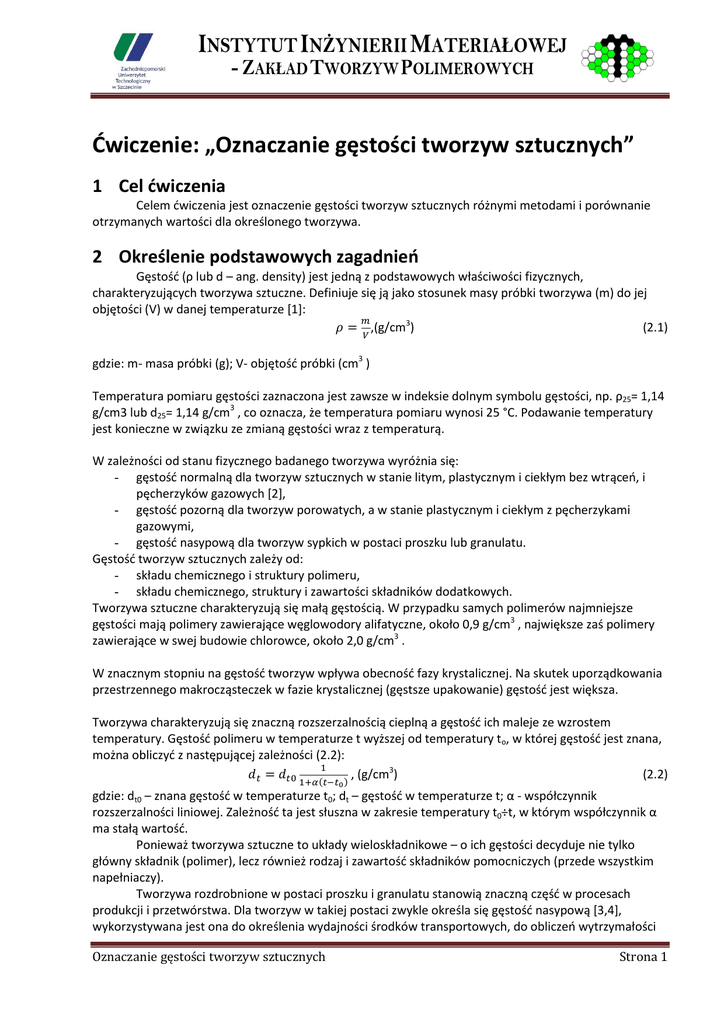 INSTYTUT INŻYNIERII MATERIAŁOWEJ - ZAKŁAD TWORZYW POLIMEROWYCH crosoft Word - 22.doc Ćwiczenie: „Oznaczanie gęstości tworzyw sztucznych” 1 Cel ćwiczenia Celem ćwiczenia jest oznaczenie gęstości tworzyw sztucznych różnymi metodami i porównanie otrzymanych wartości dla określonego tworzywa. 2 Określenie podstawowych zagadnień Gęstość (ρ lub d – ang. density) jest jedną z podstawowych właściwości fizycznych, charakteryzujących tworzywa sztuczne. Definiuje się ją jako stosunek masy próbki tworzywa (m) do jej objętości (V) w danej temperaturze [1]: 𝑚 𝜌 = 𝑉 ,(g/cm3) (2.1) gdzie: m- masa próbki (g); V- objętość próbki (cm3 ) Temperatura pomiaru gęstości zaznaczona jest zawsze w indeksie dolnym symbolu gęstości, np. ρ25= 1,14 g/cm3 lub d25= 1,14 g/cm3 , co oznacza, że temperatura pomiaru wynosi 25 °C. Podawanie temperatury jest konieczne w związku ze zmianą gęstości wraz z temperaturą. W zależności od stanu fizycznego badanego tworzywa wyróżnia się: - gęstość normalną dla tworzyw sztucznych w stanie litym, plastycznym i ciekłym bez wtrąceń, i pęcherzyków gazowych [2], - gęstość pozorną dla tworzyw porowatych, a w stanie plastycznym i ciekłym z pęcherzykami gazowymi, - gęstość nasypową dla tworzyw sypkich w postaci proszku lub granulatu. Gęstość tworzyw sztucznych zależy od: - składu chemicznego i struktury polimeru, - składu chemicznego, struktury i zawartości składników dodatkowych. Tworzywa sztuczne charakteryzują się małą gęstością. W przypadku samych polimerów najmniejsze gęstości mają polimery zawierające węglowodory alifatyczne, około 0,9 g/cm3 , największe zaś polimery zawierające w swej budowie chlorowce, około 2,0 g/cm3 . W znacznym stopniu na gęstość tworzyw wpływa obecność fazy krystalicznej. Na skutek uporządkowania przestrzennego makrocząsteczek w fazie krystalicznej (gęstsze upakowanie) gęstość jest większa. Tworzywa charakteryzują się znaczną rozszerzalnością cieplną a gęstość ich maleje ze wzrostem temperatury. Gęstość polimeru w temperaturze t wyższej od temperatury to, w której gęstość jest znana, można obliczyć z następującej zależności (2.2): 1 𝑑𝑡 = 𝑑𝑡0 1+𝛼(𝑡−𝑡 ) , (g/cm3) (2.2) 0 gdzie: dt0 – znana gęstość w temperaturze t0; dt – gęstość w temperaturze t; α - współczynnik rozszerzalności liniowej. Zależność ta jest słuszna w zakresie temperatury t0÷t, w którym współczynnik α ma stałą wartość. Ponieważ tworzywa sztuczne to układy wieloskładnikowe – o ich gęstości decyduje nie tylko główny składnik (polimer), lecz również rodzaj i zawartość składników pomocniczych (przede wszystkim napełniaczy). Tworzywa rozdrobnione w postaci proszku i granulatu stanowią znaczną część w procesach produkcji i przetwórstwa. Dla tworzyw w takiej postaci zwykle określa się gęstość nasypową [3,4], wykorzystywana jest ona do określenia wydajności środków transportowych, do obliczeń wytrzymałości Oznaczanie gęstości tworzyw sztucznych Strona 1 INSTYTUT INŻYNIERII MATERIAŁOWEJ - ZAKŁAD TWORZYW POLIMEROWYCH crosoft Word - 22.doc zbiorników dla tworzyw rozdrobnionych, do obliczenia pojemności komór zasypowych w procesie prasowania. Przy pomiarze gęstości nasypowej za objętość przyjmuje się objętość tworzywa zgranulowanego łącznie z pustymi przestrzeniami pomiędzy granulkami. Gęstość nasypowa zależy od rozdrobnienia tworzywa i sposobu ułożenia granulek w naczyniu pomiarowym. Na ułożenie granulek wpływa wiele czynników: sposób wysypywania rozdrobnionego tworzywa do naczynia pomiarowego, wysokość wysypywania, wymiary naczynia pomiarowego. Przy wysypywaniu tworzyw drobnoziarnistych i proszkowych mogą wystąpić zakłócenia poprzez tworzenie się sklepień nad otworem lub powstawanie ścian pionowych. Zjawiska te zostały uwzględnione przy opracowaniu metod pomiaru gęstości nasypowej tworzyw o różnym stopniu rozdrobnienia. Tworzywa porowate ze względu na budowę komórkową charakteryzują się bardzo dobrymi właściwościami izolacyjnymi, dlatego też znajdują szerokie zastosowanie użytkowe. W tworzywach porowatych przestrzeń wypełniona powietrzem może zajmować do 90% objętości, to powoduje, że gęstość pozorna tworzyw porowatych zawiera się w szerokim zakresie wartości [5,6]. Metody pomiarowe gęstości: - metoda pomiaru objętości i masy - metoda hydrostatyczna - metoda kolby Le Chatéliera - metoda piknometryczna - metoda flotacyjna - metoda kolumny gradientowej (próbki o wymiarach liniowych nie większych niż 5 mm i kształtach umożliwiających określenie położenia środka geometrycznego). 3 Metody 3.1 Metoda pomiaru objętości i masy I 3.1.1 Zakres stosowania metody Metoda dotyczy próbek o kształtach całkowicie regularnych a więc próbek prostopadłościennych, odcinków rur i prętów okrągłych o równomiernym przekroju na całej długości o objętości nie większej 1000 mm3 i masie nie przekraczającej 180g. 3.1.2 Opis metody Metoda polega na zważeniu próbki, określeniu jej objętości na podstawie pomiaru liniowych wymiarów próbki tworzywa sztucznego i obliczeniu gęstości jako ilorazu masy i objętości (wzór 2.1). 3.1.3 Przyrząd pomiarowy - Przyrządem pomiarowym w tej metodzie są: waga laboratoryjna umożliwiająca zważenie próbki z dokładnością do 0,5 % masy próbki, suwmiarka lub inny przyrząd pomiarowy umożliwiający pomiar próbki z dokładnością do 0,1 mm. 3.1.4 Wykonanie pomiaru 1. próbkę zważyć na wadze laboratoryjnej z dokładnością 0,5% jej masy. 2. przy pomocy suwmiarki odczytać wszystkie wymiary próbki z dokładnością 0,1 mm i obliczyć jej objętość. 3. podstawić odczytane wartości do wzoru 2.1 i obliczyć gęstość tworzywa, z którego jest wykonana próbka. 3.2 Metoda pomiaru objętości i masy II 3.2.1 Zakres stosowania metody Oznaczanie gęstośc