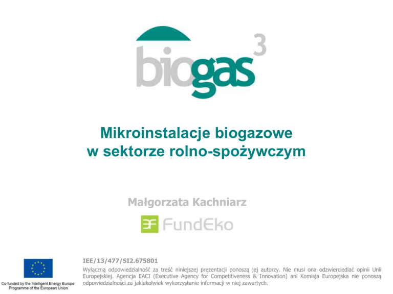 Sustainable small-scale biogas production from agrofoodMikroinstalacje waste for energybiogazowe self-sufficiency w sektorze rolno-spożywczym Małgorzata Kachniarz IEE/13/477/SI2.675801 Wyłączną odpowiedzialność za treść niniejszej prezentacji ponoszą jej autorzy. Nie musi ona odzwierciedlać opinii Unii Legal disclaimer: The sole responsibility the content of this publication lies with the authors. It does not necessarily reflect Europejskiej. Agencja EACI (Executive for Agency for Competitiveness & Innovation) ani Komisja Europejska nie ponoszą the opinion of the European Union. Neither the EACI nor the European Commission are responsible for any use that may be odpowiedzialności za jakiekolwiek wykorzystanie informacji w niej zawartych. made of the information contained therein. Plan prezentacji 1. 2. 3. 4. 5. 6. 7. 8. Wprowadzenie do projektu BIOGAS3 Substraty do produkcji biogazu rolniczego Koncepcja mikrobiogazowni w sektorze rolno-spożywczym Koszty inwestycyjne Technologie Aspekty prawne Bariery i perspektywy rozwoju rynku Przykałdy mikrobiogazowni www.biogas3.eu Biomasa - Energia Biznesu 2015, 30.10.2015 Projekt BIOGAS3 • realizowany w ramach programu UE Inteligentna Energia – Europa (IEE) • ma na celu promowanie zrównoważonej, małoskalowej (<100 kWel) produkcji energii odnawialnej z biogazu na bazie odpadów rolniczych oraz pochodzących z przemysłu żywności i napojów (odpady rolno-spożywcze), umożliwiającej osiągnięcie samowystarczalności energetycznej www.biogas3.eu Biomasa - Energia Biznesu 2015, 30.10.2015 Konsorcjum projektowe BIOGAS3 Organizacje partnerskie: AINIA, FIAB (Hiszpania) ACTIA, IFIP (Francja) TCA, DEIAFA (Włochy) RENAC (Niemcy) FUNDEKO (Polska) JTI (Szwecja) IrBEA (Irlandia) www.biogas3.eu Biomasa - Energia Biznesu 2015, 30.10.2015 Dlaczego biogaz w sektorze rolno-spożywczym? • wysokie zapotrzebowanie na energię (ogrzewanie, przetwarzanie, pakowanie, przechowywanie, etc.) • duża ilość wytwarzanych odpadów organicznych • wydatki na energię i zagospodarowanie odpadów stanowią często znaczny koszt dla firmy • głównie małe i średnie przedsiębiorstwa www.biogas3.eu Biomasa - Energia Biznesu 2015, 30.10.2015 Z czego można wyprodukować biogaz rolniczy? • Odpady rolnicze – Odchody zwierzęce – Odpady roślinne – Uprawy energetyczne (celowe) • Odpady z przemysłu spożywczego – Odpady z produkcji mięsa i ryb – Odpady mleczarskie – Odpady browarnicze i gorzelniane – Odpady z przetwórstwa warzyw i owoców – Odpady z gastronomii, resztki żywności –… www.biogas3.eu Biomasa - Energia Biznesu 2015, 30.10.2015 Potencjalne oszczędności wydatków na energię Substrat Zaw. suchej masy org. Energia Wartość en. Wartość en. Zawarto Energia elektr. Energia Uzysk ciepl. ść pierwot (netto) cieplna (netto) elektr. biogazu metanu na 35% 40% 55 gr/kWh 20 gr/kWh Jednostka: [%] [m3/t ŚM] % kWh/t kWh/t kWh/t zł zł Gnojowica świńska 6 20 60 120 42 48 23,10 zł 9,60 zł Serwatka 8,5 58,5 53 310 109 124 59,95 zł 24,80 zł Młóto browarniane 25 152 62 942 330 357 181,50 zł 71,40 zł Łupiny i pulpa ziemniaczana 19 108 54 540 189 216 103,95 zł 43,20 zł Odpady z rzeźni 15 60 55 300 105 120 57,75 zł 24,00 zł 77 570 53 3021 1027 1208 564,85 zł 241,60 zł 35 216 52 1123 393 449 216,15 zł 89,80 zł Chleb i odpady piekarnicze Kiszonka kukurydziana www.biogas3.eu Biomasa - Energia Biznesu 2015, 30.10.2015 Mikrobiogazownia w sektorze rolno-spożywczym www.biogas3.eu Biomasa - Energia Biznesu 2015, 30.10.2015 Mikrobiogazownia w przedsiębiorstwie rolno-spożywczym • Zagospodarowanie własnych odpadów organicznych – uniezależnienie od zewnętrznych dostaw i wahań cen rynkowych biomasy = zmniejszenie ryzyka – oszczędność czasu i kosztów (transportu i zagospodarowania odpadów) – dodatkowa korzyść dla gospodarstw rolnych: uzyskanie wartościowego nawozu organicznego • Dostarczenie energii elektrycznej i cieplnej – pokrycie zapotrzebowania przedsiębiorstwa na energię elektryczną i cieplną – samowystarczalność energetyczna – poprawa efektywności energetycznej przedsiębiorstwa – redukcja wydatków na energię elektryczną i cieplną – możliwość uzyskania dodatkowych dochodów ze sprzedaży nadwyżki energii elektrycznej i cieplnej – zmniejszenie obciążeń dla środowiska (m.in. ograniczenie emisji CO2) www.biogas3.eu Biomasa - Energia Biznesu 2015, 30.10.2015 Koszty inwestycyjne • Koszty inwestycyjne mikrobiogazowni Moc zainstalowana (kWel) 10 – 40 kW Przedział cenowy 80 000 – 400 000 € • Im mniejsza biogazownia tym wyższe koszty inwestycji w przeliczeniu na kW mocy zainstalowanej • Uzależnienie m.in. od: – Rodzaju biomasy – Zastosowanej technologii – Lokalizacji – Przepisów sanitarnych i przepisów dot. bezpieczeństwa – …. www.biogas3.eu Biomasa - Energia Biznesu 2015, 30.10.2015 Jak obniżyć koszty? • Sposoby na obniżenie kosztów małej biogazowni: – wykorzystanie istniejących zabudowań, zbiorników – wykorzystanie posiadanego parku maszynowego – wykonanie części prac we własnym zakresie (np. roboty ziemne) – wykorzystanie bardzo prostych technologii, rozwiązania kontenerowe – … www.biogas3.eu Biomasa - Energia Biznesu 2015, 30.10.2015 Technologie dla mikrobiogazowni • Instalacje własnej konstrukcji, o niskim stopniu zaawansowania technologicznego • Standaryzowane mikrobiogazownie (kontenerowe, modułowe, pod klucz) • Biogazownie „pomniejszone” Firmy, z którymi nawiązano współpracę w ramach projektu Biogas3: Więcej informacji o ofercie firm: http://www.biogas3.eu/eng/handbook_ad_pl.html www.biogas3.eu Biomasa - Energia Biznesu 2015, 30.10.2015 Ułatwienia prawne dla mikrobiogazowni rolniczych (<40 kWel) • Brak wymogu uzyskania koncesji URE dla biogazu rolniczego • Brak obowiązku wpisu do rejestru wytwórców biogazu rolniczego ARR • Możliwość wytwarzania i sprzedaży en.elektr. prze