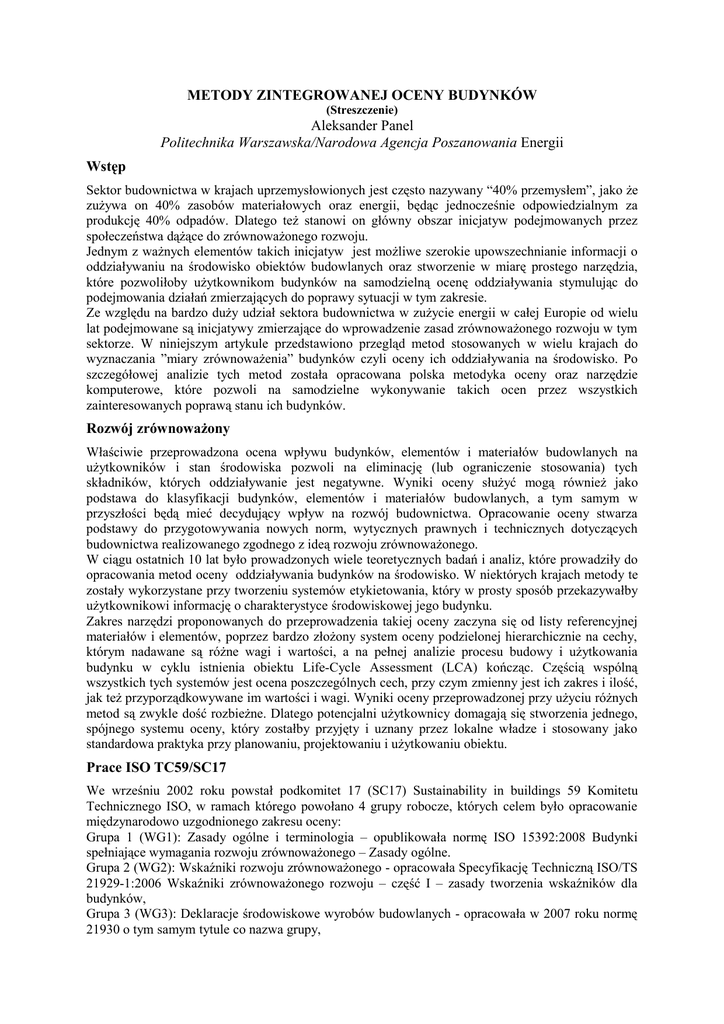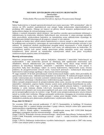 METODY ZINTEGROWANEJ OCENY BUDYNKÓW (Streszczenie) Aleksander Panel Politechnika Warszawska/Narodowa Agencja Poszanowania Energii Wstęp Sektor budownictwa w krajach uprzemysłowionych jest często nazywany “40% przemysłem”, jako że zużywa on 40% zasobów materiałowych oraz energii, będąc jednocześnie odpowiedzialnym za produkcję 40% odpadów. Dlatego też stanowi on główny obszar inicjatyw podejmowanych przez społeczeństwa dążące do zrównoważonego rozwoju. Jednym z ważnych elementów takich inicjatyw jest możliwe szerokie upowszechnianie informacji o oddziaływaniu na środowisko obiektów budowlanych oraz stworzenie w miarę prostego narzędzia, które pozwoliłoby użytkownikom budynków na samodzielną ocenę oddziaływania stymulując do podejmowania działań zmierzających do poprawy sytuacji w tym zakresie. Ze względu na bardzo duży udział sektora budownictwa w zużycie energii w całej Europie od wielu lat podejmowane są inicjatywy zmierzające do wprowadzenie zasad zrównoważonego rozwoju w tym sektorze. W niniejszym artykule przedstawiono przegląd metod stosowanych w wielu krajach do wyznaczania ”miary zrównoważenia” budynków czyli oceny ich oddziaływania na środowisko. Po szczegółowej analizie tych metod została opracowana polska metodyka oceny oraz narzędzie komputerowe, które pozwoli na samodzielne wykonywanie takich ocen przez wszystkich zainteresowanych poprawą stanu ich budynków. Rozwój zrównoważony Właściwie przeprowadzona ocena wpływu budynków, elementów i materiałów budowlanych na użytkowników i stan środowiska pozwoli na eliminację (lub ograniczenie stosowania) tych składników, których oddziaływanie jest negatywne. Wyniki oceny służyć mogą również jako podstawa do klasyfikacji budynków, elementów i materiałów budowlanych, a tym samym w przyszłości będą mieć decydujący wpływ na rozwój budownictwa. Opracowanie oceny stwarza podstawy do przygotowywania nowych norm, wytycznych prawnych i technicznych dotyczących budownictwa realizowanego zgodnego z ideą rozwoju zrównoważonego. W ciągu ostatnich 10 lat było prowadzonych wiele teoretycznych badań i analiz, które prowadziły do opracowania metod oceny oddziaływania budynków na środowisko. W niektórych krajach metody te zostały wykorzystane przy tworzeniu systemów etykietowania, który w prosty sposób przekazywałby użytkownikowi informację o charakterystyce środowiskowej jego budynku. Zakres narzędzi proponowanych do przeprowadzenia takiej oceny zaczyna się od listy referencyjnej materiałów i elementów, poprzez bardzo złożony system oceny podzielonej hierarchicznie na cechy, którym nadawane są różne wagi i wartości, a na pełnej analizie procesu budowy i użytkowania budynku w cyklu istnienia obiektu Life-Cycle Assessment (LCA) kończąc. Częścią wspólną wszystkich tych systemów jest ocena poszczególnych cech, przy czym zmienny jest ich zakres i ilość, jak też przyporządkowywane im wartości i wagi. Wyniki oceny przeprowadzonej przy użyciu różnych metod są zwykle dość rozbieżne. Dlatego potencjalni użytkownicy domagają się stworzenia jednego, spójnego systemu oceny, który zostałby przyjęty i uznany przez lokalne władze i stosowany jako standardowa praktyka przy planowaniu, projektowaniu i użytkowaniu obiektu. Prace ISO TC59/SC17 We wrześniu 2002 roku powstał podkomitet 17 (SC17) Sustainability in buildings 59 Komitetu Technicznego ISO, w ramach którego powołano 4 grupy robocze, których celem było opracowanie międzynarodowo uzgodnionego zakresu oceny: Grupa 1 (WG1): Zasady ogólne i terminologia – opublikowała normę ISO 15392:2008 Budynki spełniające wymagania rozwoju zrównoważonego – Zasady ogólne. Grupa 2 (WG2): Wskaźniki rozwoju zrównoważonego - opracowała Specyfikację Techniczną ISO/TS 21929-1:2006 Wskaźniki zrównoważonego rozwoju – część I – zasady tworzenia wskaźników dla budynków, Grupa 3 (WG3): Deklaracje środowiskowe wyrobów budowlanych - opracowała w 2007 roku normę 21930 o tym samym tytule co nazwa grupy, Grupa 4 (WG4): Charakterystyka środowiskowa budynków - opracowała Specyfikację Techniczną 2193-1:2006 pn. Ramowy zakres oceny charakterystyki środowiskowej robót budowlanych – część I – budynki, Grupa 5 została powołana w 2008 roku o zakresie prac podobnym do grup 1, 2 i 4 w odniesieniu do robót infrastrukturalnych. Ramowy system oceny budynków zgodny z wytycznymi Unii Europejskiej Na podstawie mandatu Komisji europejskiej CEN zlecił stworzenie BT174 (Technical Board 174), który powołał TC 350 z zadaniem opracowania następujących dokumentów normalizacyjnych wspomagających ocenę zintegrowanej charakterystyki budynku: Grupa ds. Zakresu Oceny (Framework Task Group) opracowuje: Normę prEN 15643-1 Zintegrowana ocena budynku – część 1 – Zakres ogólny. Dokument ten ma opisać zakres, metody oceny i w konsekwencji sposób deklaracji zintegrowanej charakterystyki budynku; normę prEN 15643-2, “Zintegrowana ocena budynku – Ramowa ocena charakterystyki środowiskowej – część 2. Podkreśla się przy tym różnicę pomiędzy normą ISO dotyczącą ramowego sytemu oceny, a projektowaną normą CEN, która powinna dostarczyć konkretnych wymagań lub podać sposoby określania wartości granicznych dla pojedynczych kryteriów ,WI 00350010 (Work Item). Grupa Robocza 1 (WG1) opracowuje: normę dotyczącą oceny charakterystyki środowiskowej budynków – metod obliczeniowych, w ramach zatwierdzonego zadania WI00350002; normę dotyczącą wykorzystania deklaracji środowiskowych (budynków i wyrobów), w ramach WI 00350003 Grupa Robocza 2 (WG2) opracowuje: Raport Techniczny, Opis cyklu życia budynku, WI 00350007 Grupa Robocza 3 (WG3) opracowuje: normę prEN 15804 Deklaracje środowiskowe wyrobów budowlanych – reguły kategoryzacji wyrobu, WI 00350004; normę Deklaracje środowiskowe wyrobów budowlanych 