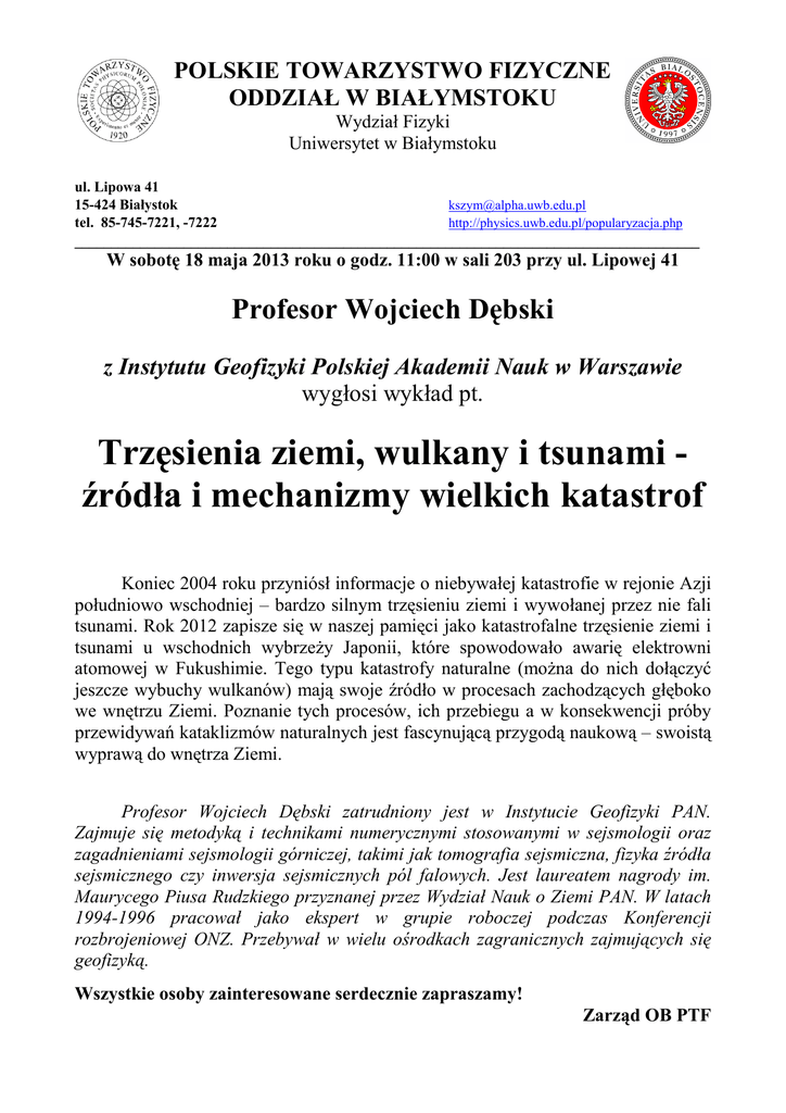 POLSKIE TOWARZYSTWO FIZYCZNE ODDZIAŁ W BIAŁYMSTOKU Wydział Fizyki Uniwersytet w Białymstoku ul. Lipowa 41 15-424 Białystok [email protected] tel. 85-745-7221, -7222 http://physics.uwb.edu.pl/popularyzacja.php ______________________________________________________________________________________ W sobotę 18 maja 2013 roku o godz. 11:00 w sali 203 przy ul. Lipowej 41 Profesor Wojciech Dębski z Instytutu Geofizyki Polskiej Akademii Nauk w Warszawie wygłosi wykład pt. Trzęsienia ziemi, wulkany i tsunami źródła i mechanizmy wielkich katastrof Koniec 2004 roku przyniósł informacje o niebywałej katastrofie w rejonie Azji południowo wschodniej – bardzo silnym trzęsieniu ziemi i wywołanej przez nie fali tsunami. Rok 2012 zapisze się w naszej pamięci jako katastrofalne trzęsienie ziemi i tsunami u wschodnich wybrzeŜy Japonii, które spowodowało awarię elektrowni atomowej w Fukushimie. Tego typu katastrofy naturalne (moŜna do nich dołączyć jeszcze wybuchy wulkanów) mają swoje źródło w procesach zachodzących głęboko we wnętrzu Ziemi. Poznanie tych procesów, ich przebiegu a w konsekwencji próby przewidywań kataklizmów naturalnych jest fascynującą przygodą naukową – swoistą wyprawą do wnętrza Ziemi. Profesor Wojciech Dębski zatrudniony jest w Instytucie Geofizyki PAN. Zajmuje się metodyką i technikami numerycznymi stosowanymi w sejsmologii oraz zagadnieniami sejsmologii górniczej, takimi jak tomografia sejsmiczna, fizyka źródła sejsmicznego czy inwersja sejsmicznych pól falowych. Jest laureatem nagrody im. Maurycego Piusa Rudzkiego przyznanej przez Wydział Nauk o Ziemi PAN. W latach 1994-1996 pracował jako ekspert w grupie roboczej podczas Konferencji rozbrojeniowej ONZ. Przebywał w wielu ośrodkach zagranicznych zajmujących się geofizyką. Wszystkie osoby zainteresowane serdecznie zapraszamy! Zarząd OB PTF