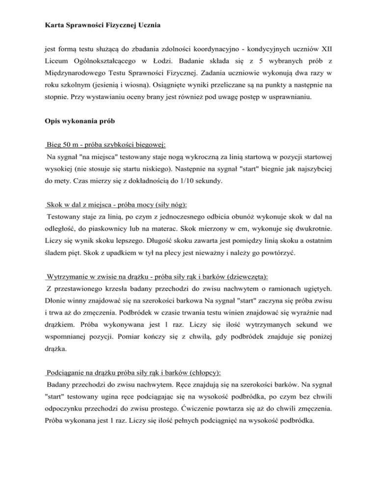 Karta Sprawności Fizycznej Ucznia jest formą testu służącą do zbadania zdolności koordynacyjno - kondycyjnych uczniów XII Liceum Ogólnokształcącego w Łodzi. Badanie składa się z 5 wybranych prób z Międzynarodowego Testu Sprawności Fizycznej. Zadania uczniowie wykonują dwa razy w roku szkolnym (jesienią i wiosną). Osiągnięte wyniki przeliczane są na punkty a następnie na stopnie. Przy wystawianiu oceny brany jest również pod uwagę postęp w usprawnianiu. Opis wykonania prób Bieg 50 m - próba szybkości biegowej: Na sygnał "na miejsca" testowany staje nogą wykroczną za linią startową w pozycji startowej wysokiej (nie stosuje się startu niskiego). Następnie na sygnał "start" biegnie jak najszybciej do mety. Czas mierzy się z dokładnością do 1/10 sekundy. Skok w dal z miejsca - próba mocy (siły nóg): Testowany staje za linią, po czym z jednoczesnego odbicia obunóż wykonuje skok w dal na odległość, do piaskownicy lub na materac. Skok mierzony w cm, wykonuje się dwukrotnie. Liczy się wynik skoku lepszego. Długość skoku zawarta jest pomiędzy linią skoku a ostatnim śladem pięt. Skok z upadkiem w tył na plecy jest nieważny i należy go powtórzyć. Wytrzymanie w zwisie na drążku - próba siły rąk i barków (dziewczęta): Z przestawionego krzesła badany przechodzi do zwisu nachwytem o ramionach ugiętych. Dłonie winny znajdować się na szerokości barkowa Na sygnał "start" zaczyna się próba zwisu i trwa aż do zmęczenia. Podbródek w czasie trwania testu winien znajdować się wyraźnie nad drążkiem. Próba wykonywana jest l raz. Liczy się ilość wytrzymanych sekund we wspomnianej pozycji. Pomiar kończy się z chwilą, gdy podbródek znajduje się poniżej drążka. Podciąganie na drążku próba siły rąk i barków (chłopcy): Badany przechodzi do zwisu nachwytem. Ręce znajdują się na szerokości barków. Na sygnał "start" testowany ugina ręce podciągając się na wysokość podbródka, po czym bez chwili odpoczynku przechodzi do zwisu prostego. Ćwiczenie powtarza się aż do chwili zmęczenia. Próba wykonana jest 1 raz. Liczy się ilość pełnych podciągnięć na wysokość podbródka. Bieg zwinnościowy: Na sygnał "na miejsca" badany staje na linii startu. Na komendę "start" biegnie do drugiej linii (odległość 10 m), podnosi z półkola klocek, po czym wraca na linię startu, gdzie kładzie klocek (klocek nie może być rzucony). Następnie biegnie po drugi klocek i wracając kładzie go ponownie w półkolu. Liczy się czas, mierzony z dokładnością do 1/10 s Próba zostaje zakończona z chwilą, gdy drugi klocek znajduje się w półkolu. Próba zostaje unieważniona, gdy klocek jest do półkola wrzucony. Tak wykonaną próbę należy powtórzyć. Skłony w przód z leżeniem tyłem przez 30 s - próba siły mięśni brzucha: Badany leży na macie z rozstawionymi na szerokość 30 cm stopami i kolanami ugiętymi pod kątem prostym. Ręce splecione na karku. Testowanemu pomaga partner, który przytrzymuje stopy tak, aby me odrywały się od podłoża. Na sygnał "start" badany wykonuje skłony w przód dotykając łokciami kolan następnie wraca do pozycji wyjściowej. Ćwiczenie trwa 30 sekund. Notowana jest ilość wykonanych skłonów w ciągu 30 sekund. Badanego nie dyskwalifikuje się w wypadku, gdy robi dłuższe przerwy w czasie wykonywania skłonów. Zasady oceniania z KSFU Uczniowie otrzymują oceny za trzy z pięciu przez siebie wykonanych prób. W przypadku nie podejścia do danej próby uczeń otrzymuje 0 punktów i ocena za tę próbę brana jest pod uwagę w pierwszej kolejności. Jeżeli uczeń jest częściowo zwolniony z części ćwiczeń, które uniemożliwiają wykonanie danej próby, to ma obowiązek zaliczenia w innej formie w okresie jednego miesiąca. Szczegółowa punktacja 65 pkt i więcej - 6 (cel) 64-60 pkt - 5 (bdb) 59-50 pkt - 4 (db) 49-40 pkt - 3 (dst) 39-1 pkt - 2 (dop) 0 pkt - 1 (ndst) 7DEHODGRSU]HOLF]DQLDX]\VNDQ\FKZ\QLNyZQDSXQNW\± ./$6$3,(5:6=$ OLF]ED V OLF]ED 381.7$&-$ V 6,$'< =/()(1,$ =:,61$ 5.$&+ FP %,(*;0 V 32'&,*$1,( 1$5.$&+ OLF]ED %,(* 1$0 V 6.2.:'$/ =0,(-6&$ V %,(*1$0 V 6,$'< =/()(1,$ FP &+à23&< %,(*;0 V %,(* 1$0 6.2.:'$/ =0,(-6&$ SNW %,(*1$0 381.7$&-$ '=,(:&=7$ SNW &+à23&<± ./$6$'58*$ 381.7$&-$ %,(*1$ 6.2.:'$/ %,(*1$ SNW V FP C V 8*,1$1,( 5. OLF]ED %,(*; V 6,$'< =/()(1,$ OLF]ED %,(*1$ 6.2.:'$/ V =:,6 %,(*; V V V %,(*1$ FP '=,(:&=7$± ./$6$'58*$ 6,$'< 381.7$&-$ =/()(1,$ OLF]ED SNW 381.7$&- %,(*1$ $ SNW V '=,(:&=7$± ./$6$75=(&,$ 6.2.: '$/ %,(*1$ 8*,1$1,( %,(*; 6,$'< 5. =/()(1,$ FP V V V V OLF]ED %,(*1$ 6.2.:'$/ FP &+à23&<± ./$6$75=(&,$ %,(*1$ V 8*,1$1,( 5. OLF]ED %,(*; V 6,$'< =/()(1,$ OLF]ED 381.7$&-$ SNW