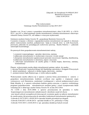 Załącznik do Zarządzenia Nr 0050.85.2015 Burmistrza Gorzowa Śl. z dnia 16.09.2015r Plan wykorzystania Gminnego Zasobu Nieruchomości na lata 2015-2017 Zgodnie z art. 24 ust.1 ustawy o gospodarce nieruchomościami z dnia 21.08.1997r tj. z 2015r Dz.U., poz.651 w skład gminnego zasobu nieruchomości wchodzą nieruchomości stanowiące własność Gminy Gorzów Śl., nie oddane w wieczyste użytkowanie. Gminnym zasobem Gminy Gorzów Śl. gospodaruje Burmistrz Gorzowa Śl. Czynności związane z obrotem i zagospodarowaniem nieruchomości nie ujętych w obecnym planie wykorzystania zasobem, podejmowane będą na wniosek stron tj. osób fizycznych, prawnych, jednostek nie posiadających osobowości prawnej, Skarbu Państwa i jednostek samorządu terytorialnego. Do prawnych form gospodarowania nieruchomościami należą: 1.czynności rozporządzające : sprzedaż, darowizna, zamiana 2.oddawanie nieruchomości w użytkowanie wieczyste i trwały zarząd 3.obciążenie nieruchomości ograniczonymi prawami rzeczowymi: hipoteką, służebnością, 4.oddawanie nieruchomości w dzierżawę, najem i użyczenie 5. nabywanie nieruchomości do zasobu gminy w drodze kupna, darowizny, zamiany, komunalizacji Planem wykorzystania zasobu objęto nieruchomości gminne, nabyte do zasobu : 1. decyzją Wojewody Częstochowskiego lub Opolskiego ujawnioną w Księgach Wieczystych 2. aktem notarialnym - nabytych w drodze kupna, darowizny , zamiany 3. postanowieniem Sądu Rejonowego, w trybie nabycia spadku Wykorzystanie zasobu odbywa się w oparciu o prawne formy przewidziane w ustawie o gospodarce nieruchomościami, kodeksie cywilnym oraz zgodnie z wiążącymi organ wykonawczy czyli Burmistrza, ustaleniami wynikającymi z uchwał podejmowanych przez Radę Miejską: tj. w sprawie uchwalania budżetu gminy-coroczna, w sprawie wieloletniego programu gospodarowania mieszkaniowym zasobem gminy i zasad wynajmowania lokali wchodzących w skład tego zasobu Gminy Gorzów Śl. na lata 2012-2016 -Nr 1/2/04 z dnia 28.01.2004r w sprawie przeznaczenia do sprzedaży w trybie bezprzetargowym nieruchomości zabudowanych i określenie zasad ich zbycia oraz innych uchwał szczegółowych dotyczących wyrażenia zgody na nabycie nieruchomości do zasobu gminy lub przeznaczenia do sprzedaży konkretnych nieruchomości gminnych tj. -Uchwała nr XI/72/2015 z 09.09.2015r-sprzedaż działek powstałych po drogach -Uchwała X/66/2015 z 05.08.2015r –sprzedaż działki nr 351, położonej w Gołej -Uchwała VI/41/2015 z 24.04.2015r w spr. sprzedaży działek po byłych rowach I. Zestawienie powierzchni gminnego zasobu nieruchomości: Na dzień 31.12.2014r gminny zasób nieruchomości obejmował 1810 działek o pow. ogólnej 410,4673 ha i wartości 35 861133,63 zł Oprócz tego Gmina jest właścicielem 24 nieruchomości przekazanych w wieczyste użytkowanie powierzchni ogólnej 5,3215 ha i wartości 571 436,00 zł, które nie stanowią zasobu Gminy. Zasób nieruchomości podzielony został na następujące grupy: 1.grunty zabudowane -160 nieruchomości-o pow. 23,5029 ha, o wartości 2.260135,00 zł wraz z zabudowaniami 2.grunty zabudowane we współwłasności-21 nieruchomości o pow. 2,9820 ha, o wartości 231 088,66 zł 3.drogi -1136 działek o pow. 291,1806 ha, o wartości 34 423 577,72 zł 4. grunty rolne, zadrzewienia, rowy, nieużytki-430 działek o pow.72,5315 ha, o wartości 2 064 144,50 zł 5. tereny zieleni- 11 nieruchomości o pow. 1,0898 ha o wartości 113 716,00 zł 6. boiska i obiekty sportowe-19 nieruchomości o pow. 13,2071 ha o wartości 322 943,00 zł 7. cmentarze komunalne 1 nieruchomość o pow. 1,9626 ha i wartości 193 300,00zł 8. grunty pod zabudowę 20 działek o pow. 2,3740 ha o wartości 264 241,80 zł 9. grunty o nieuregulowanym stanie prawnym podzielone na: rowy, zabudowane, drogi, użytki rolne i inne o pow.2,10 ha 10. grunty Skarbu Państwa, będące w wieczystym użytkowaniu gminy-7 działek (po PKP) – o pow. 1,4862 ha o wartości 206 819,00 zł 11. tereny kolejowe -80 działek o pow. 10,8471 ha i wartości 982.511,00 zł Spis działek stanowiących zasób nieruchomości gminnych plus grunty będące w użytkowaniu wieczystym, stanowi załącznik do uchwały budżetowej pod nazwą „informacja o stanie mienia komunalnego „ gdzie każda nieruchomość została określona przez miejsce położenia, numer karty mapy , numer działki, numer księgi wieczystej, powierzchnię działki, określenie charakteru użytkowania, oraz wartość inwentarzową. II Prognoza udostępniania nieruchomości w formie dzierżawy, użyczenia i najmu Na dzień 31.12.2014r r Gmina Gorzów Śl. wydzierżawiała prawie 30,00 ha gruntów, pochodzących z zasobu , na które obowiązują następujące umowy: 1. dzierżawa gruntów rolnych – w dzierżawie jest 17,1192 ha –planowany dochód z dzierżawy 3.000,00 zł 2. dzierżawa gruntu pod ogródki działkowe –w dzierżawie 4,1107 ha-dochód 1.000 zł 3. dzierżawa gruntu pod garaże tymczasowe i murowane –pow. 0,20ha –dochód 4.600 zł 4. dzierżawa gruntu pod inne cele ( banery reklamowe, stacje meteorologiczne, dojazdy , stawy, na działalność gospodarczą) –o pow. 0,40 ha - dochód około 8.000 zł 5. użyczenie – w użyczeniu OSP i LZS jest 7,56 ha gruntów –boiska wiejskie, sportowe i strażnice – nieodpłatnie tj. bez dochodu 6. wynajem budynków i lokali będących w zarządzie Gminy tj. biuro BOSiP, biuro MGOPS, hala MGOK, loka TPSA – dochód około 20.000,00 zł W latach 2016-2017 udostępnianie nieruchomości nie ulegnie znaczącej zmianie. III. Prognoza nabywania nieruchomości do zasobu. 1. Komunalizacja - w okresie 2015-2017 Gmina Gorzów Śl. będzie nadal zajmować się pozyskiwaniem gruntów Skarbu Państwa, które z mocy prawa powinny stanowić własność Gminy Gorzów Śl, a w pierwszej kolejności doprowadzić do uregulowania stanu prawnego działek, które już są w zasobie jako grunty o nieuregulowanym stanie prawnym tj. głównie drog