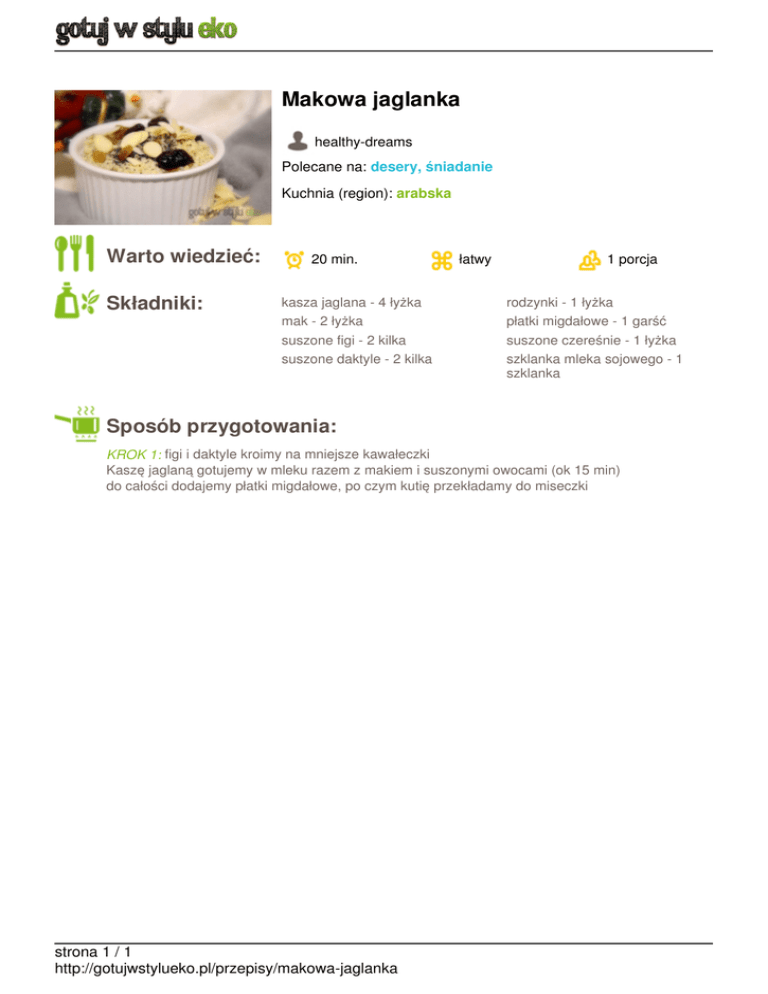 Makowa jaglanka healthy-dreams Polecane na: desery, śniadanie Kuchnia (region): arabska Warto wiedzieć: Składniki: 20 min. kasza jaglana - 4 łyżka mak - 2 łyżka suszone figi - 2 kilka suszone daktyle - 2 kilka łatwy 1 porcja rodzynki - 1 łyżka płatki migdałowe - 1 garść suszone czereśnie - 1 łyżka szklanka mleka sojowego - 1 szklanka Sposób przygotowania: KROK 1: figi i daktyle kroimy na mniejsze kawałeczki Kaszę jaglaną gotujemy w mleku razem z makiem i suszonymi owocami (ok 15 min) do całości dodajemy płatki migdałowe, po czym kutię przekładamy do miseczki strona 1 / 1 http://gotujwstylueko.pl/przepisy/makowa-jaglanka Powered by TCPDF (www.tcpdf.org)