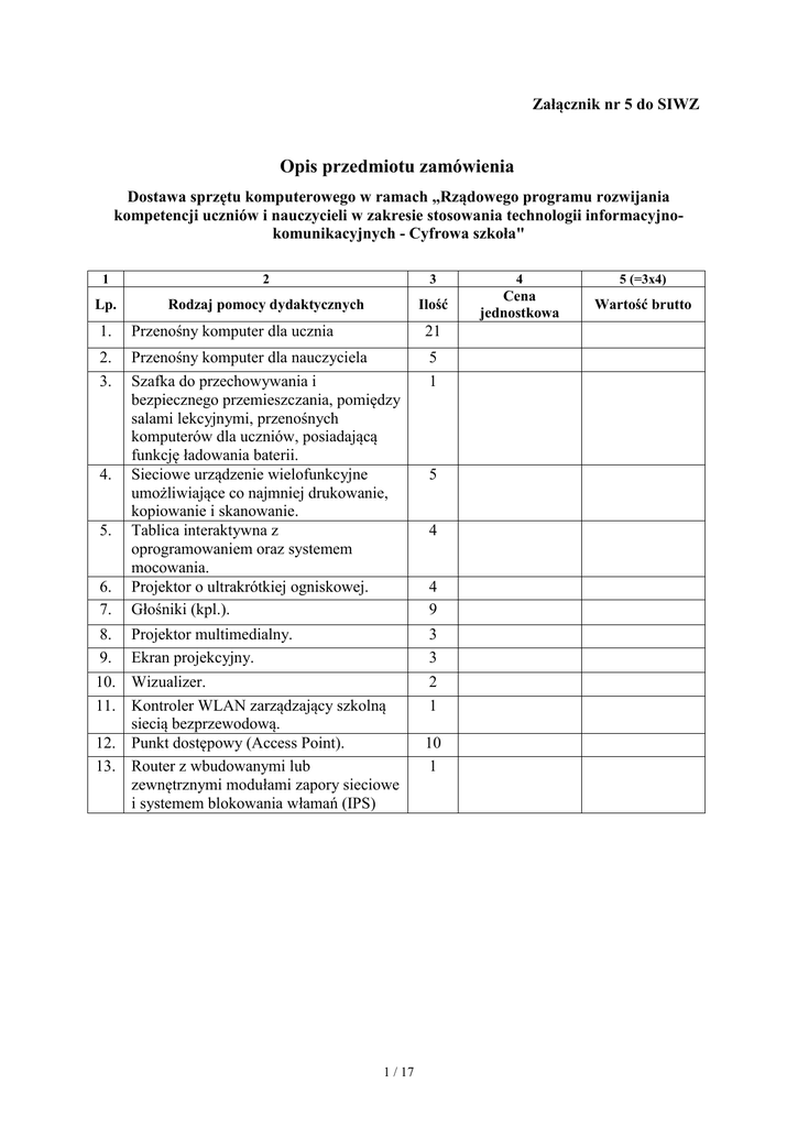 Załącznik nr 5 do SIWZ Opis przedmiotu zamówienia Dostawa sprzętu komputerowego w ramach „Rządowego programu rozwijania kompetencji uczniów i nauczycieli w zakresie stosowania technologii informacyjnokomunikacyjnych - Cyfrowa szkoła" 1 2 3 4 5 (=3x4) Lp. Rodzaj pomocy dydaktycznych Ilość Cena jednostkowa Wartość brutto 1. Przenośny komputer dla ucznia 21 2. 3. Przenośny komputer dla nauczyciela Szafka do przechowywania i bezpiecznego przemieszczania, pomiędzy salami lekcyjnymi, przenośnych komputerów dla uczniów, posiadającą funkcję ładowania baterii. Sieciowe urządzenie wielofunkcyjne umożliwiające co najmniej drukowanie, kopiowanie i skanowanie. Tablica interaktywna z oprogramowaniem oraz systemem mocowania. Projektor o ultrakrótkiej ogniskowej. Głośniki (kpl.). 5 1 Projektor multimedialny. Ekran projekcyjny. Wizualizer. Kontroler WLAN zarządzający szkolną siecią bezprzewodową. 12. Punkt dostępowy (Access Point). 13. Router z wbudowanymi lub zewnętrznymi modułami zapory sieciowe i systemem blokowania włamań (IPS) 3 3 2 1 4. 5. 6. 7. 8. 9. 10. 11. 1 / 17 5 4 4 9 10 1 Przenośny komputer dla ucznia – 21 szt. UWAGA – niespełnienie powoduje odrzucenie produktu Oznaczenie modelu …………………………………………… Producent …………………………………………………….. Lp. Parametry wymagane 1. Procesor 2. Wyświetlacz wynik wydajności procesora w teście PassMark - CPU Mark minimum 1500 pkt (http://www.passmark.com) ekran o przekątnej co najmniej 13”, technologia LED 3. Pamięć RAM pamięć operacyjna RAM co najmniej 4GB 4. Twardy dysk 5. 6. Komunikacja bezprzewodowa Audio Dysk twardy o pojemności co najmniej 250GB wyposażony w system zabezpieczenia danych na wypadek upadku, łącze sieci bezprzewodowej zgodne ze standardem 802.11g/n. 7. Napęd DVD napęd DVD±RW 8. Kamera zintegrowana kamera i mikrofon 9. Porty zewnętrzne 10. Klawiatura - co najmniej 3 złącza USB, - złącze VGA, HDMI - złącze słuchawkowe, - złącze mikrofonowe fizyczna klawiatura odporna na zalania 11. 12. Urządzenie wskazujące Czytnik kart wbudowana wielofunkcyjna konsola dotykowa z dwoma przyciskami oraz z funkcją przewijania odporna na zalania wbudowany uniwersalny czytnik kart pamięci, 13. Ciężar ciężar poniżej 2,5 kg, 14. Wyposażenie zasilacz, torba (pokrowiec) na laptopa, 15. Bateria zapewniająca pracę komputera przez minimum 4 godz. 16. System operacyjny a) zintegrowana karta dźwiękowa system operacyjny z graficznym interfejsem użytkownika w języku polskim, w tym także system interaktywnej pomocy w języku polskim. Zlokalizowane w języku polskim, co najmniej następujące elementy: menu, odtwarzacz multimediów, pomoc, komunikaty systemowe, b) system operacyjny powinien mieć zintegrowany system aktualizacji darmowych poprawek bezpieczeństwa, przy czym komunikacja z użytkownikiem powinna odbywać się w języku polskim, c) możliwość zdalnej automatycznej instalacji, konfiguracji, administrowania oraz aktualizowania systemu, d) dostępność bezpłatnej telefonicznej pomocy technicznej dotyczącej systemu operacyjnego świadczonej w języku polskim u producenta sprzętu komputerowego (związane z problemami współdziałania sprzętu i systemu operacyjnego) – cena połączenia nie większa niż cena połączenia lokalnego, e) dostępność w Internecie na stronach producenta biuletynów technicznych, w tym opisów poprawek bezpieczeństwa, w języku polskim, a także telefonicznej pomocy technicznej producenta systemu operacyjnego świadczonej w języku polskim. Cena połączenia nie większa niż cena połączenia lokalnego, 2 / 17 SPEŁNIA TAK / NIE możliwość dostosowania do pracy dla osób niepełnosprawnych np. słabowidzących, zgodnie z wymogami Krajowych Ram Interoperacyjności (WCAG 2.0), g) system operacyjny musi pozwalać na pracę w różnych sieciach komputerowych (sieci lokalne LAN, Internet), w tym także automatycznie rozpoznawać sieci i ich ustawienia bezpieczeństwa, rozpoznawać automatycznie urządzenia peryferyjne działające w tej sieci (np. drukarki, tablice interaktywne) oraz łączyć się automatycznie z raz zdefiniowanymi sieciami, h) posiadać możliwość indywidualizacji pracy poszczególnych użytkowników – różne poziomy uprawnień przy logowaniu, i) system operacyjny winien współpracować z oprogramowaniem tablicy interaktywnej, wizualizera oraz urządzeniem wielofunkcyjnym wymienionym w dalszej części niniejszego opisu przedmiotu zamówienia, j) system operacyjny musi mieć publicznie znany cykl życia przedstawiony przez producenta, dotyczący rozwoju i wsparcia technicznego – w szczególności w zakresie bezpieczeństwa – co najmniej na 5 lat od daty zakupu, k) powinien być przystosowany do pracy grupowej i synchronizacji danych, l) powinien pozwalać na wdrożenie jednolitej polityki bezpieczeństwa dla wszystkich komputerów w sieci szkolnej oraz zapewniać pełną współpracę oraz pełną kompatybilność z funkcjonującą szkolną siecią komputerową. a) zintegrowany pakiet aplikacji biurowych musi zawierać co najmniej: edytor tekstów; arkusz kalkulacyjny; narzędzie do przygotowania i prowadzenia prezentacji; bazę danych; narzędzie do zarządzania informacją osobistą (poczta, kalendarz, kontakty, zadania). b) zainstalowanie na jednym komputerze produktów pochodzących od różnych producentów nie będzie uznane za ofertę zintegrowanego pakietu, c) pełna polska wersja językowa interfejsu użytkownika, w tym także systemu interaktywnej pomocy w języku polskim, d) pakiet biurowy powinien mieć system aktualizacji darmowych poprawek bezpieczeństwa, przy czym komunikacja z użytkownikiem powinna odbywać się w języku polskim, e) dostępność w Internecie na stronach producenta biuletynów technicznych, w tym opisów poprawek bezpieczeństwa, w języku polskim, a także telefonicznej pomocy technicznej producenta pakietu biurowego