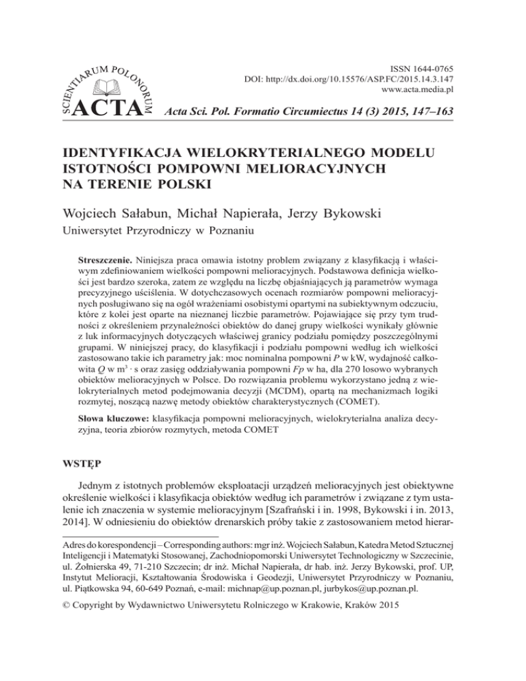 ISSN 1644-0765 DOI: http://dx.doi.org/10.15576/ASP.FC/2015.14.3.147 www.acta.media.pl Acta Sci. Pol. Formatio Circumiectus 14 (3) 2015, 147–163 IDENTYFIKACJA WIELOKRYTERIALNEGO MODELU ISTOTNOŚCI POMPOWNI MELIORACYJNYCH NA TERENIE POLSKI Wojciech Sałabun, Michał Napierała, Jerzy Bykowski Uniwersytet Przyrodniczy w Poznaniu Streszczenie. Niniejsza praca omawia istotny problem związany z klasyfikacją i właściwym zdefiniowaniem wielkości pompowni melioracyjnych. Podstawowa definicja wielkości jest bardzo szeroka, zatem ze względu na liczbę objaśniających ją parametrów wymaga precyzyjnego uściślenia. W dotychczasowych ocenach rozmiarów pompowni melioracyjnych posługiwano się na ogół wrażeniami osobistymi opartymi na subiektywnym odczuciu, które z kolei jest oparte na nieznanej liczbie parametrów. Pojawiające się przy tym trudności z określeniem przynależności obiektów do danej grupy wielkości wynikały głównie z luk informacyjnych dotyczących właściwej granicy podziału pomiędzy poszczególnymi grupami. W niniejszej pracy, do klasyfikacji i podziału pompowni według ich wielkości zastosowano takie ich parametry jak: moc nominalna pompowni P w kW, wydajność całkowita Q w m3 · s oraz zasięg oddziaływania pompowni Fp w ha, dla 270 losowo wybranych obiektów melioracyjnych w Polsce. Do rozwiązania problemu wykorzystano jedną z wielokryterialnych metod podejmowania decyzji (MCDM), opartą na mechanizmach logiki rozmytej, noszącą nazwę metody obiektów charakterystycznych (COMET). Słowa kluczowe: klasyfikacja pompowni melioracyjnych, wielokryterialna analiza decyzyjna, teoria zbiorów rozmytych, metoda COMET WSTĘP Jednym z istotnych problemów eksploatacji urządzeń melioracyjnych jest obiektywne określenie wielkości i klasyfikacja obiektów według ich parametrów i związane z tym ustalenie ich znaczenia w systemie melioracyjnym [Szafrański i in. 1998, Bykowski i in. 2013, 2014]. W odniesieniu do obiektów drenarskich próby takie z zastosowaniem metod hierarAdres do korespondencji – Corresponding authors: mgr inż. Wojciech Sałabun, Katedra Metod Sztucznej Inteligencji i Matematyki Stosowanej, Zachodniopomorski Uniwersytet Technologiczny w Szczecinie, ul. Żołnierska 49, 71-210 Szczecin; dr inż. Michał Napierała, dr hab. inż. Jerzy Bykowski, prof. UP, Instytut Melioracji, Kształtowania Środowiska i Geodezji, Uniwersytet Przyrodniczy w Poznaniu, ul. Piątkowska 94, 60-649 Poznań, e-mail: [email protected], [email protected]. © Copyright by Wydawnictwo Uniwersytetu Rolniczego w Krakowie, Kraków 2015 148 W. Sałabun, M. Napierała, J. Bykowski chicznych prowadzono już wcześniej [Bykowski i Miler 1997]. Problem ten dotyczy także pompowni melioracyjnych odgrywających istotną rolę w ochronie przeciwpowodziowej [Przybyła i in. 2014]. W literaturze można spotkać różne sposoby klasyfikowania pompowni melioracyjnych [CBSiPBW 1971, Schröeder 1972, Prochal i in. 1987, Klugiewicz 1992, Cebulak 1996, Rusetsky 2009]. W praktyce jednak często użytkownicy pompowni kierują się ogólnym wrażeniem wizualnym, co może prowadzić do pewnych nieporozumień. Dlatego też pojęcie wielkości wymaga precyzyjnego określenia. Właściwa klasyfikacja pompowni według tego kryterium nasuwa pomysł wieloaspektowego podejścia do omawianego problemu. Wynika to przede wszystkim z samej definicji wielkości, która według literatury [Dictionary… 2014, CED 2014, OED 2014] ma wiele znaczeń. W stosunku do obiektów inżynieryjnych, jakim są pompownie melioracyjne, wielkość oznacza pewną właściwość obiektu, którą można określić ilościowo, czyli zmierzyć. Nie ma jednak sztywnej definicji wielkości. Dlatego też w pracy zaproponowano zastosowanie wielokryterialnej metody wspomagania decyzji MCDM (z ang. – multi-criteria decision-making), zwanej też metodą wielokryterialnego podejmowania decyzji, opartej na logice rozmytej, wykorzystującej podstawowe parametry fizyczne pompowni. Metody tego typu umożliwiają agregowanie wielu kryteriów w celu ewaluacji rozważanych obiektów. Ułatwiają uzyskanie rozwiązań złożonych problemów badawczych, dzięki zastosowaniu usystematyzowanej fuzji wiedzy eksperta [Pedrycz i in. 2011]. Wiedza ta najczęściej jest reprezentowana poprzez określenia rozmyte oraz niepewne, które są subiektywne i zależą od konkretnego oceniającego [Piegat i in. 2012, Sałabun 2012]. Przykładowo sformułowanie „duża pompownia” może być postrzegane w różny sposób, w zależności od rozmiaru budowli, ilości i gabarytów pomp, ich mocy, zasięgu oddziaływania. W literaturze naukowej ewaluacja jest najczęściej dokonywana przez zastosowanie jednej z wielu modyfikacji metod: AHP, TOPSIS oraz ELECTRE [Hokkanen i Salminen 1997, Bender i Simonovic 2000, Figueira i in. 2005, Hajkowicz i Collins 2007, Srdjevic 2007, Srdjevic i Medeiros 2008, Behzadian i in. 2012, Minatour i in. 2014]. Wskutek tego końcowe wyniki są ściśle uzależnione od liczby oraz wartości atrybutów rozważanych obiektów poddawanych ocenie. Oznacza to, że w przypadku oceny kolejnego nowego obiektu cała procedura ewaluacji musi zostać powtórzona od nowa, a uprzednio uzyskane wyniki ulegną zmianie. Należy zwrócić uwagę na to, iż ocena obiektu A będzie miała inną wartość, gdy będzie on oceniany w grupie składającej się kolejno z 2, 3, 4 lub n obiektów. Zmiana wartości może być na tyle wysoka, iż zmieni się nawet kolejność ocenionych obiektów (tzw. rank reversal). Celem prowadzonych badań jest wykorzystanie teorii zbiorów rozmytych m.in. do oceny wpływu analizowanych parametrów na koszty utrzymania i użytkowania pompowni melioracyjnych. METODYKA BADAŃ Badania oparto na informacji zebranej z 16 wojewódzkich Zarządów Melioracji i Urządzeń Wodnych administrujących łącznie 586 pompowniami melioracyjnymi. Analizy przeprowadzono w oparciu o 3 podstawowe parametry pompowni, tj.: łącz