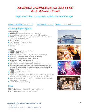 KOBIECE INSPIRACJE NA BAŁTYKU Ruch, Zdrowie i Uroda! Rejs promem Skania, połączony z wycieczką do Ystad (Szwecja) Liczba uczestników: Min 30 Czas trwania: 2 dni Termin: 10-11.04.2015 Ramowy program wyjazdu: Dzień pierwszy 20:00 zbiórka uczestników imprezy w Szczecinie przejazd autokarem na terminal promowy w Świnoujściu 21:30 odprawa biletowa, zaokrętowanie na pokład promu Skania, zakwaterowanie w kabinach Pokaz Zumby 23:00 wypłynięcie promu w morze czas wolny, dyskoteka nocleg Dzień drugi 06:30 przypłynięcie promu do Ystad 08:00 – 09:00 śniadanie 09:00 opuszczenie promu, przejazd autokarem do Ystad Warsztaty z trenerem Nordic Walking w plenerze Warsztaty z trenerem biegowym w plenerze Zwiedzanie Ystad z przewodnikiem 12:30 ponowne zaokrętowanie na prom Skania 13:00 kawa i ciastko w strefie kobiet Skania Bar Prezentacje tematyczne: dietetyczka, zabiegi kosmetyczne i Spa, wizażystka, stylista fryzur, fotograf (dokładny opis znajduje się na końcu oferty) 13:30 wypłynięcie promu z Ystad 15:00 obiad czas wolny – możliwość skorzystania z usług i indywidulanych porad tematycznych Partnerów wyjazdu (strefa kobiet Skania Bar) 20:00 przypłynięcie do Świnoujścia, opuszczenie promu, przejazd autokarem do Szczecina ok. 21:30 zakończenie imprezy Cena 390 PLN za osobę w kabinie 2, 3 lub 4 osobowej 490 PLN za osobę w kabinie 1 osobowej INFORMACJA I REZERWACJA: RUCHOWA AKADEMIA ZDROWIA 791 961 537 [email protected] www.raz.szczecin.pl 1 KOBIECE INSPIRACJE NA BAŁTYKU Ruch, Zdrowie i Uroda! Cena zawiera: Przejazd promem Skania na trasie Świnoujście – Ystad – Świnoujście Miejsce w kabinie w trakcie trwania rejsu nocnego i dziennego Śniadanie na trasie Ystad – Świnoujście – bufet z napojami Obiad na trasie Ystad – Świnoujście – bufet z napojami Transport autokarowy na trasie Szczecin-Świnoujście-Szczecin Zwiedzanie Ystad z przewodnikiem Pokazy, warsztaty i konsultacje Partnerów rejsu Dodatek paliwowy Dodatek ekologiczny Ubezpieczenie NNW, KL Uwagi Termin ważności oferty: 10-11.04.2015 Dla pierwszych 10 osób, które dokonają rezerwacji – 5% rabatu. Każda z uczestniczek wyjazdu otrzyma specjalne oferty z rabatami na skorzystanie z usług wybranych Partnerów (np. 10% rabatu na ofertę wycieczek autokarowych do Skandynawii Unity Travel, 30% rabatu na wybrany zabieg kosmetyczny oraz masaż do wykorzystania w Baltica Wellness & Spa, itp). PARTNERZY IMPREZY: INFORMACJA I REZERWACJA: RUCHOWA AKADEMIA ZDROWIA 791 961 537 [email protected] www.raz.szczecin.pl 2 KOBIECE INSPIRACJE NA BAŁTYKU Ruch, Zdrowie i Uroda! PREZENTACJA USŁUG: 1. BALTICA WELLNESS & SPA - Centrum Zdrowia i Urody Konsultacja kosmetyczna twarzy, diagnoza skóry oraz ułożenie indywidualnego programu pielęgnacyjnego. Możliwość skorzystania z masażu kosmetycznego twarzy (do wyboru: odżywczy, ujędrniający, oczyszczający). 2. KATARZYNA JANIK – wizażystka i ekspert ds. pielęgnacji Estee Lauder/La Mer „Jak pięknie być sobą na co dzień” – omówienie zasad prostego i efektywnego makijażu, triki makijażowe, rodzaje makijaży, trendy w wizażu, makijaż a typy urody, itp. Dla wybranych zostanie zaprezentowany i personalnie dobrany makijaż. 3. SEBASTIAN WOŁOSZ – fotograf, fotoreporter Portret i sesja zdjęciowa to niezwykle intymne formy fotografii. Swobodny sposób bycia przed obiektywem dla wielu wydaje się wymagającym zadaniem, również w codziennych sytuacjach. Spotkanie z profesjonalnym fotografem pomoże poczuć się pewnie i sprawi, że każda kobieta będzie bohaterką wyjątkowej fotografii. 4. MICHAŁ MYC – stylista fryzjer studia technicznego i marki KEUNE Doświadczony stylista fryzur przedstawi zestaw produktów do włosów, które każda kobieta powinna mieć. Omówi również typy urody z uwzględnieniem analizy kolorystycznej i ich właściwego doboru. Zaprezentuje także trendów na wiosnę i lato 2015 w oparciu o kolekcję Keune. 5. ZUMBA - Fitness World Pokaz Zumby w wykonaniu trenerek współpracujących z Fitness World Radisson Blu Hotel Szczecin. Zumba jest połączeniem tańca i fitnessu, a przede wszystkim świetnej zabawy. Jest to forma ruchu dla każdego, bez względu na wiek, płeć, kondycję fizyczną czy umiejętności taneczne . 6. ROBERT SZYCH – trener biegowy Założyciel Ruchowej Akademii Zdrowia w Szczecinie. Trener w biegach średnio i długo dystansowych, organizator wielu imprez sportowych w tym corocznego szczecińskiego „Alkala Bieg Kobiet”, odpowie m.in. na pytania po co biegać, jak zacząć i czy bieganie wspomaga odchudzanie. 7. ELŻBIETA REINHOLZ – instruktor Nordic Walking Od 2005 związana z Nordic Walking przedstawi jego genezę i udzieli porad dotyczących prawidłowej techniki marszu, doboru odpowiednich kijków, przygotowania do zajęć oraz najważniejsze korzyści wynikające z uprawiania Nordic Walking. 8. MAŁGORZATA SZCZUKO – dietetyk „Jesteś tym co jesz” – strategia żywienia, rola pożywienia jako paliwa dla naszego organizmu, dieta dla mniej lub bardziej aktywnych. To tematy, które zostaną omówione przez doświadczoną dietetyczkę, która oprócz porad jest również na co dzień wykładowcą akademickim Pomorskiego Uniwersytetu Medycznego w Szczecinie. INFORMACJA I REZERWACJA: RUCHOWA AKADEMIA ZDROWIA 791 961 537 [email protected] www.raz.szczecin.pl 3
