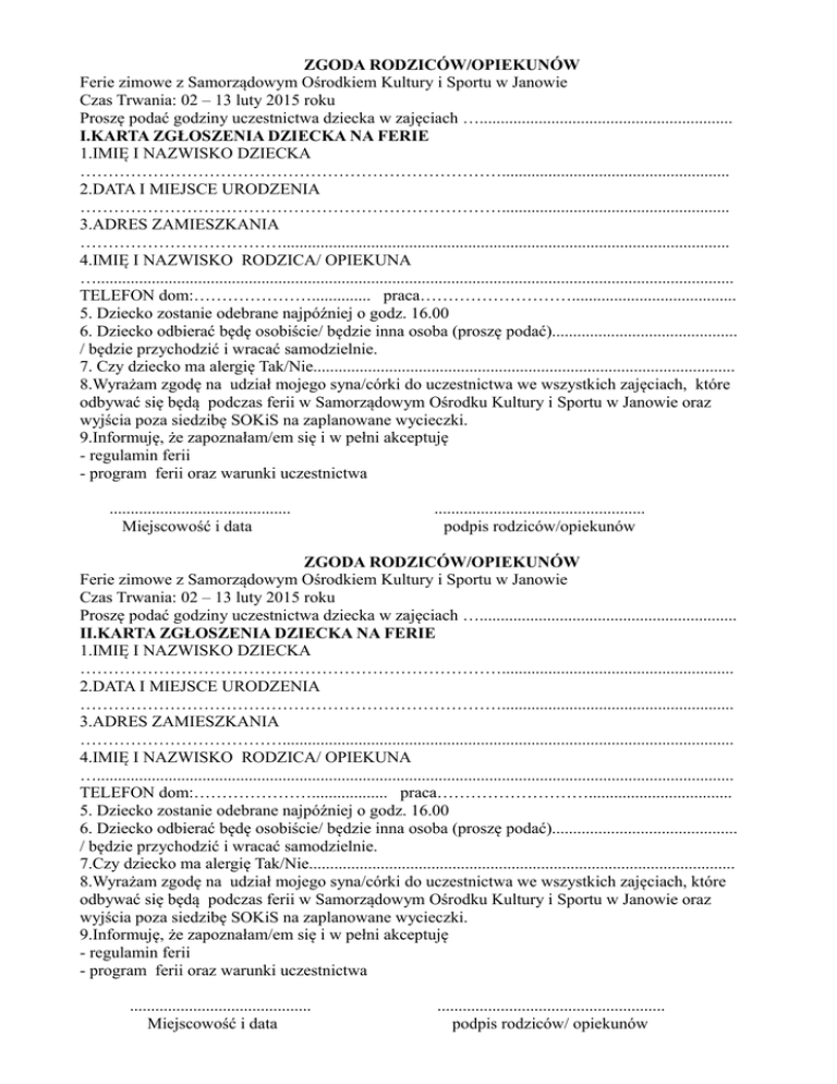 ZGODA RODZICÓW/OPIEKUNÓW Ferie zimowe z Samorządowym Ośrodkiem Kultury i Sportu w Janowie Czas Trwania: 02 – 13 luty 2015 roku Proszę podać godziny uczestnictwa dziecka w zajęciach …............................................................ I.KARTA ZGŁOSZENIA DZIECKA NA FERIE 1.IMIĘ I NAZWISKO DZIECKA …………………………………………………………………...................................................... 2.DATA I MIEJSCE URODZENIA …………………………………………………………………...................................................... 3.ADRES ZAMIESZKANIA ……………………………….......................................................................................................... 4.IMIĘ I NAZWISKO RODZICA/ OPIEKUNA …....................................................................................................................................................... TELEFON dom:………………….............. praca………………………....................................... 5. Dziecko zostanie odebrane najpóźniej o godz. 16.00 6. Dziecko odbierać będę osobiście/ będzie inna osoba (proszę podać)............................................ / będzie przychodzić i wracać samodzielnie. 7. Czy dziecko ma alergię Tak/Nie.................................................................................................... 8.Wyrażam zgodę na udział mojego syna/córki do uczestnictwa we wszystkich zajęciach, które odbywać się będą podczas ferii w Samorządowym Ośrodku Kultury i Sportu w Janowie oraz wyjścia poza siedzibę SOKiS na zaplanowane wycieczki. 9.Informuję, że zapoznałam/em się i w pełni akceptuję - regulamin ferii - program ferii oraz warunki uczestnictwa ........................................... Miejscowość i data .................................................. podpis rodziców/opiekunów ZGODA RODZICÓW/OPIEKUNÓW Ferie zimowe z Samorządowym Ośrodkiem Kultury i Sportu w Janowie Czas Trwania: 02 – 13 luty 2015 roku Proszę podać godziny uczestnictwa dziecka w zajęciach …............................................................. II.KARTA ZGŁOSZENIA DZIECKA NA FERIE 1.IMIĘ I NAZWISKO DZIECKA …………………………………………………………………....................................................... 2.DATA I MIEJSCE URODZENIA …………………………………………………………………....................................................... 3.ADRES ZAMIESZKANIA ………………………………........................................................................................................... 4.IMIĘ I NAZWISKO RODZICA/ OPIEKUNA …....................................................................................................................................................... TELEFON dom:………………….................. praca……………………….................................. 5. Dziecko zostanie odebrane najpóźniej o godz. 16.00 6. Dziecko odbierać będę osobiście/ będzie inna osoba (proszę podać)............................................ / będzie przychodzić i wracać samodzielnie. 7.Czy dziecko ma alergię Tak/Nie..................................................................................................... 8.Wyrażam zgodę na udział mojego syna/córki do uczestnictwa we wszystkich zajęciach, które odbywać się będą podczas ferii w Samorządowym Ośrodku Kultury i Sportu w Janowie oraz wyjścia poza siedzibę SOKiS na zaplanowane wycieczki. 9.Informuję, że zapoznałam/em się i w pełni akceptuję - regulamin ferii - program ferii oraz warunki uczestnictwa ........................................... Miejscowość i data ...................................................... podpis rodziców/ opiekunów