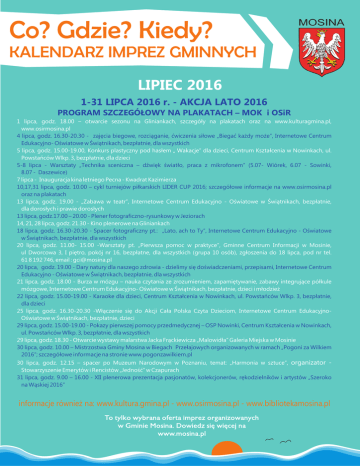 Co? Gdzie? Kiedy? KALENDARZ IMPREZ GMINNYCH LIPIEC 2016 1-31 LIPCA 2016 r. - AKCJA LATO 2016 PROGRAM SZCZEGÓ£OWY NA PLAKATACH – MOK i OSiR 1 lipca, godz. 18.00 – otwarcie sezonu na Gliniankach, szczegó³y na plakatach oraz na www.kulturagmina.pl, www.osirmosina.pl 4 lipca, godz. 16.30-20.30 - zajêcia biegowe, rozci¹ganie, æwiczenia si³owe „Biegaæ ka¿dy mo¿e”, Internetowe Centrum Edukacyjno- Oœwiatowe w Œwi¹tnikach, bezp³atnie, dla wszystkich 5 lipca, godz. 15.00-19.00, Konkurs plastyczny pod has³em „ Wakacje” dla dzieci, Centrum Kszta³cenia w Nowinkach, ul. Powstañców Wlkp. 3, bezp³atnie, dla dzieci 5-8 lipca - Warsztaty „Technika sceniczna – dŸwiêk œwiat³o, praca z mikrofonem” (5.07- Wiórek, 6.07 - Sowinki, 8.07 - Daszewice) 7 lipca - Inauguracja kina letniego Pecna - Kwadrat Kazimierza 10,17,31 lipca, godz. 10.00 – cykl turniejów pi³karskich LIDER CUP 2016; szczegó³owe informacje na www.osirmosina.pl oraz na plakatach 13 lipca, godz. 19.00 - „Zabawa w teatr”, Internetowe Centrum Edukacyjno - Oœwiatowe w Œwi¹tnikach, bezp³atnie, dla doros³ych i prawie doros³ych 13 lipca, godz.17.00 – 20.00 - Plener fotograficzno-rysunkowy w Jeziorach 14, 21, 28 lipca, godz. 21.30 - Kino plenerowe na Gliniankach 18 lipca, godz. 16.30-20.30 - Spacer fotograficzny pt.: „Lato, ach to Ty”, Internetowe Centrum Edukacyjno - Oœwiatowe w Œwi¹tnikach, bezp³atnie, dla wszystkich 20 lipca, godz. 11.00- 15.00 -Warsztaty pt. „Pierwsza pomoc w praktyce”, Gminne Centrum Informacji w Mosinie, ul Dworcowa 3, I piêtro, pokój nr 16, bezp³atne, dla wszystkich (grupa 10 osób), zg³oszenia do 18 lipca, pod nr tel. 61 8 192 746, email : [email protected] 20 lipca, godz. 19.00 - Dary natury dla naszego zdrowia - dzielimy siê doœwiadczeniami, przepisami, Internetowe Centrum Edukacyjno - Oœwiatowe w Œwi¹tnikach, bezp³atnie, dla wszystkich 21 lipca, godz. 18.00 - Burza w mózgu – nauka czytania ze zrozumieniem, zapamiêtywanie, zabawy integruj¹ce pó³kule mózgowe, Internetowe Centrum Edukacyjno- Oœwiatowe w Œwi¹tnikach, bezp³atnie, dzieci i m³odzie¿ 22 lipca, godz. 15.00-19.00 - Karaoke dla dzieci, Centrum Kszta³cenia w Nowinkach, ul. Powstañców Wlkp. 3, bezp³atnie, dla dzieci 25 lipca, godz. 16.30-20.30 -W³¹czenie siê do Akcji Ca³a Polska Czyta Dzieciom, Internetowe Centrum EdukacyjnoOœwiatowe w Œwi¹tnikach, bezp³atnie, dzieci 29 lipca, godz. 15.00-19.00 - Pokazy pierwszej pomocy przedmedycznej – OSP Nowinki, Centrum Kszta³cenia w Nowinkach, ul. Powstañców Wlkp. 3, bezp³atnie, dla wszystkich 29 lipca, godz. 18.30 - Otwarcie wystawy malarstwa Jacka Fr¹ckiewicza „Malowid³a” Galeria Miejska w Mosinie 30 lipca, godz. 10.00 – Mistrzostwa Gminy Mosina w Biegach Prze³ajowych organizowanych w ramach „Pogoni za Wilkiem 2016”; szczegó³owe informacje na stronie www.pogonzawilkiem.pl 30 lipca, godz. 12.15 – spacer po Muzeum Narodowym w Poznaniu, temat: „Harmonia w sztuce”, organizator Stowarzyszenie Emerytów i Rencistów „Jednoœæ” w Czapurach 31 lipca, godz. 9.00 – 16.00 - XII plenerowa prezentacja pasjonatów, kolekcjonerów, rêkodzielników i artystów „Szeroko na W¹skiej 2016” informacje równie¿ na: www.kultura.gmina.pl - www.osirmosina.pl - www.bibliotekamosina.pl
