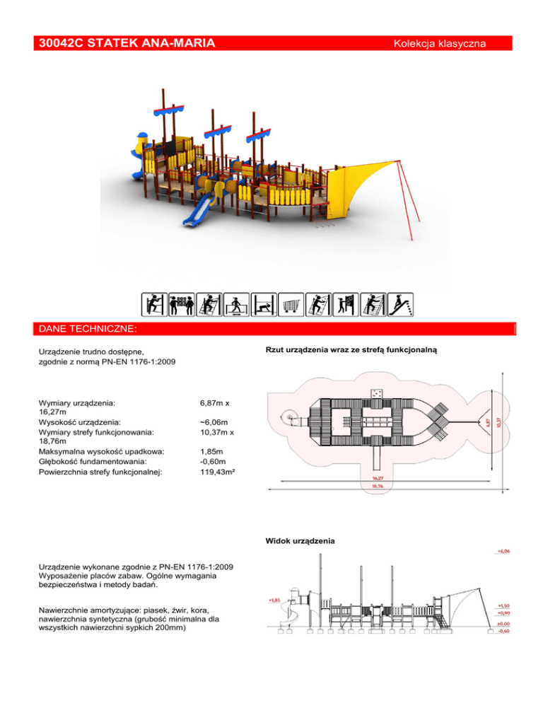 30042C STATEK ANA-MARIA Kolekcja klasyczna DANE TECHNICZNE: Rzut urządzenia wraz ze strefą funkcjonalną Urządzenie trudno dostępne, zgodnie z normą PN-EN 1176-1:2009 Wymiary urządzenia: 16,27m Wysokość urządzenia: Wymiary strefy funkcjonowania: 18,76m Maksymalna wysokość upadkowa: Głębokość fundamentowania: Powierzchnia strefy funkcjonalnej: 6,87m x ~6,06m 10,37m x 1,85m -0,60m 119,43m² Widok urządzenia Urządzenie wykonane zgodnie z PN-EN 1176-1:2009 Wyposażenie placów zabaw. Ogólne wymagania bezpieczeństwa i metody badań. Nawierzchnie amortyzujące: piasek, żwir, kora, nawierzchnia syntetyczna (grubość minimalna dla wszystkich nawierzchni sypkich 200mm) SKŁAD URZĄDZENIA: Drabinka pionowa Dziób – wieże bez dachu, podesty wys. 150 cm Gra integracyjna „Kółko i Krzyżyk” Linarium wejściowe Maszt z żaglem Mostek dziobowy Mostek kapitański - wieże bez dachu, podesty wys. 150 cm i 185 cm Pokład – wieże bez dachu, podesty wys. 60 cm Pokład – wieże bez dachu, podesty wys. 90 cm Pomost ruchomy Przejście tunelowe Ścianka wspinaczkowa wys. 90 cm Sklepik mały Tablica rysunkowa Trap wejściowy wys. 90 cm Zjeżdżalnia spiralna z pomostem wys. 185 cm Zjeżdżalnia wys. 90 cm MATERIAŁY: 12 szt. 6 szt. 1 szt. 2 szt. 3 szt. 2 szt. 3 szt. 4 szt. 16 szt. 1 szt. 4 szt. 1 szt. 1 szt. 1 szt. 1 szt. 1 szt. 1 szt. Nogi konstrukcyjne: Kotwy: Elementy połaciowe, sklepik: Podesty, schody: Podesty łukowe i skośne: Elementy stalowe: Ślizg, szczeble w drabince poziomej: Zjeżdżalnia spiralna: Kółko i krzyżyk: Ścianka wspinaczkowa: Łańcuch: Liny: Tunel: Tablica rysunkowa: Zaślepki: Fundamenty: drewno klejone warstwowo, malowane lakierobejcą na kolor zielony stal ocynkowana kąpielowo płyty HDPE deski impregnowane sklejka wodoodporna szalunkowa stal ocynkowana kąpielowo, malowana proszkowo stal nierdzewna tworzywo sztuczne formowane metodą rotomoulding-u walce polipropylenowe, malowane w technice sitodruku sklejka wodoodporna szalunkowa, uchwyty alpinistyczne z tworzywa opartego na żywicach stal ocynkowana kąpielowo polipropylenowe na oplocie stalowym połączone ze sobą poprzez plastikowe łączniki rura PVC ø 600mm; mocowana do płyt HDPE gr. 19mm sklejka wodoodporna szalunkowa gr. 15mm, malowana farbą tablicową tworzywo sztuczne beton klasy min. B-15 SATERNUS DISTRIBUTION Sp. z o.o. sp. k. ul. Nowa 32 41-500 Chorzów SATERNUS DISTRIBUTION Sp. z o.o. sp. k. zastrzega sobie wszelkie prawa do ochrony praw autorskich na podstawie Ustawy z dnia 04.02.1994 r. o prawie autorskim i prawach pokrewnych ( DZ. U. Nr 28 poz. 83) a zwłaszcza art. 78 i 79 tejże ustawy. Właściciel certyfikatu: Producent: Dystrybutor: GRUPA SATERNUS Sp. z o.o. S. K. A. (następca prawny Place Zabaw Saternus Sp. z o.o.) Saternus Production Sp. z o.o. sp. k. Saternus Distribution Sp. z o.o. sp. k.
