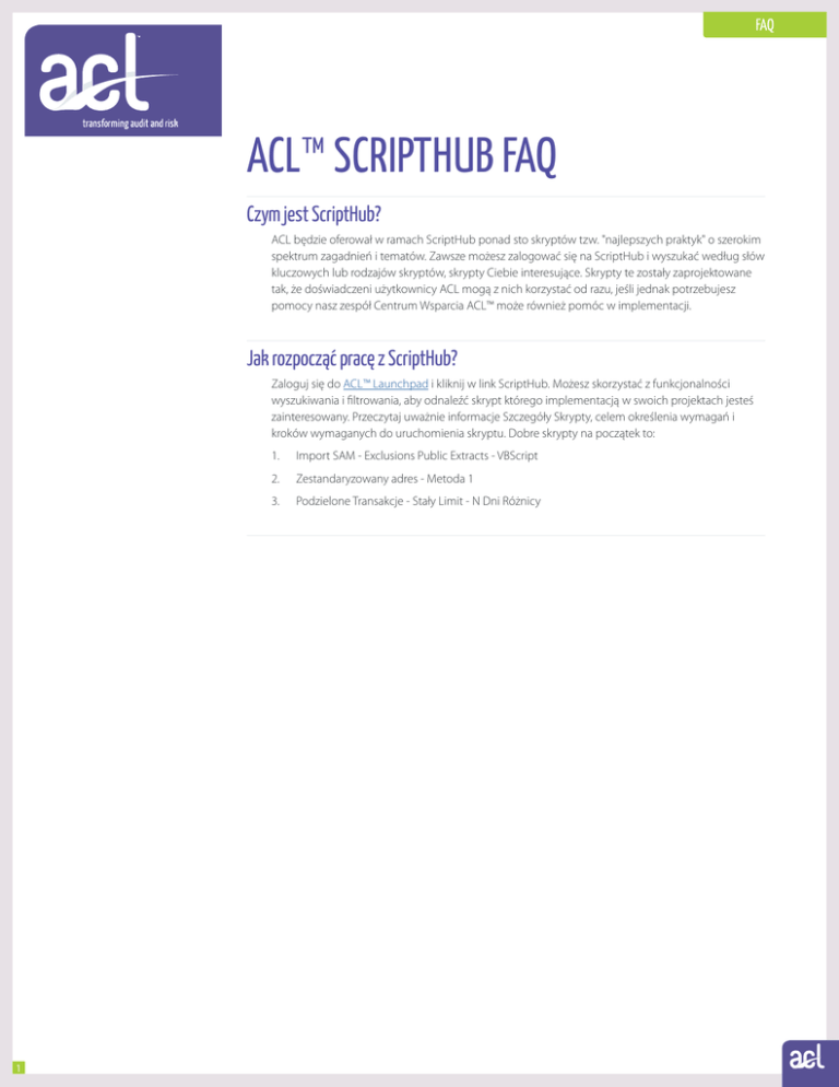 FAQ ACL™ SCRIPTHUB FAQ Czym jest ScriptHub? ACL będzie oferował w ramach ScriptHub ponad sto skryptów tzw. "najlepszych praktyk" o szerokim spektrum zagadnień i tematów. Zawsze możesz zalogować się na ScriptHub i wyszukać według słów kluczowych lub rodzajów skryptów, skrypty Ciebie interesujące. Skrypty te zostały zaprojektowane tak, że doświadczeni użytkownicy ACL mogą z nich korzystać od razu, jeśli jednak potrzebujesz pomocy nasz zespół Centrum Wsparcia ACL™ może również pomóc w implementacji. Jak rozpocząć pracę z ScriptHub? Zaloguj się do ACL™ Launchpad i kliknij w link ScriptHub. Możesz skorzystać z funkcjonalności wyszukiwania i filtrowania, aby odnaleźć skrypt którego implementacją w swoich projektach jesteś zainteresowany. Przeczytaj uważnie informacje Szczegóły Skrypty, celem określenia wymagań i kroków wymaganych do uruchomienia skryptu. Dobre skrypty na początek to: 1 1. Import SAM - Exclusions Public Extracts - VBScript 2. Zestandaryzowany adres - Metoda 1 3. Podzielone Transakcje - Stały Limit - N Dni Różnicy FAQ Czym są skrypty Importujące, Przygotowujące, Analityczne i Snippet? Te różne typy skryptów są wykorzystywane na różnych etapach analizy danych. Proszę pamiętać, że przykłady są tutaj używane wyłącznie w celach ilustracyjnych i na dzień dzisiejszy mogą nie istnieć ScriptHub; w określonym czasie, te i inne skrypty będą dostępne w ScriptHub. Typ Opis Przykład Również znane jako łącza danych, skrypty te importują źródłowe dane z systemów lub plików do nowych tabel gotowych do użycia w ACL™ Analytics. Są one źródłem systemu / specyficznego formatu. Import Danych Płac i HR z Peoplesoft Przygotowujące Pobiera tabele utworzone za pomocą skryptów importujących i konwertuje je do oczekiwanego formatu z wykorzystaniem wspólnego modelu danych dla obszaru biznesowego. Są one specyficzne dla formatu źródłowego i wspólnego modelu danych. Pobiera tabele utworzone za pomocą skryptów importujących i konwertuje je do oczekiwanego formatu z wykorzystaniem wspólnego modelu danych dla obszaru biznesowego. Są one specyficzne dla formatu źródłowego i wspólnego modelu danych. Przygotowuje Wspólny Model Danych ACL Płace z Peoplesoft® Analityczne Te skrypty rozwiązują specyficzne problemy z obszaru lub procesu audytu. Większość z nim została opracowana w oparciu o specyficzny format danych, jak zdefiniowano we wspólnym modelu danych. Takie działanie skutkuje tym, że ten sam skrypt analityczny może być wykorzystany przez różne organizacje. Oznacza to jednak, konieczność transformacji danych, z wykorzystaniem skryptu przygotowującego, do wspólnego modelu danych. Wykrywa Duplikaty Tożsamy Tożsamy Podobny, Tworzy szablon Snippet Skrypty mają charakter ogólny i mogą zostać wywołane niezależnie lub jako podskrypty innych skryptów, opracowane zostały one w taki sposób, że nawet użytkownicy nie posiadający wiedzy na temat Skryptów ACL™ będą mogli z nich skorzystać. Nie posiadają one dedykowanego kontekstu dedykowanego dla audytu, ryzyka czy compliance. Te skrypty są zazwyczaj wywoływane przez jeden ze skryptów Importujących, Przygotowujących czy Analyticznych. Wykrywa Zduplikowane Płatności Płac w oparciu o tą samą Kwotę, tą samą Datę i podobne Nazwisko Pracownika Importujące Czym jest Wspólny Model Danych? Wspólny Model Danych definiuje standardowe tabele i pola wymagane w określonym kontekście danego problemu. Przykładowo, Wspólny Model Danych definiowany dla “Dane Dostawcy” może uwzględniać tabele dla “Dstawcy,” “Adres Dostawcy,” “Dane Bankowe Dostawcy,” itp. Te tabele muszą uwzględniać definicje następujących pól “Vendor_Name,” “Vendor_Street_Address1,” “Vendor_Last_ Modified_Date,” itp. Jeżeli zestaw skryptów Importujących i Przygotowujących został wybrany do ekstraktu danych z systemu i konwersji do Wspólnego Modelu Danych, wtedy dowolne skrypty opracowane pod kątem Wspólnego Modelu Danych będą działać na przygotowanych danych. W tym przypadku, autorzy skryptów analitycznych nie muszą wiedzieć jakie jest źródło danych aby napisać skrypt analityczny. 2 FAQ Skrypt, który pobrałem nie działa. Gdzie mogę uzyskać pomoc? Skrypt, który pobrałem właśnie wykasował mój twardy dysk! Pomocy! Pamiętaj, aby przeczytać wszystkie informacje na stronie Szczegóły Skryptu (informacje te można uzyskać klikając w nazwę skryptu w ScriptHub). Te skrypty są dostarczane “tak jak jest,” w razie problemów z uruchomieniem odwiedź Forum Wsparcia w ramach Centrum Wsparcia. Możesz otrzymać pomoc od społeczności użytkowników lub autora skryptu. Skrypty te są dostarczane jako-jak-jest-jest, są one testowane w naszym środowisku, jednak nie możemy zagwarantować, że będą one działać zgodnie z przeznaczeniem w twoim własnym środowisku. Nie spodziewamy się, że skrypty będą kasowały zawartość dysków, jednak jesteś częściowo odpowiedzialny za przeglądnięcie i zapewnienie, że skrypty działają zgodnie z przeznaczeniem w twoim własnym środowisku. Proszę zobaczyć pełne warunki użytkowania ww ramach Umowy Licencyjnej na Oprogramowanie ACL, którą można znaleźć na stronie: www.acl. com/legal. Czy te skrypty zostaną przetłumaczone na mój język? Skrypty są obecnie tłumaczone na wszystkie obsługiwane języki, strona ScriptHub zmieni język w oparciu ustawiony w profilu ACL Launchpad. Należy pamiętać, że nie wszystkie treści będą przetłumaczone, Skrypty ACL pozostaną w języku angielskim. Wydaje mi się, że w jednym ze skryptów występuje błąd. Jak mam go zgłosić? Mam pomysł na skrypt. Gdzie mogę zgłosić propozycję? Mam skrypt do udostępnienia. Gdzie mogę udostępnić mój skrypt? Te skrypty są dostarczane “tak jak jest,” w razie problemów z uruchomieniem odwiedź Forum Wsparcia w ramach Centrum Wsparcia. M