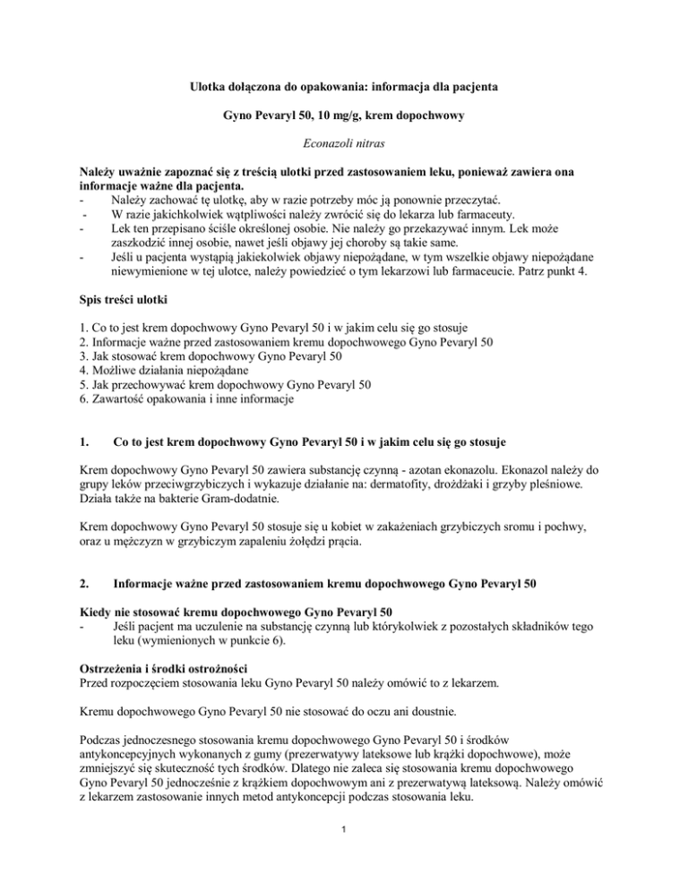 Ulotka dołączona do opakowania: informacja dla pacjenta Gyno Pevaryl 50, 10 mg/g, krem dopochwowy Econazoli nitras Należy uważnie zapoznać się z treścią ulotki przed zastosowaniem leku, ponieważ zawiera ona informacje ważne dla pacjenta. Należy zachować tę ulotkę, aby w razie potrzeby móc ją ponownie przeczytać. W razie jakichkolwiek wątpliwości należy zwrócić się do lekarza lub farmaceuty. Lek ten przepisano ściśle określonej osobie. Nie należy go przekazywać innym. Lek może zaszkodzić innej osobie, nawet jeśli objawy jej choroby są takie same. Jeśli u pacjenta wystąpią jakiekolwiek objawy niepożądane, w tym wszelkie objawy niepożądane niewymienione w tej ulotce, należy powiedzieć o tym lekarzowi lub farmaceucie. Patrz punkt 4. Spis treści ulotki 1. Co to jest krem dopochwowy Gyno Pevaryl 50 i w jakim celu się go stosuje 2. Informacje ważne przed zastosowaniem kremu dopochwowego Gyno Pevaryl 50 3. Jak stosować krem dopochwowy Gyno Pevaryl 50 4. Możliwe działania niepożądane 5. Jak przechowywać krem dopochwowy Gyno Pevaryl 50 6. Zawartość opakowania i inne informacje 1. Co to jest krem dopochwowy Gyno Pevaryl 50 i w jakim celu się go stosuje Krem dopochwowy Gyno Pevaryl 50 zawiera substancję czynną - azotan ekonazolu. Ekonazol należy do grupy leków przeciwgrzybiczych i wykazuje działanie na: dermatofity, drożdżaki i grzyby pleśniowe. Działa także na bakterie Gram-dodatnie. Krem dopochwowy Gyno Pevaryl 50 stosuje się u kobiet w zakażeniach grzybiczych sromu i pochwy, oraz u mężczyzn w grzybiczym zapaleniu żołędzi prącia. 2. Informacje ważne przed zastosowaniem kremu dopochwowego Gyno Pevaryl 50 Kiedy nie stosować kremu dopochwowego Gyno Pevaryl 50 Jeśli pacjent ma uczulenie na substancję czynną lub którykolwiek z pozostałych składników tego leku (wymienionych w punkcie 6). Ostrzeżenia i środki ostrożności Przed rozpoczęciem stosowania leku Gyno Pevaryl 50 należy omówić to z lekarzem. Kremu dopochwowego Gyno Pevaryl 50 nie stosować do oczu ani doustnie. Podczas jednoczesnego stosowania kremu dopochwowego Gyno Pevaryl 50 i środków antykoncepcyjnych wykonanych z gumy (prezerwatywy lateksowe lub krążki dopochwowe), może zmniejszyć się skuteczność tych środków. Dlatego nie zaleca się stosowania kremu dopochwowego Gyno Pevaryl 50 jednocześnie z krążkiem dopochwowym ani z prezerwatywą lateksową. Należy omówić z lekarzem zastosowanie innych metod antykoncepcji podczas stosowania leku. 1 Kremu dopochwowego Gyno Pevaryl 50 nie należy stosować razem z innym, miejscowym (zewnętrznym lub dopochwowym) sposobem leczenia narządów płciowych. Jeśli wystąpią nasilone objawy podrażnienia lub uczulenia, leczenie należy przerwać i ponownie zgłosić się do lekarza. Jeśli pacjent jest uczulony na pochodne imidazolowe, może być także uczulony na azotan ekonazolu – substancję czynną leku. Krem dopochwowy Gyno Pevaryl 50 a inne leki Należy powiedzieć lekarzowi lub farmaceucie o wszystkich lekach stosowanych przez pacjenta obecnie lub ostatnio, a także o lekach, które pacjent planuje stosować. Skuteczność plemnikobójczych środków antykoncepcyjnych może ulegać znacznemu osłabieniu pod wpływem stosowanych miejscowo leków dopochwowych, w tym kremu dopochwowego Gyno Pevaryl 50. Należy unikać kontaktu leku Gyno Pevaryl 50 z produktami lateksowymi, takimi jak krążki lateksowe lub prezerwatywy, gdyż składniki kremu mogą uszkadzać lateks. Ze względu na niewielkie wchłanianie substancji czynnej do organizmu po podaniu dopochwowym jest mało prawdopodobne, aby oddziaływała ona w sposób istotny z innymi lekami. Stwierdzano jednak oddziaływanie azotanu ekonazolu z doustnymi lekami przeciwzakrzepowymi (zmniejszającymi krzepliwość krwi). Jeśli pacjentka przyjmuje doustne leki przeciwzakrzepowe, takie jak warfaryna lub acenokumarol, powinna powiedzieć o tym lekarzowi, który będzie kontrolował ich działanie przeciwzakrzepowe. Stosowanie kremu dopochwowego Gyno Pevaryl 50 u pacjentów w podeszłym wieku Dane dotyczące stosowania leku u osób w wieku powyżej 65 lat są niewystarczające. Ciąża i karmienie piersią Jeśli pacjentka jest w ciąży lub karmi piersią, przypuszcza, że może być w ciąży lub gdy planuje mieć dziecko, powinna poradzić się lekarza lub farmaceuty przed zastosowaniem tego leku. Substancja czynna kremu dopochwowego Gyno Pevaryl 50 wchłania się z pochwy, dlatego też leku nie należy stosować w pierwszym trymestrze ciąży, chyba że lekarz uzna, iż ma to istotne znaczenie dla zdrowia pacjentki. Gyno Pevaryl 50, krem dopochwowy może być stosowany w drugim lub trzecim trymestrze ciąży, jeśli spodziewane korzyści dla matki przeważają nad możliwym ryzykiem dla płodu. Stosując krem dopochwowy Gyno Pevaryl 50 w okresie karmienia piersią należy zachować ostrożność. Prowadzenie pojazdów i obsługiwanie maszyn Nie jest znany wpływ leku na zdolność prowadzenia pojazdów i obsługiwania maszyn. 3. Jak stosować krem dopochwowy Gyno Pevaryl 50 Krem dopochwowy Gyno Pevaryl 50 należy zawsze stosować zgodnie z zaleceniami lekarza. W razie wątpliwości należy skontaktować się z lekarzem lub farmaceutą. 2 Nie stosować kremu dopochwowego Gyno Pevaryl 50 doustnie ani do oczu. Kobiety Jedną, pełną (5 ml) zawartość aplikatora, wprowadzać dopochwowo, raz w ciągu doby, przed spoczynkiem nocnym, przez co najmniej 14 kolejnych dni. Leczenie należy kontynuować także wówczas, gdy dolegliwości (świąd, upławy) ustąpią przed upływem 14 dni. Jeśli pacjentka jest w ciąży, zaleca się, aby stosowała krem bez użycia aplikatora lub by podawał go lekarz. Mężczyźni Umyć i osuszyć prącie, a następnie nałożyć krem na żołądź i napletek raz na dobę. Stosować przez 14 kolejnych dni. Zastosowanie większej niż zalecana dawki leku Gyno Pevaryl 50, krem dopochwowy Krem dopochwowy Gyno Pevaryl 50 stosuje si