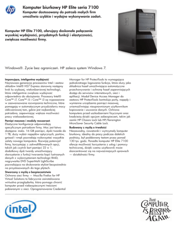 Komputer biurkowy HP Elite seria 7100 Komputer dostosowany do potrzeb małych firm umożliwia szybkie i wydajne wykonywanie zadań. Komputer HP Elite 7100, oferujący doskonałe połączenie wysokiej wydajności, przydatnych funkcji i elastyczności, zwiększa możliwości firmy. Windows®. Życie bez ograniczeń. HP zaleca system Windows 7. Imponująca, inteligentna wydajność Najnowsza generacja procesorów Intel i zestaw układów Intel® H57 Express stanowią następny krok ku szybszej, wielordzeniowej technologii, która inteligentnie zwiększa wydajność odpowiednio do obciążenia. Procesory Intel® Core™ i7, Core™ i5 i Core™ i3 są wyposażone w zaawansowane rozwiązania techniczne, które pomagają w automatycznym przydzielaniu mocy obliczeniowej tam, gdzie jest najbardziej potrzebna, zapewniając większe możliwości pracy wielozadaniowej. Pamięć masowa i moduły rozszerzeń Elastyczne konfiguracje odpowiadają specyficznym potrzebom firmy. Moc jest łatwo dostępna: maks. 16 GB pamięci, dyski twarde do 1 TB, duży wybór napędów optycznych, portów, gniazd i wnęk pozwalają wykorzystać wszystkie zalety nowego komputera. Rozwijaj potencjał firmy, korzystając z zakwalifikowanych opcji, takich jak czytnik kart pamięci 22 w 1, dodatkowy dysk twardy umożliwiający skorzystanie z funkcji tworzenia kopii lustrzanych danych z wykorzystaniem technologii RAID, nagrywarka DVD SuperMulti LightScribe pozwalająca na drukowanie etykiet bezpośrednio na przystosowanych do tego płytach. Stworzony z myślą o bezpieczeństwie Ochrona sieci firmy — Mozilla Firefox for HP Virtual Solutions to fabrycznie zainstalowana wirtualna przeglądarka, która pomaga chronić komputer przed niebezpiecznymi treściami pobieranymi z sieci. Oprogramowanie Credential Manager for HP ProtectTools to wymagająca jednokrotnego logowania funkcja, która służy jako składnica haseł umożliwiająca automatyczne przechowywanie i ochronę haseł zapewniających dostęp do serwisów internetowych, sieci i aplikacji. Moduł Device Access Manager do zestawu HP ProtectTools kontroluje porty, napędy i wymienne urządzenia pamięci masowej, uniemożliwiając nieuprawnionym użytkownikom kopiowanie i usuwanie danych. Ochrona komputera przed uszkodzeniami fizycznymi oraz kradzieżą dzięki opcjom zabezpieczeń, takim jak zamki HP Chassis Lock lub HP/Kensington MicroSaver Security Cable Lock. Budowany z myślą o trwałości Niezawodny, nowatorski i wytrzymały komputer biurkowy, idealny do pracy podczas dalekich podróży, był poddawany testom przez ponad 130 tys. godz. Ponadto komputer HP Elite 7100 oferuje możliwość korzystania z usług i pomocy technicznej, dzięki czemu użytkownik może skoncentrować się na najważniejszych sprawach — działalności firmy. Komputer biurkowy HP Elite seria 7100 Windows®. Życie bez ograniczeń. HP zaleca system Windows 7. DANE TECHNICZNE Obudowa Microtower System operacyjny Oryginalny Windows® 7 Professional (32-bitowy) Oryginalny Windows® 7 Professional 64-bitowy Windows XP Professional (dostępny na podstawie prawa do zmiany wersji z wersji Oryginalny Windows® 7 Professional) Oryginalny Windows® 7 Home Premium (32-bitowy) Oryginalny Windows® 7 Home Premium 64-bitowy Oryginalny Windows® 7 Home Basic (32-bitowy) FreeDOS Procesor Procesor Intel® Core™ i3-530 (2,93 GHz, łącznie 4 MB pamięci podręcznej); Procesor Intel® Core™ i3-540 (3,06 GHz, 4 MB pamięci podręcznej; Procesor Intel® Core™ i5-650 (3,20 GHz, łącznie 4 MB pamięci podręcznej); Procesor Intel® Core™ i5-750 (2,66 GHz, łącznie 8 MB pamięci podręcznej); Procesor Intel® Core™ i7-860 (2,80 GHz, łącznie 8 MB pamięci podręcznej); Procesor Intel® Pentium® Dual-Core G6950 (2,80 GHz, łącznie 3 MB pamięci podręcznej); Zestaw układów Intel® H57 Express Nośniki wyjmowalne Nagrywarka DVD SuperMulti LightScribe SATA Grafika Zintegrowany akcelerator grafiki Intel® Graphics Media Accelerator HD; Karta graficzna NVIDIA GeForce G210 (512 MB DH) HDMI PCIe x16; Karta graficzna NVIDIA GeForce GT230 (1,5 GB DH) DVI, VGA, HDMI PCIe x16; Karta graficzna ATI Radeon HD 5450 1 GB DH PCIe x16 Karta dźwiękowa Układ dźwiękowy Realtek ALC888S High Definition, zgodność audio 3D z AC'97 2.3, zgodność z HD Audio Komunikacja Zintegrowana karta Realtek RTL8111DL Gigabit Ethernet Porty i złącza 9 portów USB 2.0; 1 1394a; 1 wejście audio; 1 wyjście audio; 1 center/sub; 1 wyjście cyfrowe; 1 DVI-D; 1 wejście mikrofonu; Złącze sieciowe RJ-45; 1 tylny głośnik surround; 1 boczny głośnik surround; 1 port wideo VGA Urządzenia wejściowe Standardowa klawiatura HP USB Mysz optyczna HP USB z 2 przyciskami i przewijaniem Oprogramowanie Tylko w niektórych modelach (brak w modelach z systemem FreeDOS): HP Recovery Manager; Menedżer pamięci masowej Intel Matrix; HP Power Manager; Mozilla Firefox for HP Virtual Solutions; Roxio Easy Media Creator 10; Intervideo WinDVD 8; McAfee Total Protection Anti-Virus Bezpieczeństwo Ucho na kłódkę; Obsługa blokady obudowy i zamków z kablem; Obsługa blokady Kensington Wymiary 18,5 x 41,6 x 38,5 cm Waga 10,2 kg Zasilanie 300 W ATX — pasywny stabilizator PFC Rozszerzenia 1 pełnej wysokości gniazdo PCIe x16; 3 pełnej wysokości gniazda PCIe x1; 1 czytnik kart pamięci „22 w 1” (opcj.) 1–8,9 cm (3,5"); 2–13,3 cm (5,25") ; 2–8,9 cm (3,5") Gwarancja Standardowa gwarancja 1-1-1 lub 3-3-0 z serwisem działu usług HP (HP Services). Warunki gwarancji zależą od kraju i/lub modelu. Więcej informacji na stronie www.hp.com/eur/desktops © Copyright 2010 Hewlett-Packard Development Company, L.P. Informacje zawarte w tym dokumencie mogą ulec zmianie bez powiadomienia. Jedyne gwarancje, jakich udziela HP na produkty i usługi, są określone w oświadczeniach gwarancyjnych dostarczanych wraz z takimi produktami i usługami. Niniejszy dokument nie może być interpretowany jako dodatkowa gwarancja. HP nie ponosi odpowiedzialno