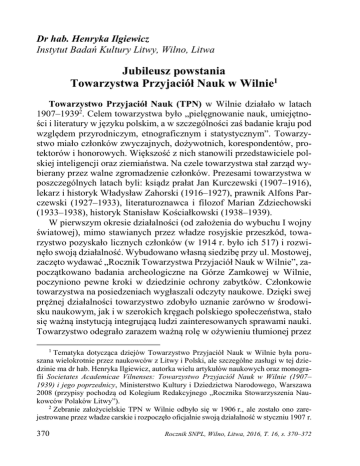 Dr hab. Henryka Ilgiewicz Instytut Badań Kultury Litwy, Wilno, Litwa Jubileusz powstania Towarzystwa Przyjaciół Nauk w Wilnie1 Towarzystwo Przyjaciół Nauk (TPN) w Wilnie działało w latach 1907–19392. Celem towarzystwa było „pielęgnowanie nauk, umiejętności i literatury w języku polskim, a w szczególności zaś badanie kraju pod względem przyrodniczym, etnograficznym i statystycznym”. Towarzystwo miało członków zwyczajnych, dożywotnich, korespondentów, protektorów i honorowych. Większość z nich stanowili przedstawiciele polskiej inteligencji oraz ziemiaństwa. Na czele towarzystwa stał zarząd wybierany przez walne zgromadzenie członków. Prezesami towarzystwa w poszczególnych latach byli: ksiądz prałat Jan Kurczewski (1907–1916), lekarz i historyk Władysław Zahorski (1916–1927), prawnik Alfons Parczewski (1927–1933), literaturoznawca i filozof Marian Zdziechowski (1933–1938), historyk Stanisław Kościałkowski (1938–1939). W pierwszym okresie działalności (od założenia do wybuchu I wojny światowej), mimo stawianych przez władze rosyjskie przeszkód, towarzystwo pozyskało licznych członków (w 1914 r. było ich 517) i rozwinęło swoją działalność. Wybudowano własną siedzibę przy ul. Mostowej, zaczęto wydawać „Rocznik Towarzystwa Przyjaciół Nauk w Wilnie”, zapoczątkowano badania archeologiczne na Górze Zamkowej w Wilnie, poczyniono pewne kroki w dziedzinie ochrony zabytków. Członkowie towarzystwa na posiedzeniach wygłaszali odczyty naukowe. Dzięki swej prężnej działalności towarzystwo zdobyło uznanie zarówno w środowisku naukowym, jak i w szerokich kręgach polskiego społeczeństwa, stało się ważną instytucją integrującą ludzi zainteresowanych sprawami nauki. Towarzystwo odegrało zarazem ważną rolę w ożywieniu tłumionej przez Tematyka dotycząca dziejów Towarzystwo Przyjaciół Nauk w Wilnie była poruszana wielokrotnie przez naukowców z Litwy i Polski, ale szczególne zasługi w tej dziedzinie ma dr hab. Henryka Ilgiewicz, autorka wielu artykułów naukowych oraz monografii Societates Academicae Vilnenses: Towarzystwo Przyjaciół Nauk w Wilnie (1907– 1939) i jego poprzednicy, Ministerstwo Kultury i Dziedzictwa Narodowego, Warszawa 2008 (przypisy pochodzą od Kolegium Redakcyjnego „Rocznika Stowarzyszenia Naukowców Polaków Litwy”). 2 Zebranie założycielskie TPN w Wilnie odbyło się w 1906 r., ale zostało ono zarejestrowane przez władze carskie i rozpoczęło oficjalnie swoją działalność w styczniu 1907 r. 1 370 Rocznik SNPL, Wilno, Litwa, 2016, T. 16, s. 370–372 Rocznik Stowarzyszenia Naukowców Polaków Litwy, T. 16 zaborcę polskiej świadomości narodowej oraz w szerzeniu polskiej kultury na Ziemi Wileńskiej. W ciągu pierwszych siedmiu lat swej działalności zdołało ono opracować zasady działania, co umożliwiło mu przetrwanie w trudnych latach I wojny światowej oraz okupacji niemieckiej i bolszewickiej. Nowy okres w dziejach Towarzystwa Przyjaciół Nauk w Wilnie rozpoczął się po włączeniu Wilna i Wileńszczyzny w 1922 r. w do państwa polskiego. W 1922 r. przyjęto nowy statut i powołano trzy wydziały naukowe: I – filologii, literatury i sztuki; II – nauk matematyczno-przyrodniczych i lekarskich; III – historii, filozofii i nauk prawno-społecznych. Na wydziałach składających się wyłącznie z osób pracujących naukowo koncentrowała się właściwie cała działalność naukowa i wydawnicza towarzystwa. Wydział I wydawał „Rozprawy i Materiały Wydziału I Towarzystwa Przyjaciół Nauk w Wilnie” oraz „Prace i Materiały Sprawozdawcze Sekcji Historii Sztuki Towarzystwa Przyjaciół Nauk w Wilnie”; Wydział II – „Prace Towarzystwa Przyjaciół Nauk w Wilnie. Wydział Nauk Matematyczno-Przyrodniczych”; Wydział III – „Rozprawy Wydziału III Towarzystwa Przyjaciół Nauk w Wilnie” oraz „Źródła i Materiały Historyczne Wydziału III Towarzystwa Przyjaciół Nauk w Wilnie”. Wydział III wydawał również czasopismo naukowe „Ateneum Wileńskie”, które zastąpiło wydawany do 1921 r. „Rocznik Towarzystwa Przyjaciół Nauk w Wilnie”. Był to znaczny dorobek naukowy i wydawniczy. Liczącymi się placówkami kulturowymi w Wilnie były biblioteka i muzeum Towarzystwa Przyjaciół Nauk. W chwili wybuchu II wojny światowej biblioteka posiadała około 120 tys. tomów, nie licząc około 20 tys. tomów dubletów. Nie brakło w niej starodruków i książek rzadkich. Dział rękopisów na dzień 1 stycznia 1939 r. zawierał 1 033 tek oraz 2 405 dokumentów, aktów i listów luźnych. Członkowie towarzystwa mogli wypożyczać z biblioteki książki do domu, natomiast w czytelni korzystały z nich także osoby pracujące naukowo, polecone przez członków zarządu, oraz młodzież akademicka. W zbiorach muzeum w 1939 r. znajdowało się około 60 tys. skatalogowanych przedmiotów. Muzeum było chętnie zwiedzane przez młodzież szkolną i akademicką z Wilna i z całej Polski, a także przez słuchaczy różnych kursów nauczycielskich. Zaszczycali go swą obecnością wysocy urzędnicy państwowi i goście zagraniczni. Towarzystwo nawiązywało i utrzymywało kontakty z innymi placówkami naukowymi w kraju i za granicą, wymieniało z nimi druki, 371 Naukowcy z Wileńszczyzny jego członkowie uczestniczyli w zjazdach, obchodach, wystawach. TPN współpracowało z Uniwersytetem Stefana Batorego, towarzystwami naukowymi i kulturowymi, z bibliotekami i muzeami wileńskimi. Często organizowało z nimi wspólne uroczyste posiedzenia, obchody ważnych wydarzeń historycznych oraz jubileuszy działaczy zasłużonych dla nauki i kultury polskiej. Towarzystwo zostało zlikwidowane w latach II wojny światowej. Po włączeniu Wilna w skład Republiki Litewskiej w październiku 1939 r. placówka ta na pewien czas zachowała swój majątek, ale pomimo podjętych starań nie uzyskała zgody władz litewskich na legalną działa