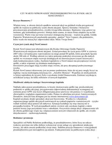 CZY WARTO WPROWADZIĆ PRZEDSIĘBIORSTWO NA RYNEK AKCJI NEWCONNECT Kryzys finansowy ? Właśnie teraz, w okresie dużych spadków notowań akcji na giełdach trzeba przygotować spółki do wejścia na publiczny rynek obrotu akcjami. Sprawy formalne i biznesowe przystosowanie przedsiębiorstwa, zwykle trwają kilka miesięcy. Będziemy więc gotowi na moment, gdy koniunktura powróci. Istnieje duża szansa, że nasza firma znajdzie się na fali wzrostowej. Warto więc już teraz rozważyć strategiczną decyzję – wejścia na giełdę. Giełda Papierów Wartościowych uruchomiła specjalny „parkiet” New Connect, dla podmiotów, które wcale nie muszą być odpowiednio duże. Może Twoja firma ? Czym jest rynek akcji NewConnect Rynek NewConnect jest alternatywnym dla Rynku Głównego Giełdy Papierów Wartościowych miejscem obrotu akcjami. Został powołany do życia przez GPW w czerwcu 2007 roku i od tamtej pory wprowadzono na niego ponad 60 spółek, które pozyskały łącznie około 300 mln zł. Według założeń (co także pokazuje praktyka) stworzono go dla małych spółek we wczesnym etapie rozwoju działających na innowacyjnym (często niszowym) i mało konkurencyjnym rynku. Zasilenie kapitałowe z NewConnect ma przyspieszyć rozwój spółki, a także wspomóc jej działania marketingowe. Inwestorów przyciągać mają wysokie stopy zwrotu, ale przy akceptacji podwyższonego ryzyka. Rynek NewConnect skierowany jest na pomoc podmiotom, które do tej pory mogły liczyć na mglistą i raczej niedostępną instytucję tzw. „Aniołów Biznesu”. Wypełnia on strefę potrzeb, w której najtrudniej do tej pory było o uzyskanie źródeł finansowania. Emitenci uzyskują tu od kilkuset tysięcy do kilku milionów zł nowych kapitałów. Możliwość zdobycia taniego i bezzwrotnego kapitału Nakłady jakie ponosi przedsiębiorca, to koszty dostosowania spółki (np. przekształcenie podmiotu w spółkę akcyjną), przygotowania odpowiedniej dokumentacji wymaganej od emitenta przez GPW oraz koszt obligatoryjnej przez pierwszy rok pomocy w wypełnianiu obowiązków względem organizatora rynku. Pomoc ta udzielana jest przez Autoryzowanych Doradców, których lista dostępna jest na stronie internetowej www.newconnect.pl. Kapitał uzyskany dzięki sprzedaży akcji jest bezzwrotny. Wynika to z charakteru organizacyjnego spółek akcyjnych notowanych na rynkach papierów wartościowych – ryzyko wahań wartości akcji ponosi ich nabywca. Sytuacja kształtuje się więc inaczej niż w przypadku kredytu. W tych przypadkach należy zwrócić cały uzyskany kapitał, a także ponieść koszty jego pozyskania wraz z odsetkami. Oczywiście emisja akcji i dopuszczenie ich do obrotu giełdowego wiąże się z dopuszczeniem nowych właścicieli do spółki, ale zwykle dotychczasowi – zachowują kontrolę. Reklama i promocja Specjaliści od Public Relations podkreślają, że przedsiębiorstwo, które liczy na sukces rynkowy powinno nie tylko dobrze wykonywać swoje usługi czy sprzedawać atrakcyjne towary, ale także mocno podkreślać swoje atuty. Stabilna pozycja finansowa i wiarygodność przedsiębiorstwa jest niewątpliwie jej atutem. Funkcjonowanie na publicznym rynku akcji – 1 uwiarygodnia spółkę w oczach jej kontrahentów, w tym banków, dostawców i pracowników. Spółka, która istnieje na rynku giełdowym otrzymuje dodatkowo silną promocję, m. in. dzięki ukazywaniu się o niej licznych informacji w serwisach giełdowych. W ten sposób wyrabia swoją markę, a dobry wizerunek przekłada się na wyniki finansowe. Pierwszy krok na duży parkiet Poważny przypływ środków na inwestycje (z emisji akcji) daje duże możliwości rozwoju. Dobrze wykorzystane pieniądze w oparciu o oryginalne pomysły i odpowiednie realizowanie biznesu, a także odpowiednia promocja spółki doprowadza zwykle do dynamicznego rozwoju, pozyskiwania nowych części rynku i coraz większych przychodów i zysków. Dzięki temu spółki, które weszły na NewConnect mogą myśleć o tym rynku jako o pierwszym kroku na Rynek Główny GPW. Koszty wejścia Po pierwsze młodą spółkę mogą odstraszać koszty wprowadzenia na NewConnect. Cena waha się od kilkudziesięciu do kilkuset tysięcy. Koszty zależne są od wielu czynników jak np. wysokość planowanej emisji, formy prawnej przedsiębiorstwa, skala akcji promocyjnej. Dodatkowo regulamin Alternatywnego Systemu Obrotu wymaga od debiutanckiego emitenta współpracy z Autoryzowanym Doradcą. Warto jednak zaznaczyć, że można ubiegać się o refinansowanie nawet do 50% kosztów wejścia na rynek z funduszy Unii Europejskiej. Relacje inwestorskie Analitycy giełdowi zarzucają rynkowi NewConnect słaby dostęp inwestorów do informacji o spółkach. Stanowi to pewną barierę dla inwestorów przyzwyczajonych do pełnej przejrzystości działań, planów i wyników emitenta. Problem ten został dostrzeżony przez GPW, która opracowała i w najbliższym czasie wprowadzi w życie nowe zasady mające na celu zwiększenie transparentności spółek notowanych na rynku. Obecnie spółka rynku New Connect składa kwartalne informacje finansowe oraz bieżące raporty o istotnych zdarzeniach. Wahania cen akcji Problemem rynku New Connect są duże wahania cen akcji. Bywa, że ceny akcji zmieniają wartość o kilka – kilkanaście procent. Jak jednak zaznaczano wyżej, rynek NewConnect jest z założenia skierowany do inwestorów decydujących się na większe ryzyko i dłuższy okres oczekiwania na zysk. Jednakże duże ryzyko może oznaczać duże zyski dla inwestorów. Słabo płynne akcje Na rynku NewConnect funkcjonują małe i średnie podmioty gospodarcze. Liczba akcjonariuszy, właścicieli poszczególnych spółek, zwykle nie jest duża. Transakcje kupnasprzedaży akcji realizowane są, w ponad 90 % przez inwestorów indywidualnych. Stąd płynność obrotu akcjami nie jest duża. Dzienny obrót całego rynku NewConnet, to zaledwie kilka mil