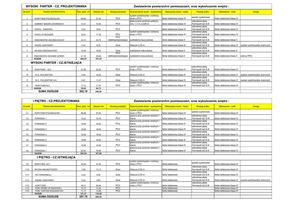 Zestawienie powierzchni pomieszczeń, oraz wykończenie wnętrz : WYSOKI PARTER - CZ. PROJEKTOWANA Nr pom. 1 Nazwa pomieszczenia Pow. jedn. m² Obwód mb Rodzaj posadzki 68,68 57,04 PCV KORYTARZ-POCZEKALNIA 2 GABINET BADAŃ LEKARSKICH 14,31 18,92 PCV 3 POKÓJ NADZORU 5,43 9,64 PCV 4 POKÓJ WYBUDZEŃ 18,81 17,35 5 ENDOSKOPIA ODCINEK DOLNY 34,72 25,72 PCV PCV elektroprzewodząca 6 WĘZEŁ SANITARNY 4,42 8,56 Gres 7 MYJNIA ENDOSKOPÓW 18,99 18,62 8 ENDOSKOPIA ODCINEK GÓRNY RAZEM 41,19 206,55 25,68 181,53 Gres PCV elektroprzewodząca Wykończenie ścian - wykładzina system podchwytów i ochrony ścian z PCV glazura przy punkcie wodnym min. 1,7 m x 2,05 m Malowanie ścian - farba farba lateksowa klasa IV farba lateksowa klasa IV system podchwytów i ochrony ścian z PCV farba lateksowa klasa IV wykładzina kauczukowa farba lateksowa klasa II Glazura 2,05 m farba lateksowa klasa IV wykładzina kałczukowa farba lateksowa klasa II wykładzina kauczukowa farba lateksowa klasa II farba lateksowa klasa IV Rodzaj sufitu panele systemowe zabudowa płytą Fermacell lub G-K zabudowa płytą Fermacell lub G-K zabudowa płytą Fermacell lub G-K zabudowa płytą Fermacell lub G-K zabudowa płytą Fermacell lub G-K zabudowa płytą Fermacell lub G-K zabudowa płytą Fermacell lub G-K Malowanie - sufit Uwagi farba lateksowa klasa IV farba lateksowa klasa IV farba lateksowa klasa IV farba lateksowa klasa IV farba lateksowa klasa II farba lateksowa klasa IV system podchwytów ściennych farba lateksowa klasa II farba lateksowa klasa II osłony RTG WYSOKI PARTER - CZ.ISTNIEJĄCA 9 KORYTARZ - B.Z. 27,06 25,29 PCV system podchwytów i ochrony ścian z PCV farba lateksowa klasa IV 10 W.C. PACJENTÓW 4,64 10,52 Gres Glazura 2,05 m farba lateksowa klasa IV 11 W.C. PACJENTÓW N.S. 6,81 11,47 Gres farba lateksowa klasa IV 17,13 55,64 17,47 64,75 PCV Glazura 2,05 m system podchwytów i ochrony ścian z PCV 262,19 246,28 12 KORYTARZ-B.Z. RAZEM SUMA OGÓŁEM I PIĘTRO - CZ.PROJEKTOWANA Nr pom. Nazwa pomieszczenia Pow. jedn. m² Obwód mb Rodzaj posadzki 68,68 57,04 PCV Wykończenie ścian - wykładzina 1/2 PORADNIA 1 19,43 18,76 PCV 1/3 PORADNIA 2 18,99 18,62 PCV 1/4 PORADNIA 3 18,99 18,62 PCV 1/5 PORADNIA 4 18,99 18,62 PCV 1/6 PORADNIA 5 18,99 18,62 PCV 1/7 PORADNIA 6 18,99 18,62 PCV 1/8 PORADNIA 7 RAZEM 20,44 203,50 19,08 187,98 PCV 35,20 31,20 PCV system podchwytów i ochrony ścian z PCV KORYTARZ-POCZEKALNIA farba lateksowa klasa IV farba lateksowa klasa IV system podchwytów ściennych farba lateksowa klasa IV system podchwytów ściennych farba lateksowa klasa IV Zestawienie powierzchni pomieszczeń, oraz wykończenie wnętrz : system podchwytów i ochrony ścian z PCV glazura przy punkcie wodnym i blacie glazura przy punkcie wodnym i blacie glazura przy punkcie wodnym i blacie glazura przy punkcie wodnym i blacie glazura przy punkcie wodnym i blacie glazura przy punkcie wodnym i blacie glazura przy punkcie wodnym i blacie 1/1 farba lateksowa klasa IV zabudowa płytą Fermacell lub G-K zabudowa płytą Fermacell lub G-K zabudowa płytą Fermacell lub G-K zabudowa płytą Fermacell lub G-K Malowanie ścian - farba farba lateksowa klasa IV farba lateksowa klasa IV farba lateksowa klasa IV farba lateksowa klasa IV farba lateksowa klasa IV farba lateksowa klasa IV farba lateksowa klasa IV farba lateksowa klasa IV Rodzaj sufitu panele systemowe zabudowa płytą Fermacell lub G-K zabudowa płytą Fermacell lub G-K zabudowa płytą Fermacell lub G-K zabudowa płytą Fermacell lub G-K zabudowa płytą Fermacell lub G-K zabudowa płytą Fermacell lub G-K zabudowa płytą Fermacell lub G-K Malowanie - sufit Uwagi farba lateksowa klasa IV farba lateksowa klasa IV farba lateksowa klasa IV farba lateksowa klasa IV farba lateksowa klasa IV farba lateksowa klasa IV farba lateksowa klasa IV farba lateksowa klasa IV I PIĘTRO - CZ.ISTNIEJĄCA 1/9 KORYTARZ B.Z. farba lateksowa 1/10 MYJNIA INKUBATORÓW 7,69 13,13 Gres Glazura 2,05 m farba lateksowa 1/11 WC PERSONELU 4,29 9,80 Gres Glazura 2,05 m farba lateksowa 1/12 WĘZEŁ SANITARNY 5,22 9,60 Gres farba lateksowa 1/13 1/14 1/15 KORYTARZ POM. PRÓBY WYSIŁKOWEJ POM. TESTÓW RUCHOWYCH RAZEM 25,21 12,73 11,17 101,51 26,69 14,30 13,48 118,20 PCV PCV PCV Glazura 2,05 m system podchwytów i ochrony ścian z PCV - SUMA OGÓŁEM 297,78 299,48 farba lateksowa farba lateksowa farba lateksowa panele systemowe zabudowa płytą Fermacell lub G-K zabudowa płytą Fermacell lub G-K zabudowa płytą Fermacell lub G-K zabudowa płytą Fermacell lub G-K - farba lateksowa klasa IV farba lateksowa klasa IV farba lateksowa klasa IV farba lateksowa klasa IV farba lateksowa klasa IV farba lateksowa klasa IV farba lateksowa klasa IV system podchwytów ściennych
