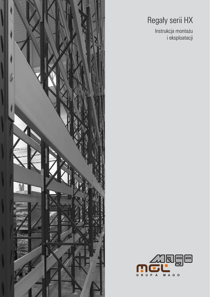 Regały serii HX Instrukcja montażu i eksploatacji G R U P A M A G O Instrukcja montażu i eksploatacji (v 1.01) 1. Spis treści 1. Spis treści 3 2. Wstęp 5 3. Definicje i określenia 6 4. System 7 4.1. Charakterystyka 7 4.2. Zastosowania 8 4.2.1. Składowanie ładunków na paletach typu EPAL-EUR 8 4.2.2. Składowanie ładunków na paletach przemysłowych 1200 x 1200 mm 8 4.2.3. Składowanie ładunków niestandardowych 9 4.3. Elementy 10 4.3.1. Ramy (nogi) 10 4.3.2. Trawersy 12 4.3.3. Elementy zabezpieczające 14 4.3.4. Akcesoria 17 4.4. Wymiary 18 4.4.1. Wymagania FEM 18 4.4.2. Zależności wymiarowe systemu HX 21 4.5. Nośność (obciążenia dopuszczalne) 22 4.5.1. Wymagania dotyczące podłoża 22 4.5.2. Nośność konstrukcji regałowej 24 5. Montaż 26 5.1. Transport i składowanie 26 5.2. Kompletacja części 26 5.3. Montaż ram 27 5.4. Ustawianie regałów 33 5.5. Kotwienie 36 5.6. Dokładność montażu (dopuszczalne odchyłki wymiarów) 37 5.7. Oznakowanie 38 Grupa MAGO - Regały serii HX MAGO 060/INS01/2008.06.10 www.mago.pl Instrukcja montażu i eksploatacji (v 1.01) 6. Eksploatacja Instrukcja montażu i eksploatacji (v 1.01) 40 6.1. Wymagania ogólne 40 6.2. Kontrola i konserwacja 40 6.2.1. Przeglądy okresowe 40 6.2.2. Klasyfikacja uszkodzeń 42 6.3. Postępowanie w przypadku awarii 44 6.4. Notatki 46 Grupa MGL MAGO sp. z -o.o. Regały - Regały serii serii HX HX MAGO 060/INS01/2008.06.10 www.mgltechnika.pl www.mago.pl Instrukcja montażu i eksploatacji (v 1.01) 2. Wstęp FEM (Fédération Europeénne De La Montantion – Europejska Federacja Utrzymania) we wrześniu 1995 roku opublikowała dokument (będący rezultatem prac nad wszelkimi aspektami bezpieczeństwa i trwałości konstrukcji) dotyczący obliczeń, prób i projektowania stalowych regałów magazynowych. Dokument ten został oznaczony FEM 10.2.02. Ponieważ norma FEM 10.2.02 wprowadziła wiele specyficznych wymagań dla procesu projektowania i weryfikacji konstrukcji został wprowadzony dwuletni okres przygotowawczy (kilkakrotnie przedłużany), aby umożliwić producentom i dostawcom przygotowanie odpowiedniej bazy badań, oprogramowania do obliczeń oraz wyszkolenie personelu do działania zgodnie ze standardem FEM 10.2.02. Zespoły projektowe MAGO nieustannie prowadzą prace nad rozwojem produktów. W przypadku regałów magazynowych wszelkie prace uwzględniały konieczność dostosowania się do wymagań zarówno FEM 10.2.02 jak i EN 15512. Procesy badań wytrzymałościowych, obliczeń i weryfikacji produkcji bieżącej są prowadzone przez MAGO we współpracy z akredytowanymi jednostkami badawczymi. Wszelkie informacje przedstawione w dalszej części dokumentacji są zgodne z wymaganiami normy FEM 10.2.02 CEN (Comité Européen de Normalisation - Europejski Komitet Normalizacyjny) prowadzi prace nad wdrożeniem normy EN 15512 będącej odpowiednikiem FEM 10.2.02. Obecnie norma ta znajduje się w fazie akceptacji. Jej wejście w życie było ustalone na rok 2007, następnie przesunięte na początek roku 2008, obecnie komitet 344 informuje, że termin jest ustalony na luty 2009. Norma EN 15512 w momencie wejścia w życie zacznie obowiązywać w całej Unii Europejskiej. Ważne! Dokładne zapoznanie się z Dokumentacją Techniczno Ruchową jest bezwzględnie wymagane w celu poprawnego, bezpiecznego korzystania z systemu regałowego HX. Mamy nadzieję, że poniższe informacje ułatwią codzienną pracę naszym klientom lub będą pomocne w podjęciu decyzji zakupu naszych produktów Grupa MAGO - Regały serii HX MAGO 060/INS01/2008.06.10 www.mago.pl Instrukcja montażu i eksploatacji (v 1.01) 3. Definicje i określenia Blok regałowy – konstrukcja zbudowana z jednego lub wielu ciągów regałowych, połączonych ze sobą za pomocą specjalnych elementów, nazywanych łącznikami międzyregałowymi. Jako, że nie są obecnie dostępne oficjane tłumaczenia norm FEM 10.2.02 na język polski, określenia stosowane w niniejszej dokumentacji przyjęto zgodne z normami PN-M-78320, PN-M-78321, nomenklaturą zakładową oraz nazewnictwem używanym w „Kryteriach oceny wyrobów pod względem bezpieczeństwa” przygotowanych przez Instytut Mechanizacji Budownictwa i Górnictwa Skalnego w Warszawie – jednostkę wyznaczoną przez Polskie Centrum Badań i Certyfikacji do przeprowadzenia procedury certyfikacji regałów magazynowych stałych na znak bezpieczeństwa „B”. Regałowy moduł montażowy – faza przejściowa w procesie montażu regału (2 ramy, 2 trawersy). Regałowy moduł montażowy nie jest regałem i nie może być obciążany. Obciążenie regału – masa ładunku umieszczona na/ w regale. Regał – wielopoziomowa konstrukcja przestrzenna, przeznaczona do składowania zapasów. Obciążenie nominalne (nośność regału) – maksymalna, deklarowana przez producenta, masa ładunku umieszczona na/w regale. Regał stały – regał, którego elementy konstrukcyjne zachowują stałe położenie w czasie procesu składowania zapasów, przy czym może on być związany lub niezwiązany z podłożem. Stateczność podłużna regału – zdolność regału do zachowania równowagi trwałej (całej konstrukcji oraz jej elementów) pod wpływem działania poziomych sił wzdłuż pionowej, podłużnej płaszczyzny symetrii regału. Regał ramowy – regał, którego zasadniczym elementem konstrukcyjnym jest powtarzający się układ ramowy. Stateczność poprzeczna regału – zdolność regału do zachowania równowagi trwałej (całej konstrukcji oraz jej elementów) pod wpływem działania sił prostopadłych do pionowej, podłużnej płaszczyzny symetrii regału. Rama – konstrukcja kratownicowa zbudowana ze słupów i stężeń. W nomenklaturze handlowej rama jest określana także jako noga. Słupy – pionowe elementy nośne ramy regału. Składniki systemu regałowego: Stężenia – elementy łączące słupy, tworzące wraz ze słupami ramę regału. Elementy podstawowe systemu – czę