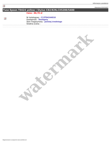 Informacje o produkcie Utworzono 02-03-2017 Tusz Epson T0424 yellow | Stylus C82/82N,CX5200/5400 Cena : 86,70 zł w at er m ar k Nr katalogowy : C13T04244010 Dostępność : Dostępny Stan magazynowy : poniżej średniego Średnia ocena : Wygenerowano w programie www.oscGold.com