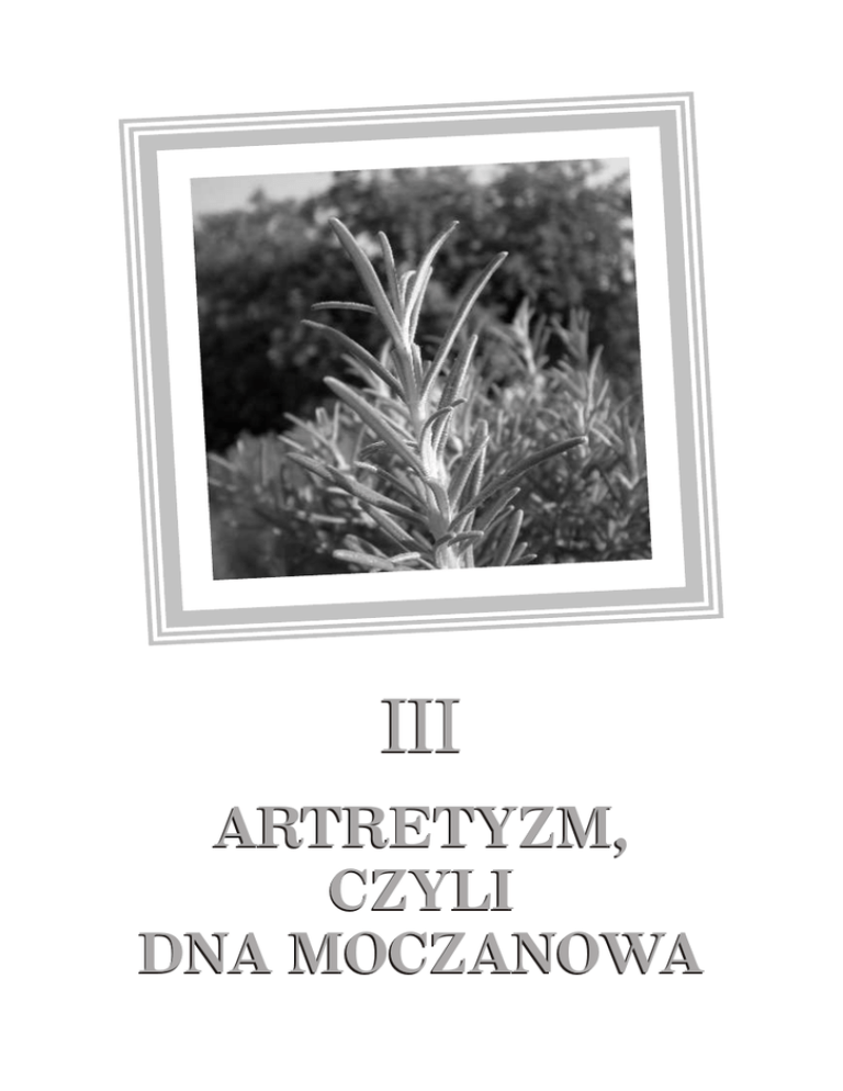 III ARTRETYZM, CZYLI DNA MOCZANOWA Artretyzm, czyli dna moczanowa Artretyzm bywa także nazywany dną moczanową lub ska- zą moczanową i jest spowodowany wzmożoną skłonnością do gromadzenia się w stawach (i nie tylko) złogów kwasu moczowego. Aż trudno uwierzyć, że dotychczas medycyna rozpoznała około 150 rodzajów tej choroby. Ogólnie rzecz biorąc, wyróżniamy dwa podstawowe typy dny moczanowej – wrodzoną i nabytą. Częściej na tę chorobę zapadają mężczyźni – zwykle po 40. roku życia (z badań wynika, że atakuje ich aż 20 razy częściej niż kobiety). U panów, którzy ukończyli 65 lat, stwierdza się ją w 7%. Natomiast u kobiet choroba ta najintensywniej rozwija się po okresie menopauzy (klimakterium). Najczęściej ból wywołany atakiem artretyzmu pojawia się w nocy (wskutek obniżonej ciepłoty ciała) lub rano (niekiedy zaraz po przebudzeniu). Staje się coraz bardziej dotkliwy. Po kilku dniach może już być nie do zniesienia (daje uczucie rozpierania stawów). Zaatakowany staw staje się bardzo wrażliwy na dotyk, obrzęknięty, skóra na nim jest napięta i przyjmuje na początku kolor czerwony, potem sinoczerwony. Atakowi towarzyszy stan zapalny stawów, dreszcze i podwyższona temperatura ciała. Złogi kwasu moczowego najczęściej odkładają się w kaletkach maziowych stawów w różnych miejscach (stawy kolana, palucha, dłoni, barku, kręgosłupa). Jeżeli zlekceważy się pierwszy atak artretyzmu zlokalizowany w stawach i nie podejmie żadnego leczenia – złogi w jego postaci zaczną się odkładać już nie tylko w stawach czy kaletkach maziowych, ale i tkankach miękkich — 21 — Reumatyzm, bóle stawów i kręgosłupa organizmu. Są to przeważnie części najmniej ukrwione, np. ścięgna, okolice pięt lub małżowiny uszne (uszy wyglądają wtedy jak z wosku – mają nienaturalny żółtawowoskowy kolor). Kwas moczowy zamienia się w tzw. guzki dnawe. W przypadku złogów zgromadzonych w uszach nazywa się je w medycynie tophi. Rzecz jasna – długotrwałe kumulowanie się kwasu moczowego prowadzi do przewlekłych stanów zapalnych i zespołów bólowych stawów. Trzeba od razu podkreślić, że nie wszyscy ludzie, u których stwierdza się podwyższony poziom kwasu moczowego we krwi, odczuwają typowe ataki dny moczanowej. Szacuje się, że 2% pacjentów mających niewrodzony podwyższony poziom tego kwasu ma takie ataki. Dużo gorzej jest u ludzi ze zdiagnozowaną wrodzoną dną moczanową. U nich typowe napady tej choroby w sposób podany wcześniej obserwuje się u 20%. Przypadki dny moczanowej znane są medycynie od czasów starożytnych. Często nazywano ją „chorobą króli”, co wynikało ze spożywania dużych ilości mięsa i wywarów z nich, np. w postaci rosołu. Istota tego schorzenia nie jest tak dokładnie poznana, choć nauce udało się już dokładnie je poznać. Podwyższony poziom kwasu moczowego we krwi może wynikać z kilku czynników. Może to być wrodzona lub nabyta niewydolność nerek (nerki wówczas nie usuwają go wraz z moczem), predyspozycje genetyczne (jest duże prawdopodobieństwo ataku przez dnę moczanową, kiedy w rodzinie chorowała matka lub ojciec). Ustalono, że 12% przy— 22 — Artretyzm, czyli dna moczanowa padków dny to wynik niewłaściwej diety (obfitującej w mięso wieprzowe, jego wywary, podroby, owoce morza, fasolę, groch, soczewicę itd.), picia dużej ilości napojów słodzonych fruktozą, nadużywania alkoholu (piwo!). Powstawaniu dny moczanowej sprzyja również cukrzyca lub doprowadzenie do silnego odwodnienia organizmu (nadmierne stosowanie leków moczopędnych). W ostatnim czasie w zapobieganiu zawałowi serca i udarowi mózgu lekarze przepisują regularne zażywanie kwasu acetylosalicylowego (pod różnymi nazwami preparatów), co również może powodować podwyższenie poziomu kwasu moczowego we krwi. To samo dotyczy przyjmowania przez długi czas pewnych leków hipotensyjnych, a więc obniżających ciśnienie krwi (najczęściej taki stan obserwuje się u ludzi starszych). Opierając się na najnowszych badaniach klinicznych, można stwierdzić, że dna moczanowa dotyka też dużo częściej osoby otyłe bądź cierpiące na tzw. zespół metaboliczny, a więc występowanie u jednej osoby co najmniej trzech chorób, np. otyłości brzusznej, nadciśnienia tętniczego, insulinoodporności lub typowej cukrzycy typu 2. Okazało się, że otyłość o wskaźniku BMI 35 u mężczyzn aż trzykrotnie stwarza u nich ryzyko dny moczanowej. — 23 — Reumatyzm, bóle stawów i kręgosłupa SKĄD BIERZE SIĘ W ORGANIZMIE KWAS MOCZOWY? Kwas moczowy to szkodliwy produkt procesu przemiany materii. Powstaje w organizmie w wyniku metabolizmu puryn – składników kwasów nukleinowych. Przeważnie występuje w nim w postaci soli sodowej. Kwas moczowy należy do związków gorzej rozpuszczalnych w wodzie. W normalnych warunkach pozbywamy się go w 75% wraz z moczem, a 25% wędruje do przewodu pokarmowego i tam jest rozkładane przez bakterie gnilne. Kto cierpi z powodu złogów kwasu moczowego w organizmie, ten narzeka często na pogorszenie się samopoczucia, staje się też ociężały, z czasem pojawiają się u niego kłopoty z normalnym poruszaniem się oraz uporczywe obrzęki (m.in. powiek, stawów, twarzy). Nadmiar tego kwasu okazuje się również zdradliwy dla samych nerek, gdyż prowadzi często do ich stanu zapalnego. Może się także wytrącać w nich w postaci kamieni moczanowych lub zaostrzać ataki kolki nerkowej wywołanej kamicą nerkową (inne kamienie niż moczanowe, np. szczawianowo-wapniowe, fosforanowo-wapniowe). Nie tak dawno temu, tuż po moim wykładzie, podeszła do mnie kobieta z laską w niezbyt podeszłym wieku, która zwierzała mi się prawie ze łzami w oczach, jak z powodu niewiedzy i kompletnego zaniedbania wysoki poziom kwasu moczowego zniszczył jej stawy. Dziś większość czasu mu— 24 — Artretyzm, czyli dna moczanowa si spę
