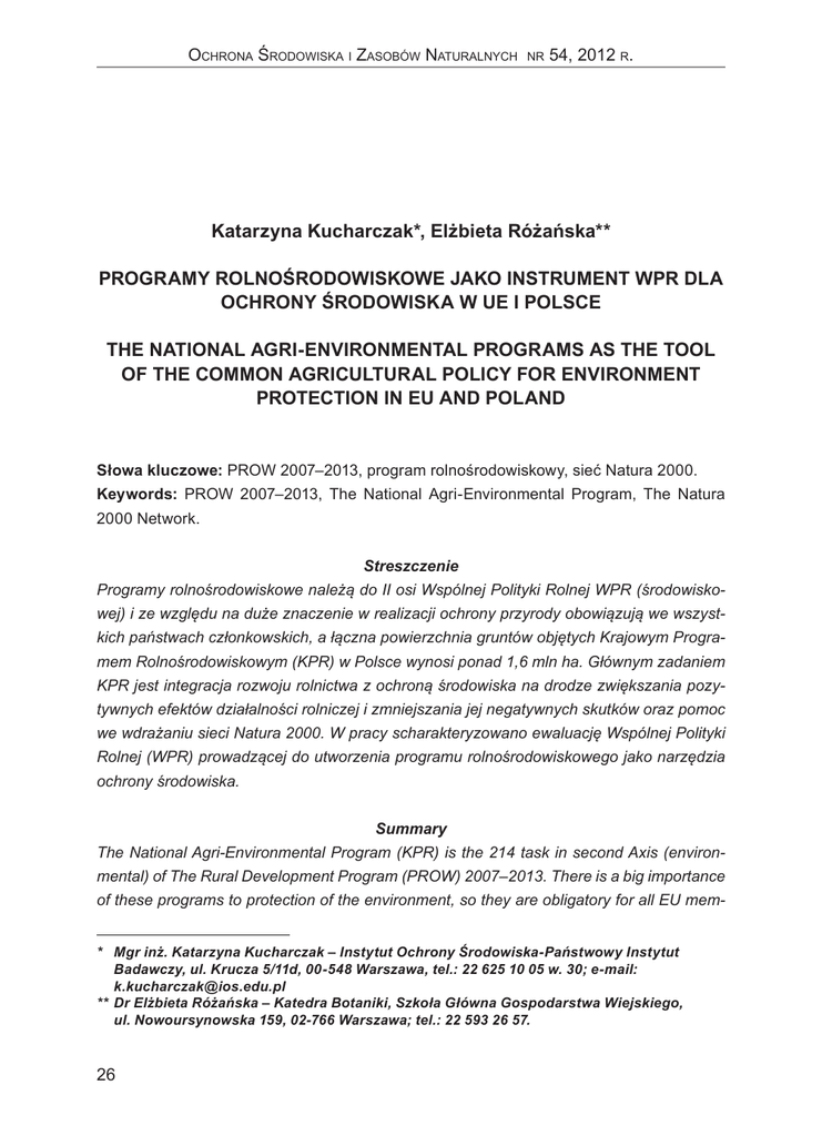 Ochrona Środowiska i Zasobów Naturalnych nr 54, 2012 r. Katarzyna Kucharczak*, Elżbieta Różańska** PROGRAMY ROLNOŚRODOWISKOWE JAKO INSTRUMENT WPR DLA OCHRONY ŚRODOWISKA W UE I POLSCE THE NATIONAL AGRI-ENVIRONMENTAL PROGRAMS AS THE TOOL OF THE COMMON AGRICULTURAL POLICY FOR ENVIRONMENT PROTECTION IN EU AND POLAND Słowa kluczowe: PROW 2007–2013, program rolnośrodowiskowy, sieć Natura 2000. Keywords: PROW 2007–2013, The National Agri-Environmental Program, The Natura 2000 Network. Streszczenie Programy rolnośrodowiskowe należą do II osi Wspólnej Polityki Rolnej WPR (środowiskowej) i ze względu na duże znaczenie w realizacji ochrony przyrody obowiązują we wszystkich państwach członkowskich, a łączna powierzchnia gruntów objętych Krajowym Programem Rolnośrodowiskowym (KPR) w Polsce wynosi ponad 1,6 mln ha. Głównym zadaniem KPR jest integracja rozwoju rolnictwa z ochroną środowiska na drodze zwiększania pozytywnych efektów działalności rolniczej i zmniejszania jej negatywnych skutków oraz pomoc we wdrażaniu sieci Natura 2000. W pracy scharakteryzowano ewaluację Wspólnej Polityki Rolnej (WPR) prowadzącej do utworzenia programu rolnośrodowiskowego jako narzędzia ochrony środowiska. Summary The National Agri-Environmental Program (KPR) is the 214 task in second Axis (environmental) of The Rural Development Program (PROW) 2007–2013. There is a big importance of these programs to protection of the environment, so they are obligatory for all EU mem* Mgr inż. Katarzyna Kucharczak – Instytut Ochrony Środowiska-Państwowy Instytut Badawczy, ul. Krucza 5/11d, 00-548 Warszawa, tel.: 22 625 10 05 w. 30; e-mail: [email protected] ** Dr Elżbieta Różańska – Katedra Botaniki, Szkoła Główna Gospodarstwa Wiejskiego, ul. Nowoursynowska 159, 02-766 Warszawa; tel.: 22 593 26 57. 26 Programy rolnośrodowiskowe jako instrument WPR dla ochrony środowiska w UE i Polsce berships. In Poland Agri-Environmental Program is applied at area of 1.6 mln ha. The overriding aim of the KPR is to protect natural resources in the pursuit of farming and specific objectives of the KPR include: application of environmentally friendly agricultural production systems, conservation of semi-natural habitats and biological diversity, preservation of native breeds and varieties of plants and raising of the environmental awareness of the rural community. It was suggested that farmers should become “the bodyguard of nature”, so farmer can successfully protect nature within his own farm. The aim of this work is to present evaluation of The Agri-Environmental Program as the EU tool for protection of environment. 1. WPROWADZENIE Krajowy Program Rolnośrodowiskowy (KPR) jest instrumentem zawartym w II osi Wspólnej Polityki Rolnej UE – WPR (środowiskowej). Uczestnictwo w Krajowym Programie Rolnośrodowiskowym ze względu na duże jego znaczenie w realizacji ochrony przyrody jest obowiązkowe dla wszystkich państw członkowskich Unii Europejskiej (UE), a łączna powierzchnia gruntów objętych Krajowym Programem Rolnośrodowiskowym w Polsce wynosi ponad 1,6 mln ha. Głównym celem realizacji Krajowego Programu Rolnośrodowiskowego jest integracja rozwoju rolnictwa z ochroną środowiska przez zwiększanie pozytywnych efektów działalności rolniczej i zmniejszanie jej negatywnych skutków oraz pomoc we wdrażaniu sieci Natura 2000. 2. PODSTAWY PRAWNE PROGRAMÓW ROLNOŚRODOWISKOWYCH W Unii Europejskiej W Traktacie Rzymskim z 1957 roku ustanowiono Wspólną Politykę Rolną Unii Europejskiej (Common Agricultural Policy – CAP) oraz wprowadzono prawo ochrony środowiska, jako podstawę prawodawstwa w zakresie ochrony środowiska naturalnego. Wspólna Polityka Rolna UE (WPR) nastawiona była początkowo na zwiększanie efektywności rolnictwa, co w efekcie doprowadziło do intensywnego rozwoju regionów o korzystnych warunkach gospodarowania, a jednocześnie do niekorzystnych zmian w środowisku naturalnym i zanikiem gospodarki rolnej w regionach o glebach słabych oraz górskich [Niewęgłowska 2003]. W Dyrektywie 268/75 obszary problemowe (LFA) podzielono na 3 grupy [Liro 2000]: ●● obszary górskie i podgórskie, ●● „zwykłe” LFA (tereny o glebach słabych, niskiej produktywności i dochodowości gospodarstw), ●● „specjalne” LFA (niewielkie enklawy z charakterystycznymi, naturalnymi barierami w odniesieniu do rozwoju produkcji rolniczej, jednak bardzo ważne za względu na ochronę środowiska). 27 Katarzyna Kucharczak, Elżbieta Różańska Aby zapobiec postępującym, niekorzystnym zmianom środowiskowym, wprowadzano kolejne programy i działania, np.: Pierwszy Program Działań na Rzecz Środowiska, płatności kompensacyjne dla obszarów zaniedbanych i o niekorzystnych warunkach dla rozwoju rolnictwa (ONW), instrumenty w postaci płatności za przestrzeganie ochrony środowiska na obszarach ESA (Environmental Sensitive Areas – przyrodniczo wrażliwych na zagrożenia). Ważnym działaniem stało się przyjęcie przez Unię Europejską w 1987 Jednolitego Aktu Europejskiego określającego zasady wspólnej polityki środowiskowej (Common Envirormental Policy – CEP), które to zasady musiały być od tamtej pory uwzględniane w wydawanych przez Unię Europejską aktach prawnych odnoszących się do środowiskowych skutków rolnictwa i działalności rolniczej [Stypiński 2006]. Reforma Mc Sharry’ego była pierwszym radykalnym działaniem, które stanowiło regulacje korzystne dla środowiska: zmiany w funduszach strukturalnych, system odłogowania, zmniejszenie produkcji oraz środki towarzyszące WPR, a wśród nich programy rolnośrodowiskowe [Rozporządzenie Rady WE 2078/92], program zalesiania gruntów rolnych oraz program wcześniejszych emerytur dla rolników [Rowiński 2000]. Zagadnienia leżące u podstaw reformy Mc Sharry’ego wynikały z tematów podjętych na Szczycie Ziemi w Rio de Janeiro. Na konferencji tej przyjęto Agendę 21, czyli 