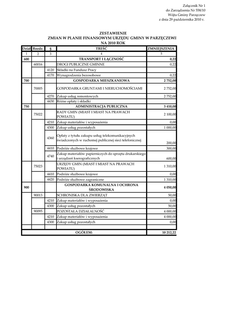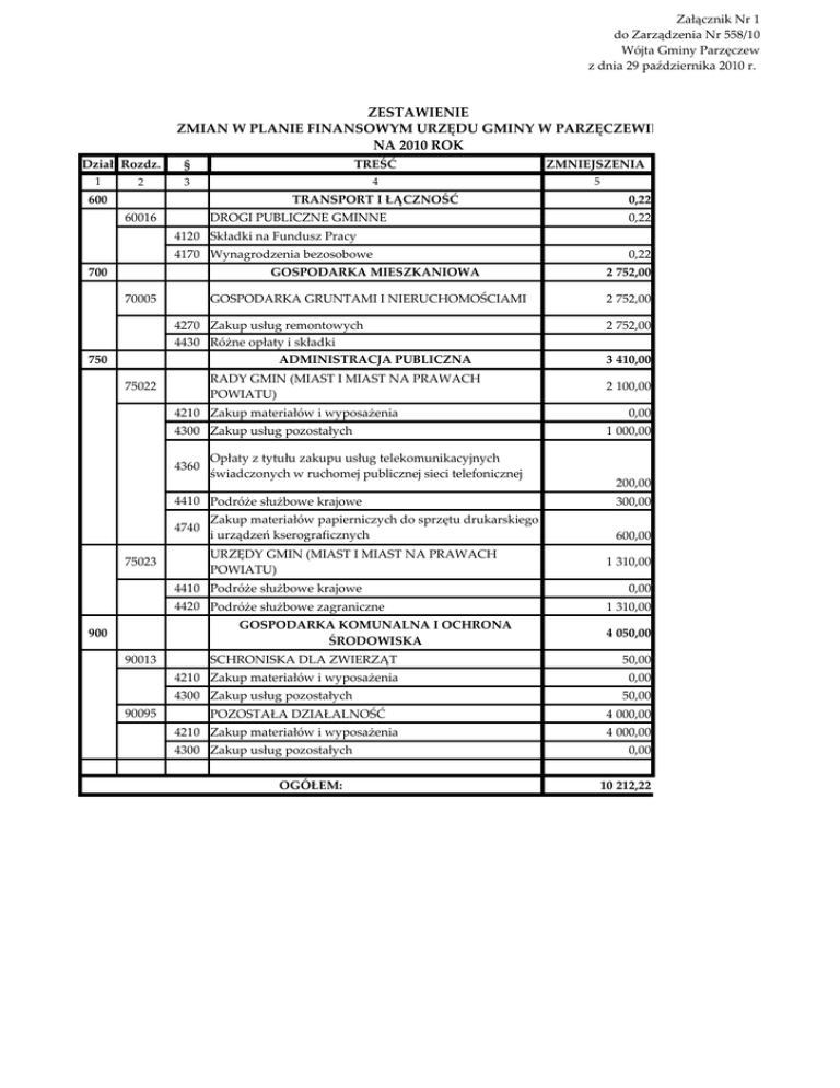 Załącznik Nr 1 do Zarządzenia Nr 558/10 Wójta Gminy Parzęczew z dnia 29 października 2010 r. ZESTAWIENIE ZMIAN W PLANIE FINANSOWYM URZĘDU GMINY W PARZĘCZEWIE NA 2010 ROK Dział Rozdz. 1 2 § TREŚĆ ZMNIEJSZENIA 3 4 5 600 TRANSPORT I ŁĄCZNOŚĆ 60016 DROGI PUBLICZNE GMINNE 0,22 0,22 4120 Składki na Fundusz Pracy 4170 Wynagrodzenia bezosobowe 700 GOSPODARKA MIESZKANIOWA 70005 GOSPODARKA GRUNTAMI I NIERUCHOMOŚCIAMI 4270 Zakup usług remontowych 4430 Różne opłaty i składki ADMINISTRACJA PUBLICZNA 750 RADY GMIN (MIAST I MIAST NA PRAWACH POWIATU) 75022 4210 Zakup materiałów i wyposażenia 4300 Zakup usług pozostałych 4360 Opłaty z tytułu zakupu usług telekomunikacyjnych świadczonych w ruchomej publicznej sieci telefonicznej 4410 Podróże służbowe krajowe 4740 75023 Zakup materiałów papierniczych do sprzętu drukarskiego i urządzeń kserograficznych URZĘDY GMIN (MIAST I MIAST NA PRAWACH POWIATU) 4410 Podróże służbowe krajowe 4420 Podróże służbowe zagraniczne GOSPODARKA KOMUNALNA I OCHRONA ŚRODOWISKA 900 90013 2 752,00 2 752,00 3 410,00 2 100,00 0,00 1 000,00 200,00 300,00 600,00 1 310,00 0,00 1 310,00 4 050,00 SCHRONISKA DLA ZWIERZĄT 50,00 4210 Zakup materiałów i wyposażenia 0,00 4300 Zakup usług pozostałych 90095 0,22 2 752,00 POZOSTAŁA DZIAŁALNOŚĆ 4210 Zakup materiałów i wyposażenia 4300 Zakup usług pozostałych OGÓŁEM: 50,00 4 000,00 4 000,00 0,00 10 212,22 Załącznik Nr 1 do Zarządzenia Nr 558/10 Wójta Gminy Parzęczew z dnia 29 października 2010 r. ARZĘCZEWIE ZWIĘKSZENIA 6 0,22 0,22 0,22 0,00 2 752,00 2 752,00 0,00 2 752,00 3 410,00 2 100,00 2 100,00 1 310,00 1 310,00 4 050,00 50,00 50,00 0,00 4 000,00 0,00 4 000,00 10 212,22 Załącznik Nr 2 do Zarządzenia Nr ..../10 Wójta Gminy Parzęczew z dnia 29 października 2010 r. ZESTAWIENIE ZMIAN W PLANIE FINANSOWYM PROJEKTU PN. "WEJDŹ NA SZCZYT" NA 2010 ROK Dział Rozdz. 1 2 801 80101 § TREŚĆ ZMNIEJSZENIA 3 4 5 OŚWIATA I WYCHOWANIE SZKOŁY PODSTAWOWE 4117 Składki na ubezpieczenia społeczne. Pozostałe 410,17 410,17 20,35 Składki na ubezpieczenia społeczne. Współfinansowanie programów i projektów realizowanych ze środków z 4119 funduszy strukturalnych, Funduszu Spójności, Europejskiego Funduszu Rybackiego oraz z funduszy unijnych finansujących Wspólną Politykę Rolną 3,49 4127 Składki na Fundusz Pracy. Pozostałe 0,00 Składki na Fundusz Pracy. Współfinansowanie programów i projektów realizowanych ze środków z funduszy 4129 strukturalnych, Funduszu Spójności, Europejskiego Funduszu Rybackiego oraz z funduszy unijnych finansujących Wspólną Politykę Rolną 0,06 4177 Wynagrodzenia bezosobowe. Pozostałe 0,03 Wynagrodzenia bezosobowe. Współfinansowanie programów i projektów realizowanych ze środków z 4179 funduszy strukturalnych, Funduszu Spójności, Europejskiego Funduszu Rybackiego oraz z funduszy unijnych finansujących Wspólną Politykę Rolną 0,00 4217 Zakup materiałów i wyposażenia. Pozostałe 161,51 Zakup materiałów i wyposażenia. Współfinansowanie programów i projektów realizowanych ze środków z 4219 funduszy strukturalnych, Funduszu Spójności, Europejskiego Funduszu Rybackiego oraz z funduszy unijnych finansujących Wspólną Politykę Rolną 28,50 Zakup pomocy naukowych, dydaktycznych i książek. Pozostałe 0,00 4247 Zakup pomocy naukowych, dydaktycznych i książek. Współfinansowanie programów i projektów realizowanych ze 4249 środków z funduszy strukturalnych, Funduszu Spójności, Europejskiego Funduszu Rybackiego oraz z funduszy unijnych finansujących Wspólną Politykę Rolną 4307 Zakup usług pozostałych. Pozostałe Zakup usług pozostałych. Współfinansowanie programów i projektów realizowanych ze środków z funduszy 4309 strukturalnych, Funduszu Spójności, Europejskiego Funduszu Rybackiego oraz z funduszy unijnych finansujących Wspólną Politykę Rolną OGÓŁEM: 0,00 166,79 29,44 410,17 Załącznik Nr 2 do Zarządzenia Nr ..../10 Wójta Gminy Parzęczew z dnia 29 października 2010 r. NA SZCZYT" ZWIĘKSZENIA 6 410,17 410,17 0,00 0,00 0,12 0,00 0,00 0,06 0,00 0,00 348,49 61,50 0,00 0,00 410,17 Załącznik Nr 3 do Zarządzenia Nr .../10 Wójta Gminy Parzęczew z dnia 29 października 2010 r. ZESTAWIENIE ZMIAN W PLANIE FINANSOWYM PROJEKTU PN. "ROZWIŃMY SKRZYDŁA" NA 2010 ROK Dział Rozdz. 1 2 801 § TREŚĆ ZMNIEJSZENIA 3 4 5 OŚWIATA I WYCHOWANIE 80101 ZWIĘKSZENIA 6 0,18 0,18 SZKOŁY PODSTAWOWE 4127 Składki na Fundusz Pracy. Pozostałe 0,18 0,00 0,18 0,09 Składki na Fundusz Pracy. Współfinansowanie programów i projektów realizowanych ze środków z funduszy 4129 strukturalnych, Funduszu Spójności, Europejskiego Funduszu Rybackiego oraz z funduszy unijnych finansujących Wspólną Politykę Rolną 0,09 0,00 4177 Wynagrodzenia bezosobowe. Pozostałe 0,09 0,00 Wynagrodzenia bezosobowe. Współfinansowanie programów i projektów realizowanych ze środków z funduszy 4179 strukturalnych, Funduszu Spójności, Europejskiego Funduszu Rybackiego oraz z funduszy unijnych finansujących Wspólną Politykę Rolną 0,00 0,09 0,18 0,18 OGÓŁEM: Załącznik Nr 3 do Zarządzenia Nr .../10 Wójta Gminy Parzęczew z dnia 29 października 2010 r.