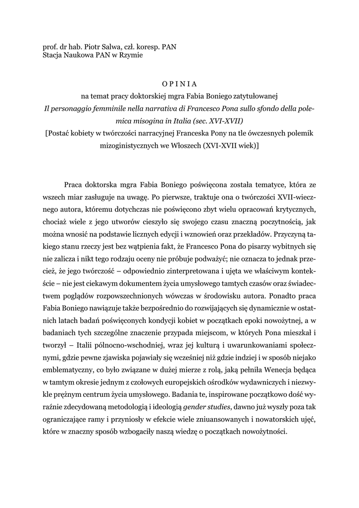 prof. dr hab. Piotr Salwa, czł. koresp. PAN Stacja Naukowa PAN w Rzymie OPINIA na temat pracy doktorskiej mgra Fabia Boniego zatytułowanej Il personaggio femminile nella narrativa di Francesco Pona sullo sfondo della polemica misogina in Italia (sec. XVI-XVII) [Postać kobiety w twórczości narracyjnej Franceska Pony na tle ówczesnych polemik mizoginistycznych we Włoszech (XVI-XVII wiek)] Praca doktorska mgra Fabia Boniego poświęcona została tematyce, która ze wszech miar zasługuje na uwagę. Po pierwsze, traktuje ona o twórczości XVII-wiecznego autora, któremu dotychczas nie poświęcono zbyt wielu opracowań krytycznych, chociaż wiele z jego utworów cieszyło się swojego czasu znaczną poczytnością, jak można wnosić na podstawie licznych edycji i wznowień oraz przekładów. Przyczyną takiego stanu rzeczy jest bez wątpienia fakt, że Francesco Pona do pisarzy wybitnych się nie zalicza i nikt tego rodzaju oceny nie próbuje podważyć; nie oznacza to jednak przecież, że jego twórczość – odpowiednio zinterpretowana i ujęta we właściwym kontekście – nie jest ciekawym dokumentem życia umysłowego tamtych czasów oraz świadectwem poglądów rozpowszechnionych wówczas w środowisku autora. Ponadto praca Fabia Boniego nawiązuje także bezpośrednio do rozwijających się dynamicznie w ostatnich latach badań poświęconych kondycji kobiet w początkach epoki nowożytnej, a w badaniach tych szczególne znaczenie przypada miejscom, w których Pona mieszkał i tworzył – Italii pólnocno-wschodniej, wraz jej kulturą i uwarunkowaniami społecznymi, gdzie pewne zjawiska pojawiały się wcześniej niż gdzie indziej i w sposób niejako emblematyczny, co było związane w dużej mierze z rolą, jaką pełniła Wenecja będąca w tamtym okresie jednym z czołowych europejskich ośrodków wydawniczych i niezwykle prężnym centrum życia umysłowego. Badania te, inspirowane początkowo dość wyraźnie zdecydowaną metodologią i ideologią gender studies, dawno już wyszły poza tak ograniczające ramy i przyniosły w efekcie wiele zniuansowanych i nowatorskich ujęć, które w znaczny sposób wzbogaciły naszą wiedzę o początkach nowożytności. 2 Omawiana tu rozprawa doktorska została skonstruowana w sposób tradycyjny i, rzec można, klasyczny. Rozważania Autora konsekwentnie i zdecydowanie zmierzają do przejrzystego i przekonującego zaprezentowania problematyki, która jest zasadniczym tematem pracy: chodzi o taką interpretację postaci kobiecych pojawiających się w wybranych utworach Franceska Pony, która pozwoliłaby na uchwycenie związków pomiędzy sposobem postrzegania i przedstawiania kobiet przez pisarza i traktatami mizoginicznymi funkcjonującymi w ówczesnym obiegu czytelniczym. Tak więc, pierwszy rozdział rozprawy poświęcony został omówieniu kilku wybranych traktatów mizoginicznych, jakie ukazały się we Włoszech w wieku XVII, oraz zasygnalizowaniu dzieł, w których autorzy reprezentowali odmienne opinie. W rozdziale drugim omówiono poglądy trzech sławnych dzisiaj autorek (Lucrezii Marinelli, Moderaty Fonte oraz Arcangeli Tarabotti), które z różnych pozycji, ale zawsze z dużą odwagą występowały w obronie płci niewieściej. Kolejny rozdział zawiera prezentacje sylwetki Pony: jego życie i działalność oraz utwory najważniejsze z punktu widzenia tezy Autora. W najobszerniejszym rozdziale następnym, stanowiącym podstawowy zrąb rozprawy, omówiono i zinterpretowano sylwetki wybranych postaci kobiecych pojawiających się w dziełach Pony, a w rozdziale ostatnim, pełniącym rolę konkluzji, podsumowano tezy przedstawione w trakcie wcześniejszych rozważaniach. Jest to układ przejrzysty i logiczny, któremu zarzucić można jedynie to, że prowadzi do pewnej rozwlekłości i powtórzeń oraz nieco „łopatologicznego” wbijania czytelnikowi do głowy tego, co już zostało dostatecznie wyjaśnione wcześniej. Dziwi nieco bibliografia, w której cytuje się m. in. prawie 150 pozycji autorów starożytnych, średniowiecznych i nowożytnych, podczas gdy w samej pracy wykorzystana została tylko niewielka ich część. Wnioski, jakie płyną z rozprawy doktorskiej mgra Boniego, nie zrewolucjonizują naszej wiedzy o kulturze XVII wieku, kondycji kobiet, ówczesnych poglądach na płeć piękną czy też o literaturze, którą określić można jako „konsumpcyjną” i konwencjonalną, przeznaczoną dla czytelnika średnio wyrobionego i średnio wykształconego; znaczenie tej pracy polega przede wszystkim na dokładniejszym rozpoznaniu pewnego konkretnego – i interesującego – obszaru, co w tym wypadku prowadzi do lepszego „umocowania” w pewnym sensie naszej dotychczasowej wiedzy. Podejmowanie tego rodzaju badań jest w moim przekonaniu uzasadnione i potrzebne. Doceniając zalety pracy i sens podjęcia tego rodzaju tematyki, dostrzegam kilka słabych punktów samej realizacji zadania badawczego. Po pierwsze, Autor ogranicza 3 zasadniczo swoje rozważania do wieku XVII, pomijając prawie zupełnie ogromną debatę na temat płci pięknej – jej niedoskonałości lub właśnie doskonałości i wyższości nad mężczyznami – jaka przetoczyła się przez włoski świat literacki w wieku XVI. W opublikowanej stosunkowo niedawno, zaktualizowanej bibliografii tematycznej wymieniono ponad 40 tekstów różnego rodzaju, poświęconych zaletom i wadom kobiet, jakie ukazały się w Italii w latach 1530-1600. Głosy w tej polemice rozkładały się różnie i przyjęcie założenia, że kultura XVII w. jest jednoznacznie i zdecydowanie wrogo nastawiona do kobiet wydaje się bardzo jednostronne i co najmniej przesadne, a późniejszy dobór tekstów nieco stronniczy. Takiemu założeniu przeczy ówczesna poezja liryczna, przeczy poczytność antologii zawierających utwory poetyckie autorstwa wyłącznie kobiet, przeczy publikowanie zbiorów listów firmowanych przez kobiety czy przyjmowanie ich do akademii. 