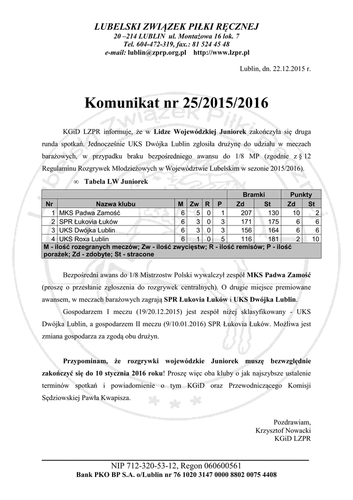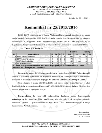Komunikat nr 25/2015/2016 - Lubelski Związek Piłki Ręcznej
