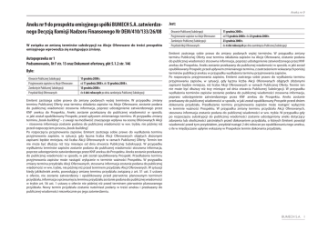 Aneks nr 9 Aneks nr 9 do prospektu emisyjnego spółki BUMECH S.A. zatwierdzonego Decyzją Komisji Nadzoru Finansowego Nr DEM/410/133/26/08 W związku ze zmianą terminów subskrypcji na Akcje Oferowane do treści prospektu emisyjnego wprowadza się następujące zmiany. Autopoprawka nr 1 Podsumowanie, lit F str. 13 oraz Dokument ofertowy, pkt 5.1.2 str. 146 Było: Otwarcie Publicznej Subskrypcji Przyjmowanie zapisów na Akcje Oferowane: Zamknięcie Publicznej Subskrypcji: Przydział Akcji Oferowanych: 11 grudnia 2008 r. od 11 grudnia 2008 r. do 15 grudnia 2008 r. 15 grudnia 2008 r. do 6 dni roboczych po dniu zamknięcia Publicznej Subskrypcji Emitent zastrzega sobie prawo do zmiany podanych wyżej terminów. W przypadku zmiany terminu Publicznej Oferty oraz terminu składania zapisów na Akcje Oferowane, zostanie podana do publicznej wiadomości stosowna informacja, poprzez udostępnienie zatwierdzonego przez KNF aneksu do Prospektu. Aneks zostanie przekazany do publicznej wiadomości w sposób, w jaki został opublikowany Prospekt, przed upływem zmienianego terminu. W przypadku zmiany terminu „book-building” – z uwagi na możliwość znaczącego wpływu na ocenę Oferowanych Akcji – stosowna informacja zostanie podana do publicznej wiadomości w ww. trybie, nie później niż przed rozpoczęciem procesu „book-building”. Po rozpoczęciu przyjmowania zapisów, Emitent zastrzega sobie prawo do wydłużenia terminu przyjmowania zapisów, w sytuacji, gdy łączna liczba Akcji Oferowanych objętych złożonymi zapisami będzie mniejsza, niż liczba Akcji Oferowanych w ramach Publicznej Oferty. Termin ten nie może być dłuższy niż trzy miesiące od dnia otwarcia Publicznej Subskrypcji. W przypadku wydłużeniu terminów zapisów zostanie podana do publicznej wiadomości stosowna informacja, poprzez udostępnienie zatwierdzonego przez KNF aneksu do Prospektu. Aneks zostanie przekazany do publicznej wiadomości w sposób, w jaki został opublikowany Prospekt. Przedłużenie terminu przyjmowania zapisów może nastąpić wyłącznie w terminie ważności Prospektu. W przypadku zmiany terminu przydziału Akcji Oferowanych, stosowna informacja zostanie podana do publicznej wiadomości w ww. trybie, nie później niż przed terminem przydziału Akcji Oferowanych. W sytuacji kiedy jakikolwiek aneks, powodujący zmianę terminu przydziału związaną z art. 51 ust. 5 ustawy o ofercie, nie zostanie zatwierdzony i opublikowany przed pierwotnie planowanym terminem przydziału, informacja o przesunięciu terminu przydziału zostanie podana do publicznej wiadomości w trybie art. 56 ust. 1 ustawy o ofercie nie później niż przed terminem pierwotnie planowanego przydziału. Nowy termin przydziału zostanie natomiast podany w treści aneksu i przekazany do publicznej wiadomości niezwłocznie po jego zatwierdzeniu. Jest: Otwarcie Publicznej Subskrypcji Przyjmowanie zapisów na Akcje Oferowane: Zamknięcie Publicznej Subskrypcji: Przydział Akcji Oferowanych: 11 grudnia 2008 r. od 11 grudnia 2008 r. do 23 grudnia 2008 r. 23 grudnia 2008 r. do 6 dni roboczych po dniu zamknięcia Publicznej Subskrypcji Emitent zastrzega sobie prawo do zmiany podanych wyżej terminów. W przypadku zmiany terminu Publicznej Oferty oraz terminu składania zapisów na Akcje Oferowane, zostanie podana do publicznej wiadomości stosowna informacja, poprzez udostępnienie zatwierdzonego przez KNF aneksu do Prospektu. Aneks zostanie przekazany do publicznej wiadomości w sposób, w jaki został opublikowany Prospekt, przed upływem zmienianego terminu, z zastrzeżeniem wskazanych poniżej terminów publikacji aneksu w przypadku wydłużenia terminu przyjmowania zapisów. Po rozpoczęciu przyjmowania zapisów, Emitent zastrzega sobie prawo do wydłużenia terminu przyjmowania zapisów, w sytuacji, gdy łączna liczba Akcji Oferowanych objętych złożonymi zapisami będzie mniejsza, niż liczba Akcji Oferowanych w ramach Publicznej Oferty. Termin ten nie może być dłuższy niż trzy miesiące od dnia otwarcia Publicznej Subskrypcji. W przypadku wydłużeniu terminów zapisów zostanie podana do publicznej wiadomości stosowna informacja, poprzez udostępnienie zatwierdzonego przez KNF aneksu do Prospektu. Aneks zostanie przekazany do publicznej wiadomości w sposób, w jaki został opublikowany Prospekt przed dniem dokonania przydziału. Przedłużenie terminu przyjmowania zapisów może nastąpić wyłącznie w terminie ważności Prospektu. W przypadku zmiany terminu przydziału Akcji Oferowanych, stosowna informacja zostanie podana do publicznej wiadomości w ww. trybie. W przypadku gdy po rozpoczęciu subskrypcji do publicznej wiadomości zostanie udostępniony aneks dotyczący zdarzenia lub okoliczności zaistniałych przed dokonaniem przydziału, o których Emitent powziął wiadomość przed tym przydziałem, przydział nastąpi 2 dni robocze po opublikowaniu tego aneksu, o ile w międzyczasie upłynie wskazany w Prospekcie termin dokonania przydziału. BUMECH S.A.